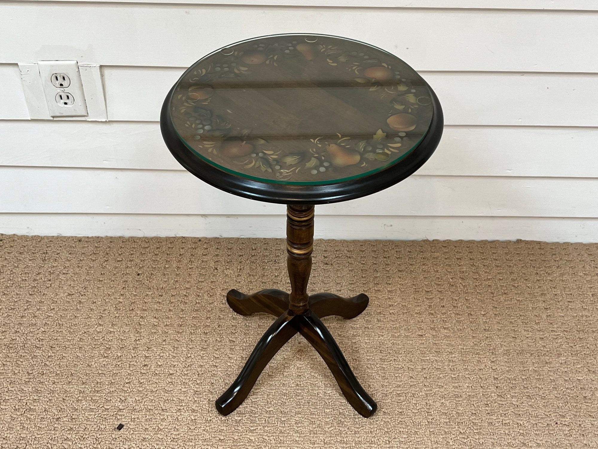 15” diameter, 22” height. Top will tilt if you take off the glass.