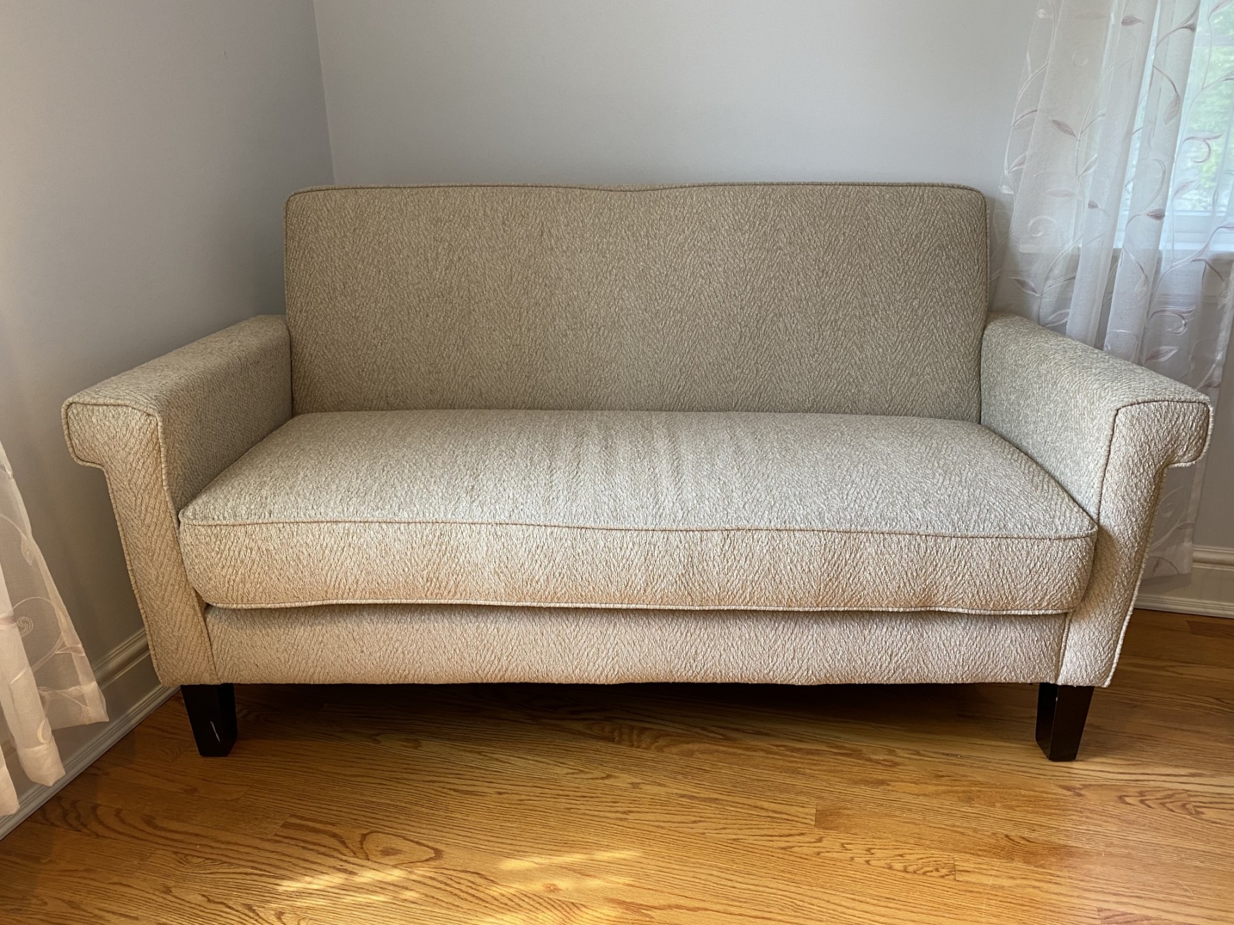 This cozy loveseat has a neutral colored fabric and clean lines that would be great in any room! Very nice condition with minor visible imperfections, see all photos for details.