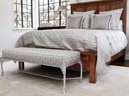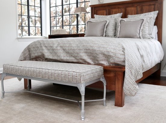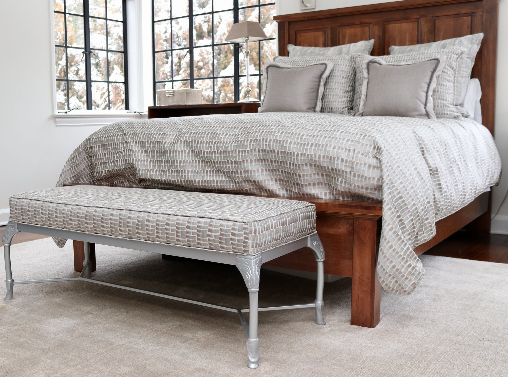 Paired with an elegant upholstered bench, featuring a sleek painted metal base with delicate carved details and a cushioned seat wrapped in a neutral, grey and tobacco brush stroked fabric. This duo perfectly blends rustic charm with a hint of modern sophistication for a cozy, inviting retreat.
