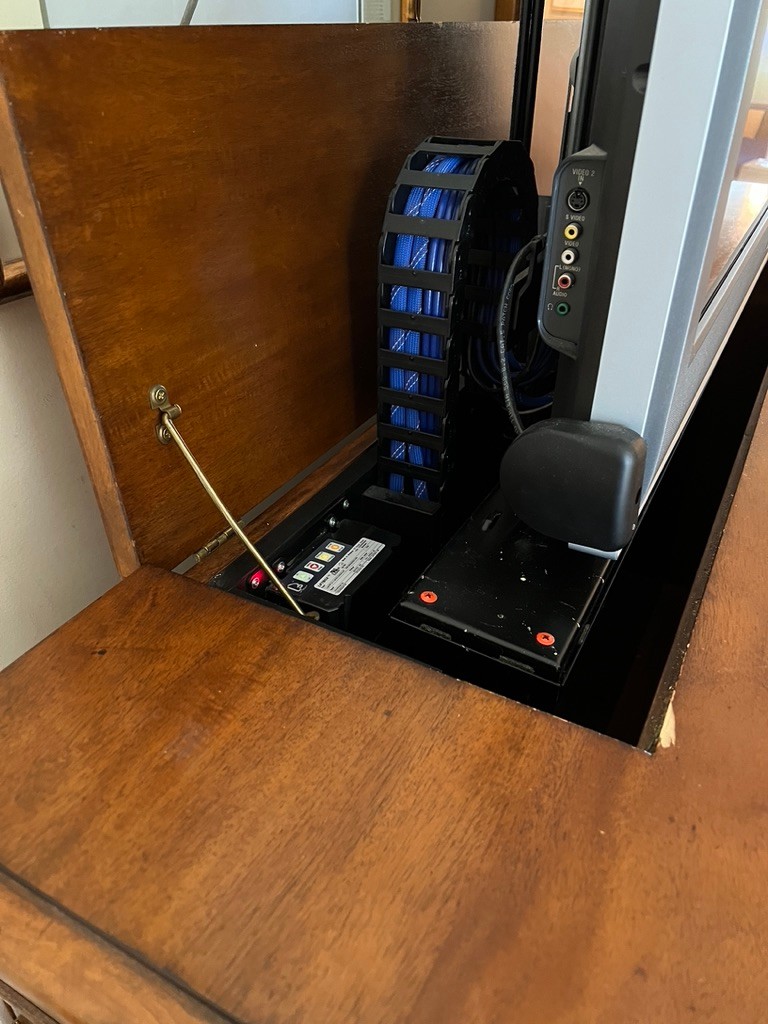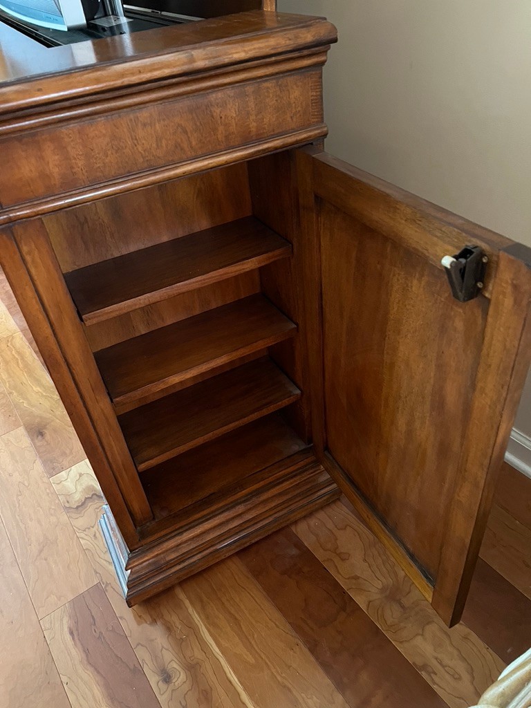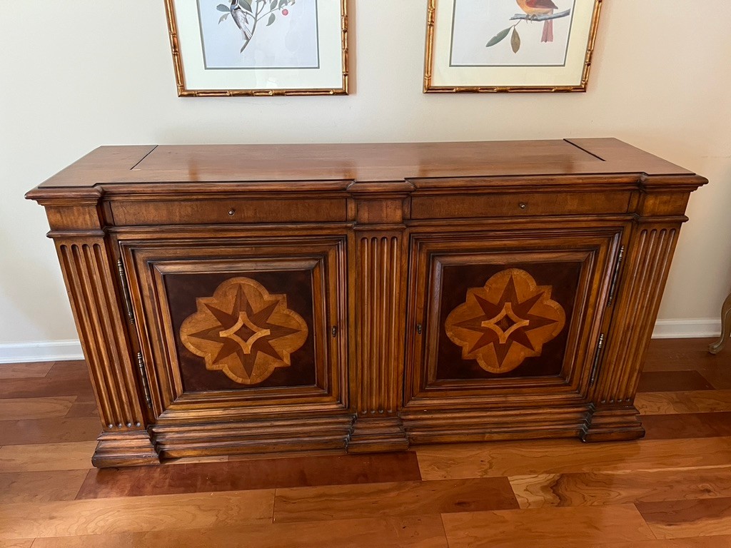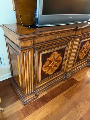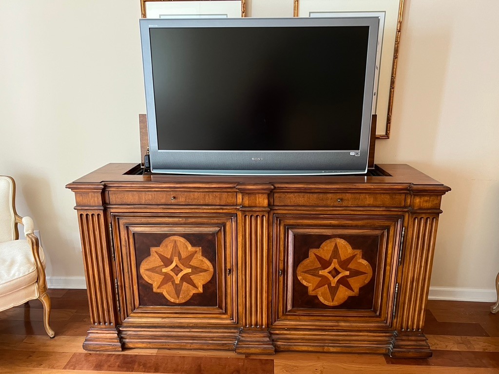 SONY BRAVIA retractable tv in Ethan Allen Lombard Marquetry cabinet, in very nice condition, with side cabinets with shelving for audio, video, remotes,