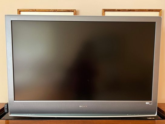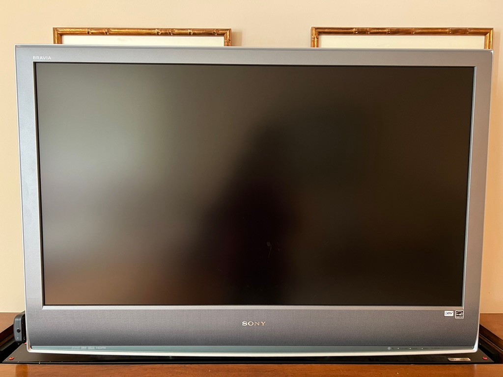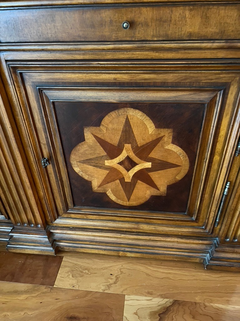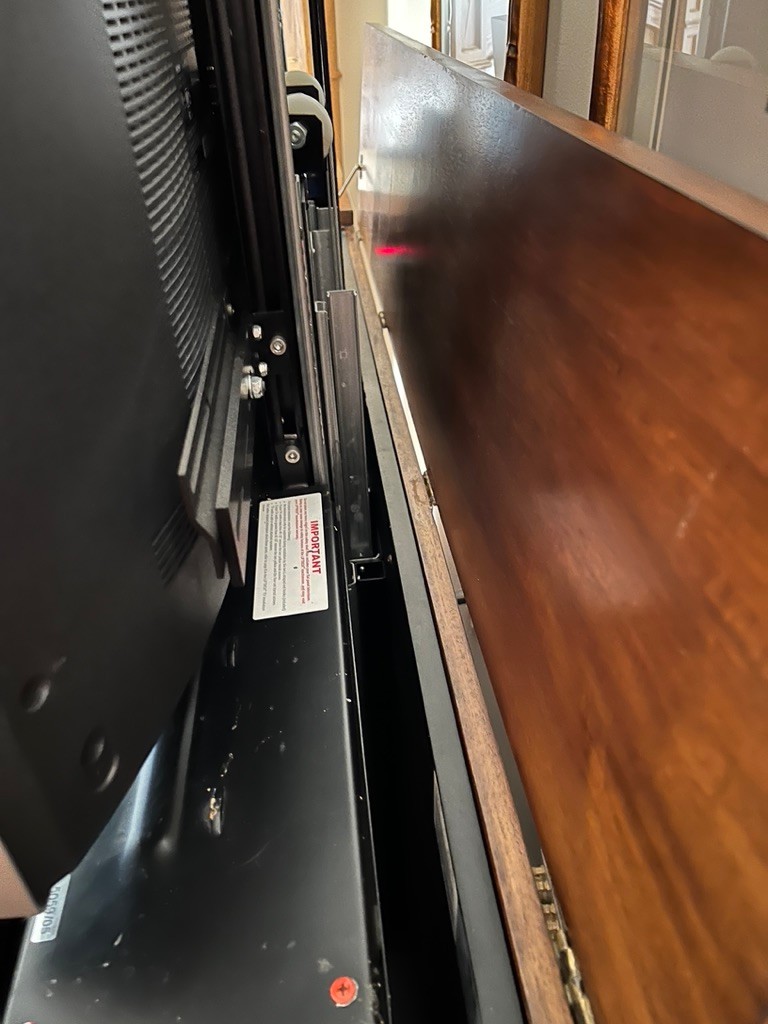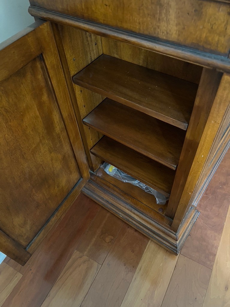 SONY BRAVIA retractable tv in Ethan Allen Lombard Marquetry cabinet, in very nice condition, with side cabinets with shelving for audio, video, remotes,