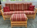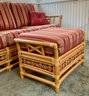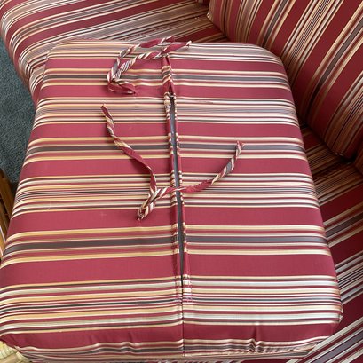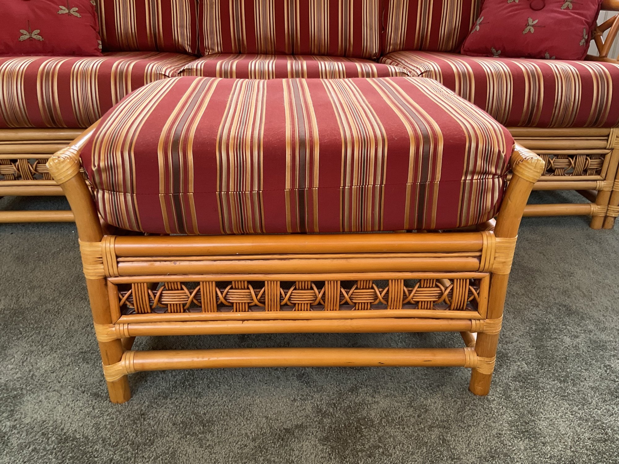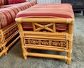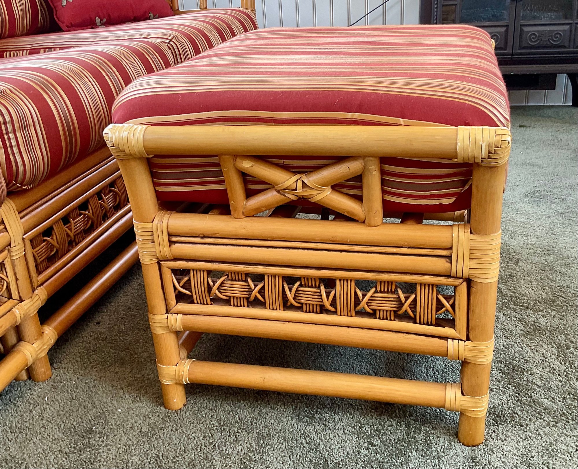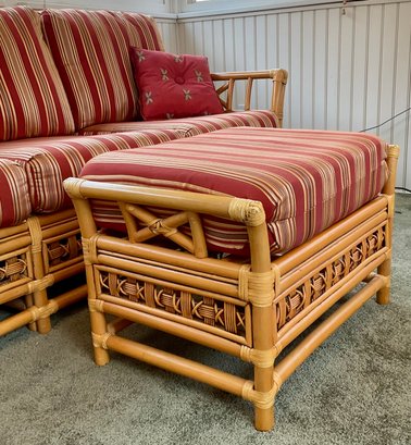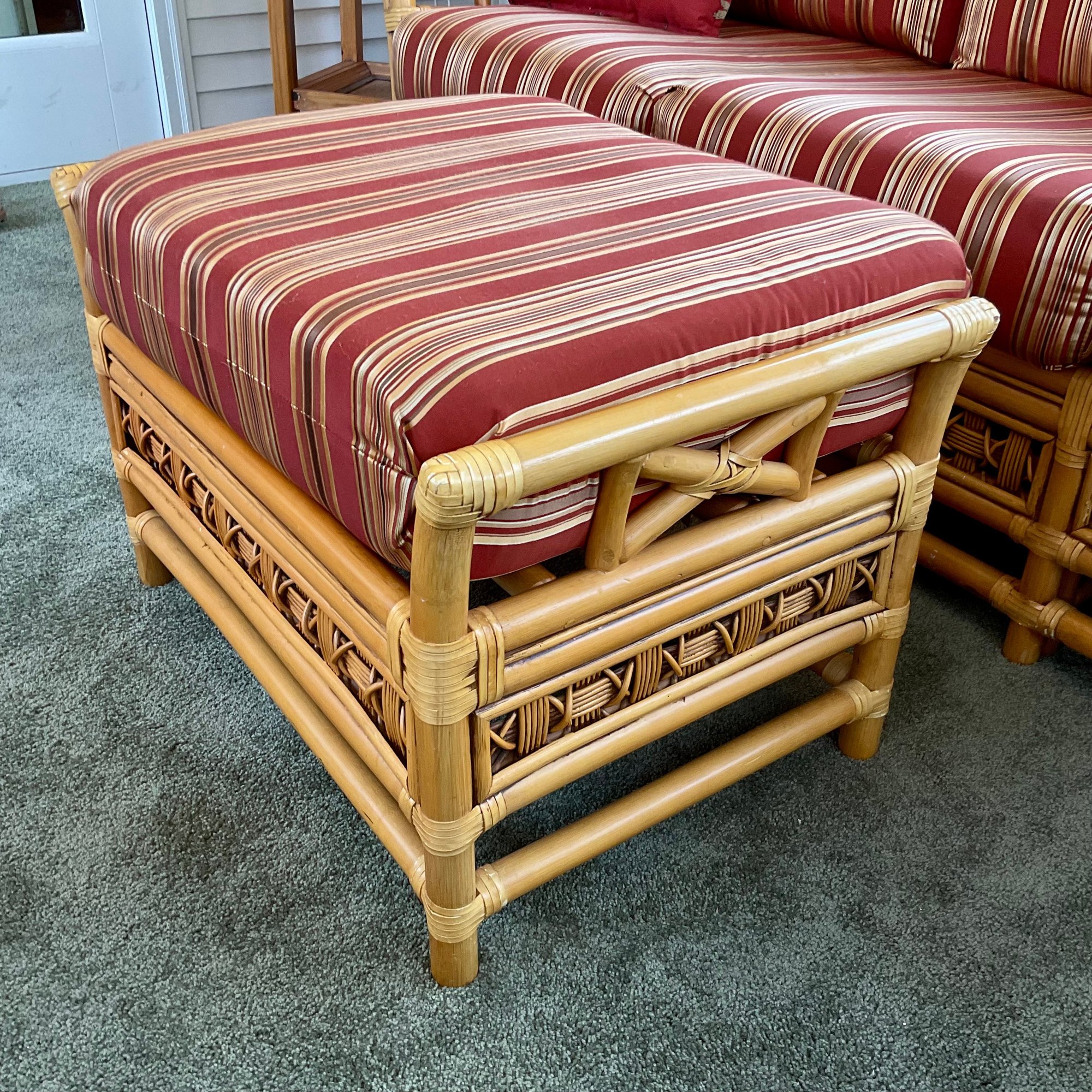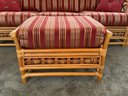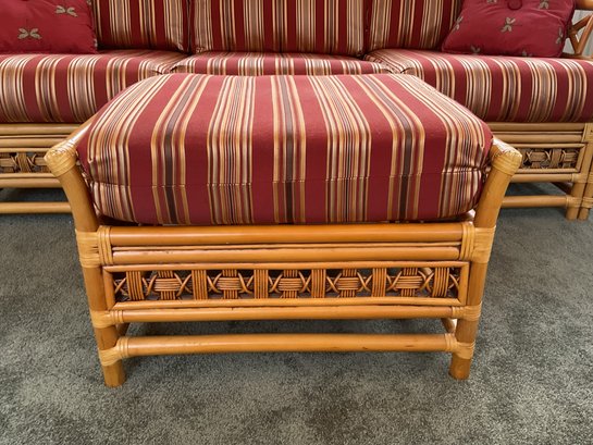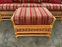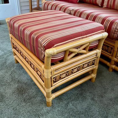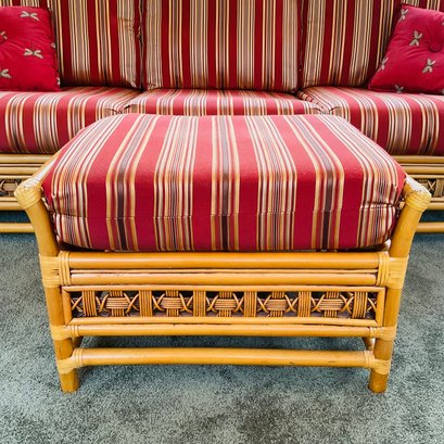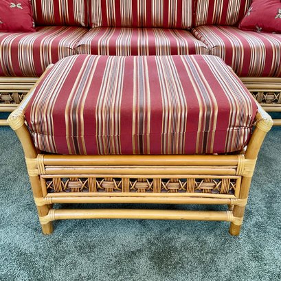 The ottoman includes a thick, plush cushion upholstered in a vibrant red and tan multi-stripe fabric, designed for both comfort and visual appeal. This item matches other South Sea pieces featured in this auction.