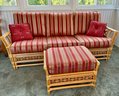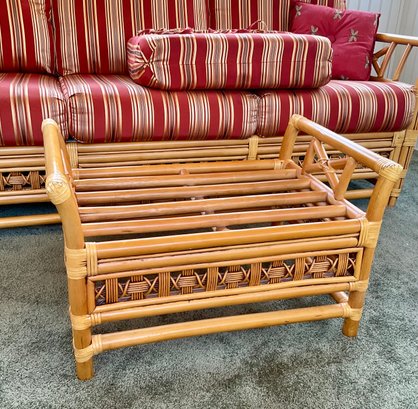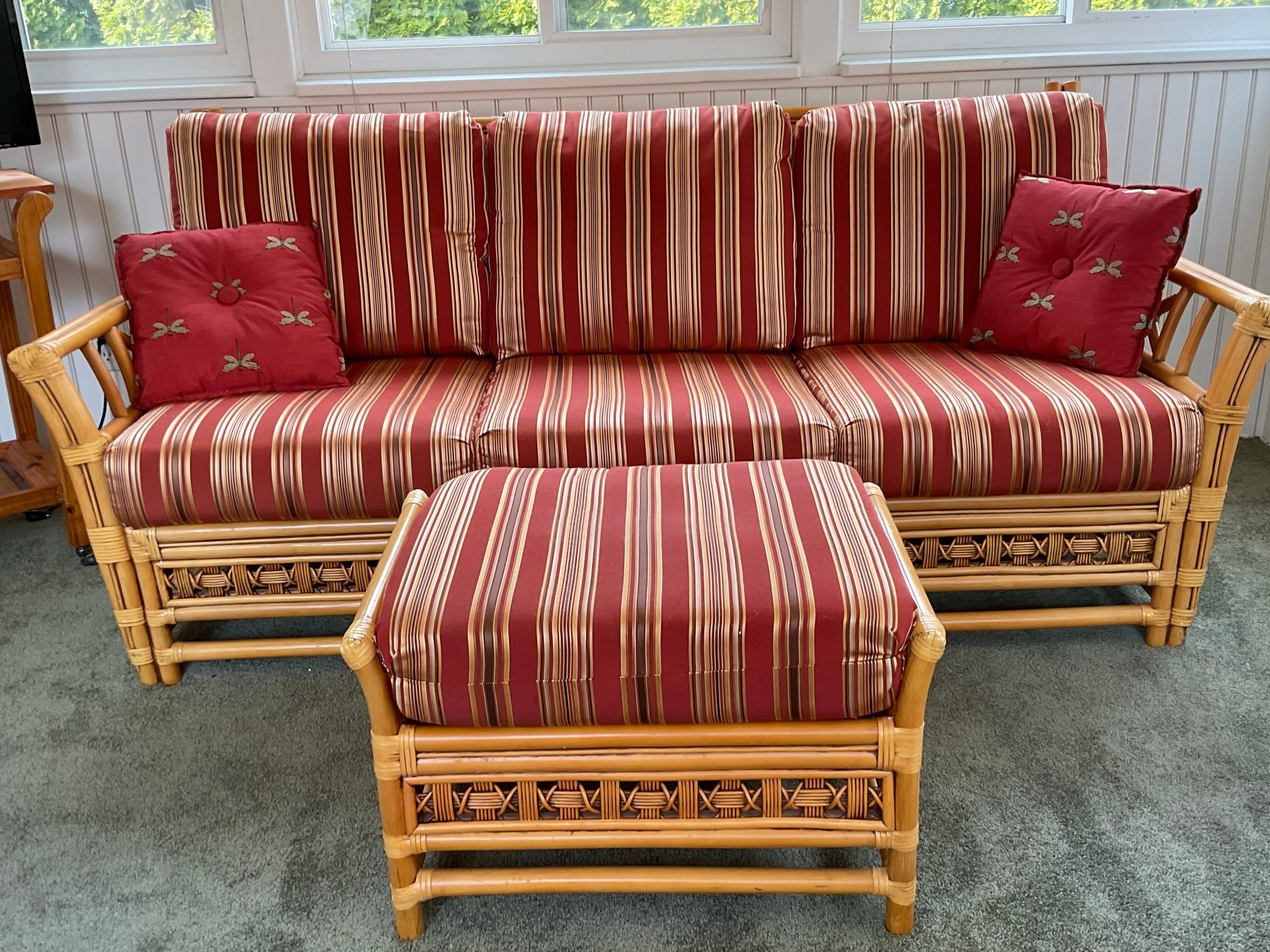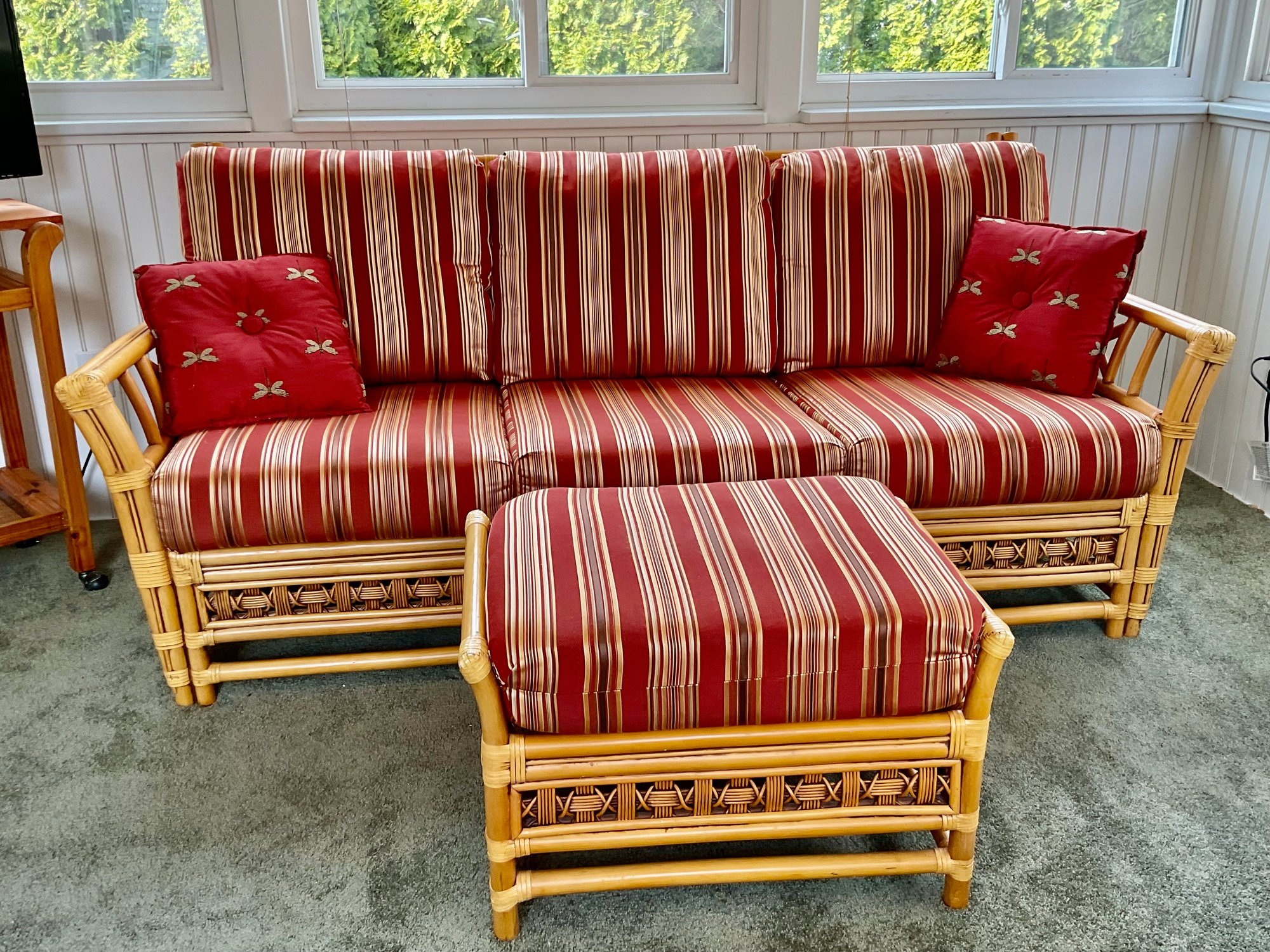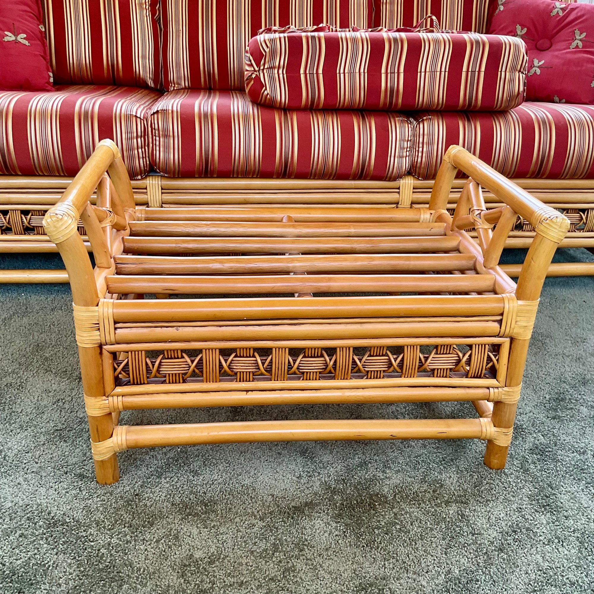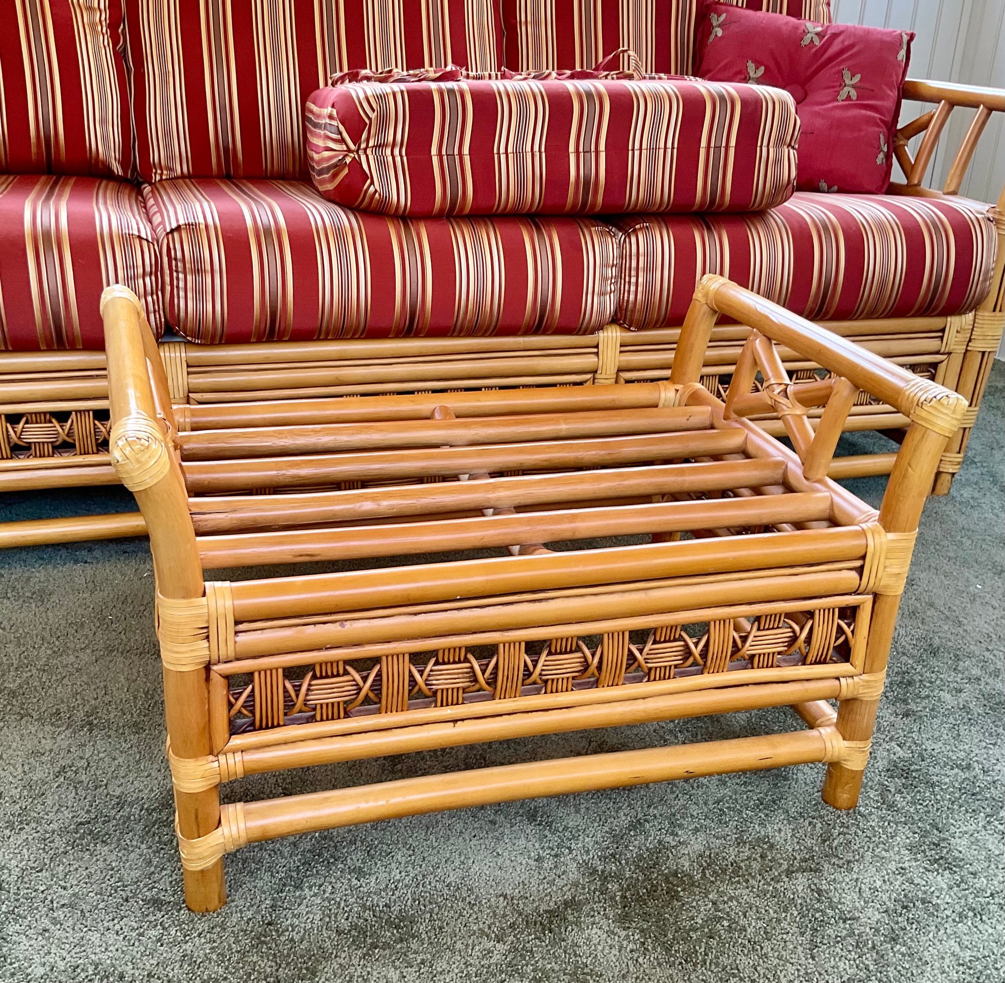 The ottoman includes a thick, plush cushion upholstered in a vibrant red and tan multi-stripe fabric, designed for both comfort and visual appeal. This item matches other South Sea pieces featured in this auction.