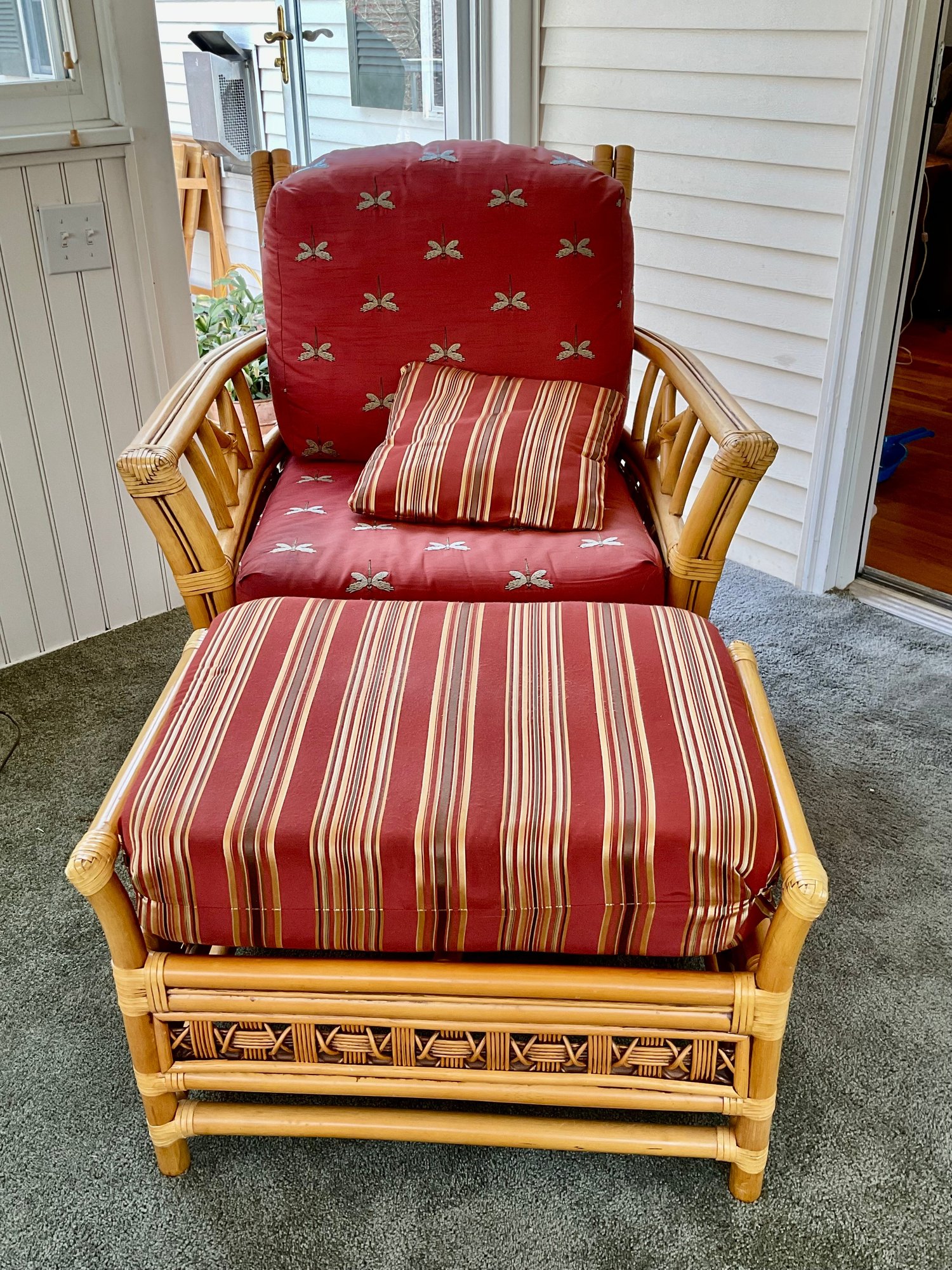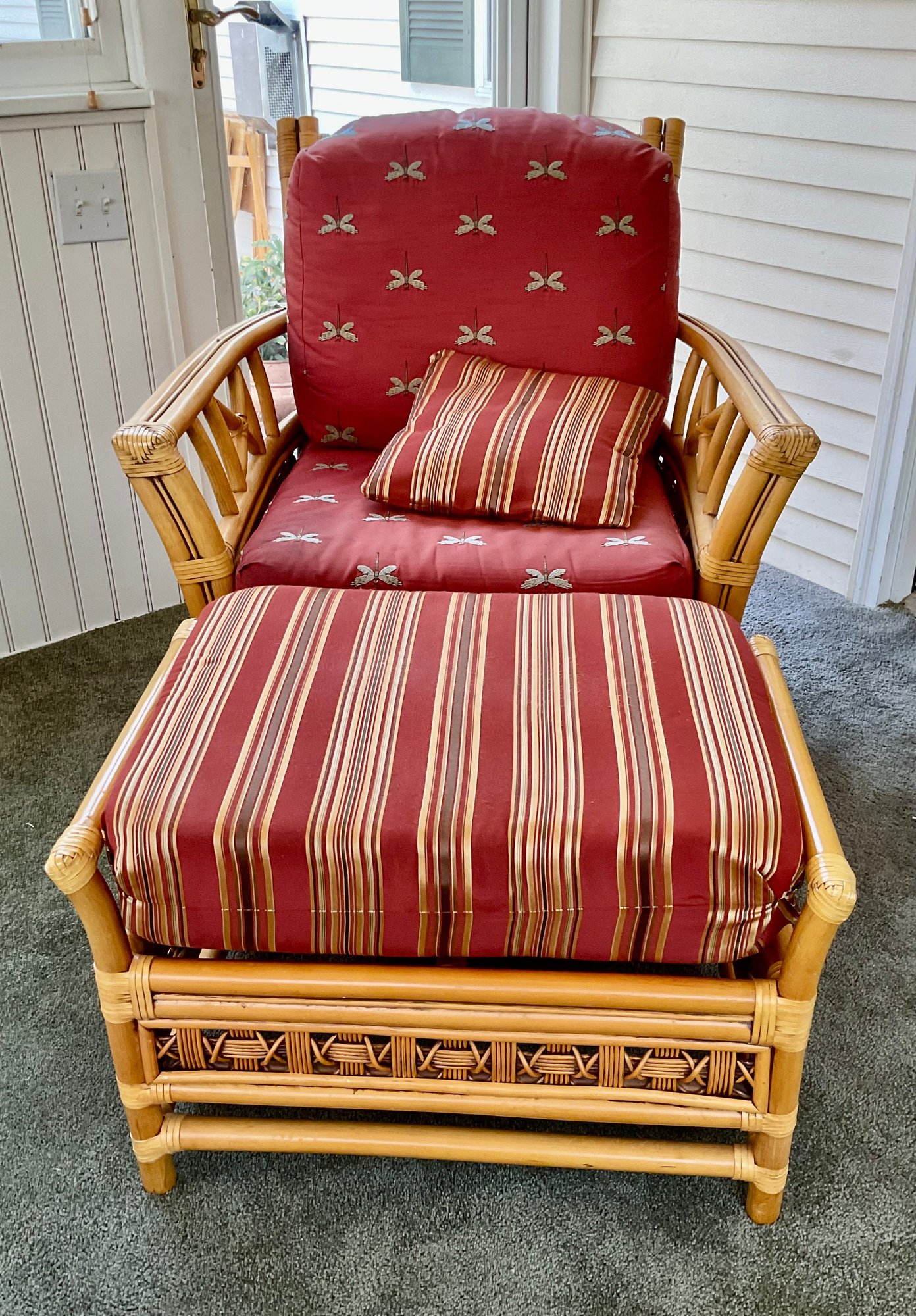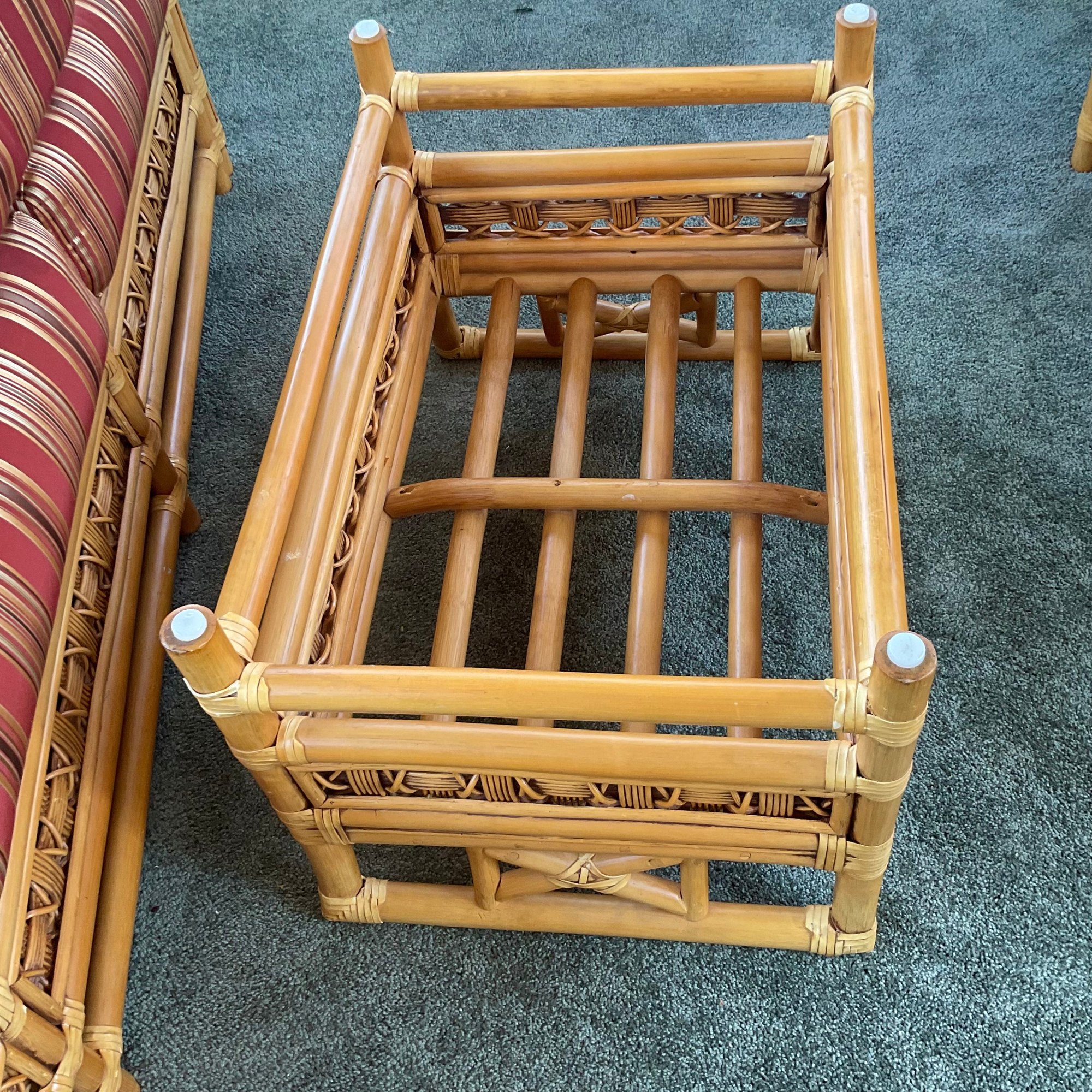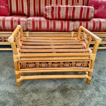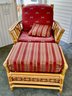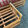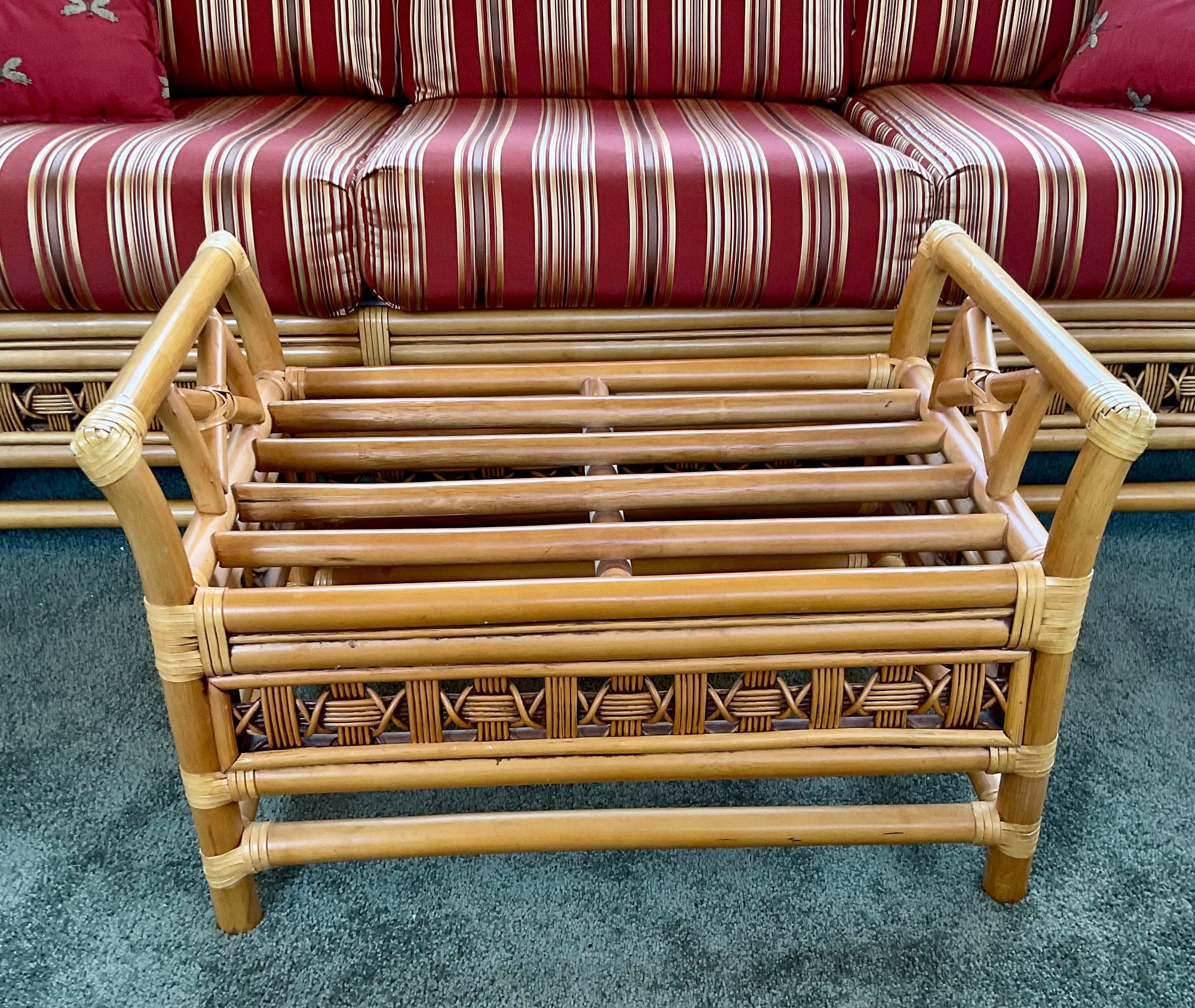 The ottoman includes a thick, plush cushion upholstered in a vibrant red and tan multi-stripe fabric, designed for both comfort and visual appeal. This item matches other South Sea pieces featured in this auction.