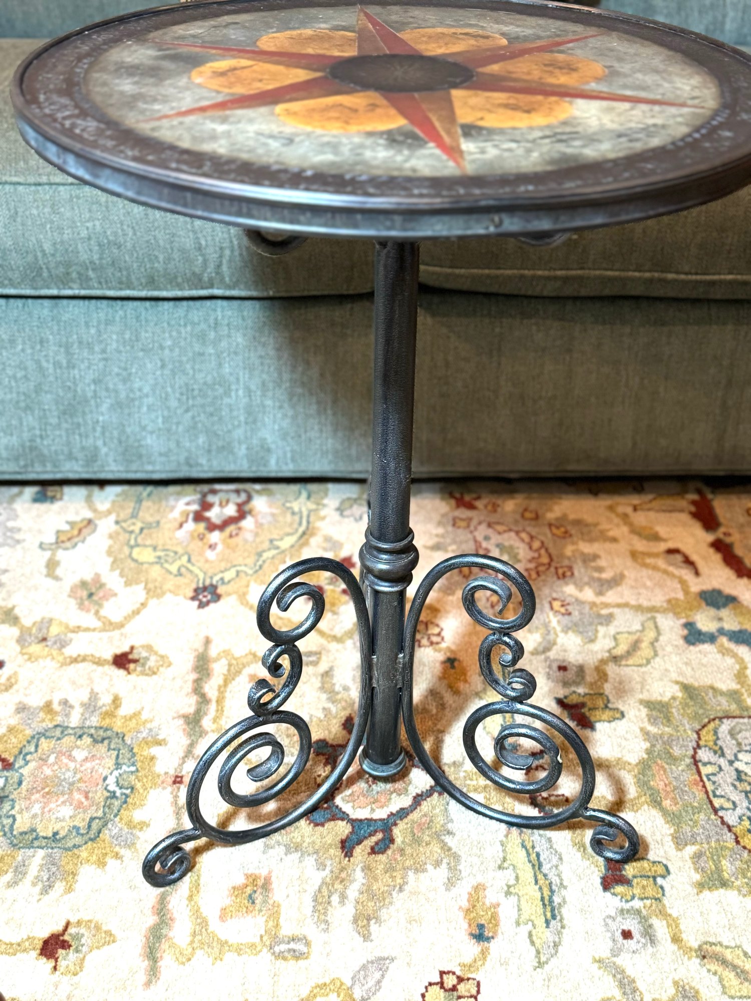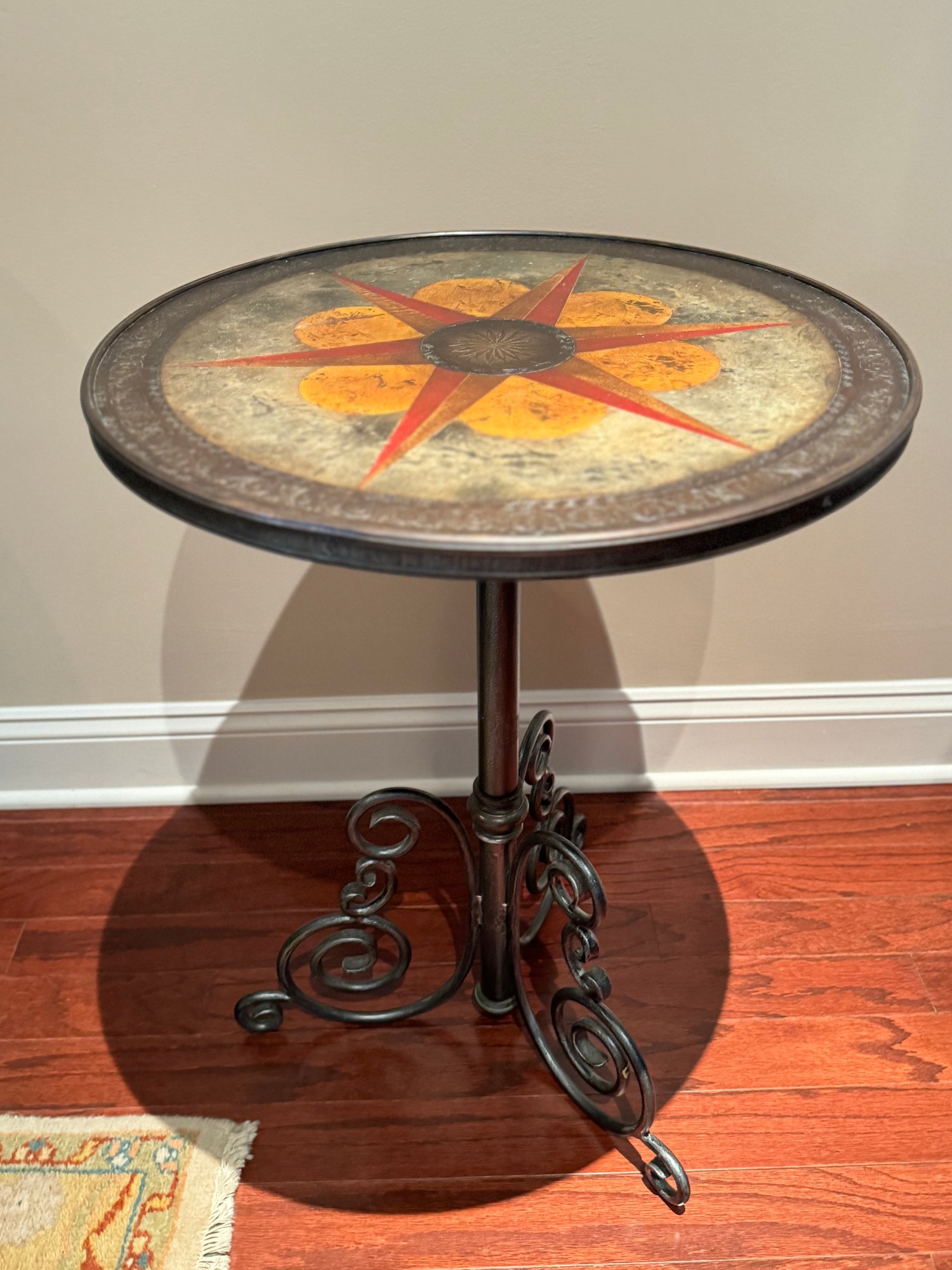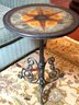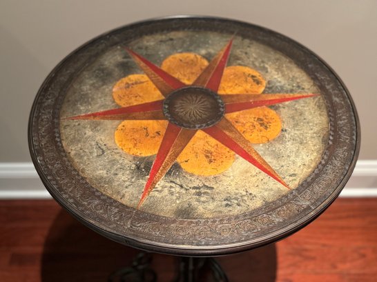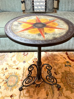Adorable Spanish style metal side table with scroll styled base. Top has a multi color inlay design with star pattern in a faux leather look. Condition overall good with some minor top nics see photos. Size 27.25 H x 21 Diameter