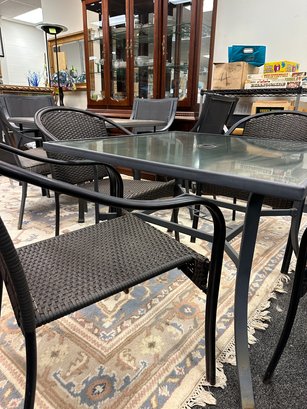 Table has hole for patio umbrella table 38" sq x 27 chairs a-a 24 x 33.