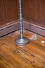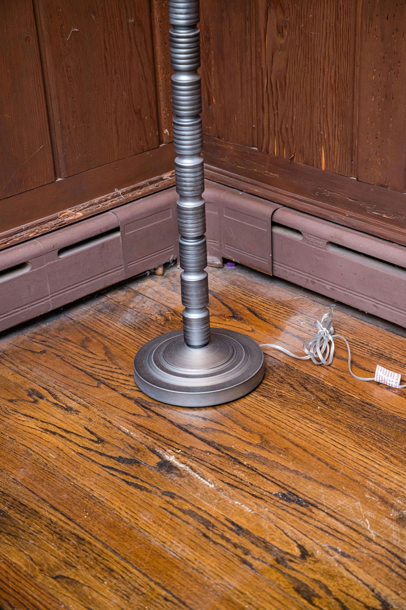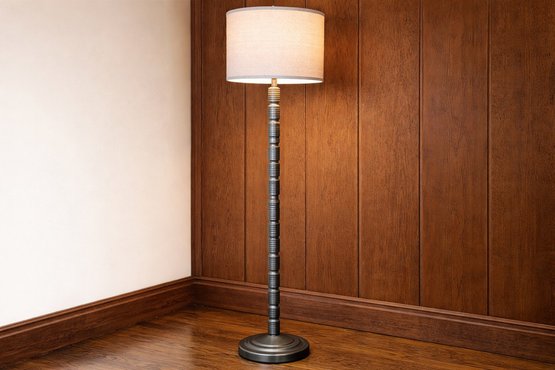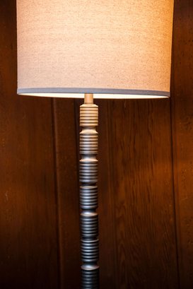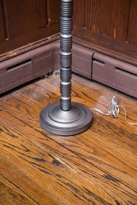 This is a unique pole lamp with stacked geometric ribbed sections, tested and working.