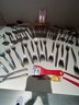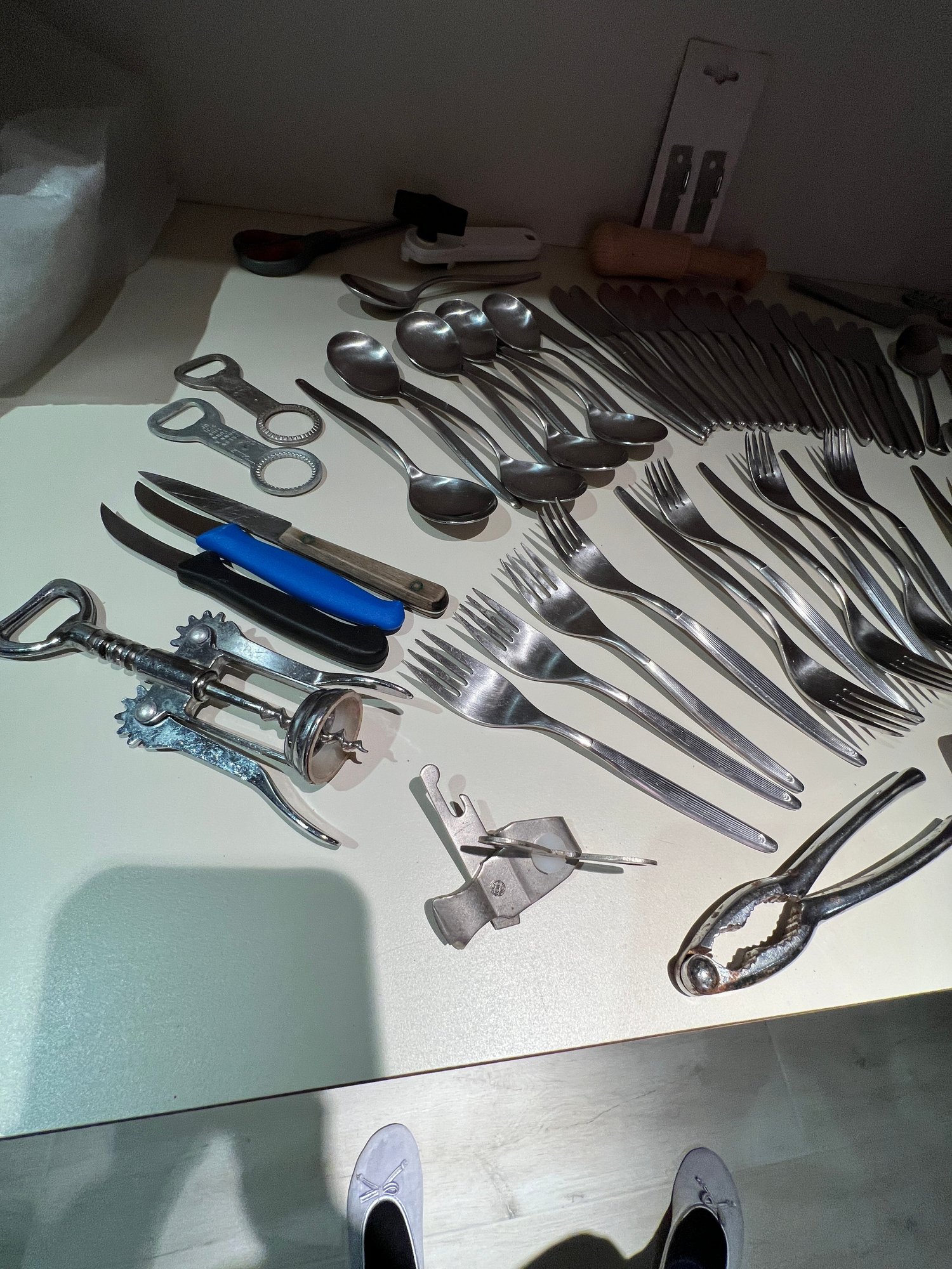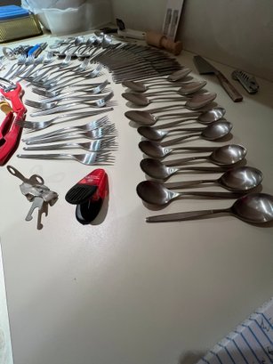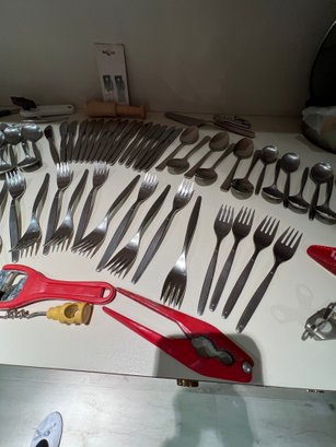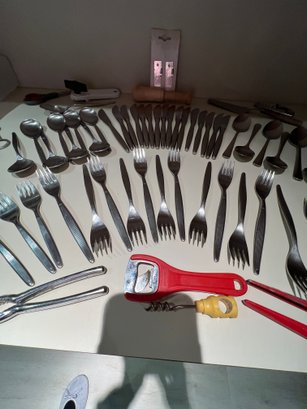 stainless flatware, serv for 8+, misc gadgets, openers, corkscrew, new blades for can opener,