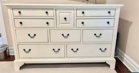 This dresser features 10 drawers in a variety of sizes. The top two drawers are felt lined, one with a removable jewelry tray, one of the bottom drawers features a cedar lining. Multi step antique white finish is hand applied. All dovetailed drawers are sanded and sealed.
