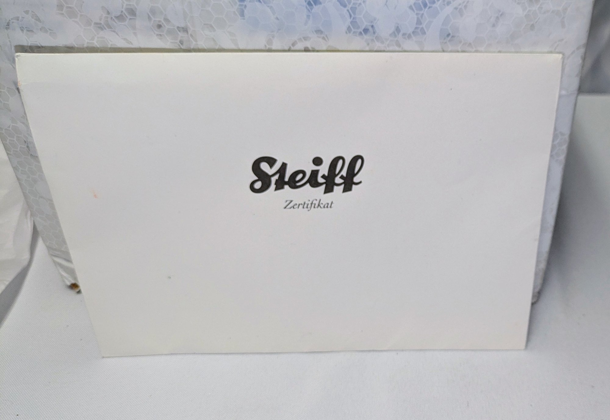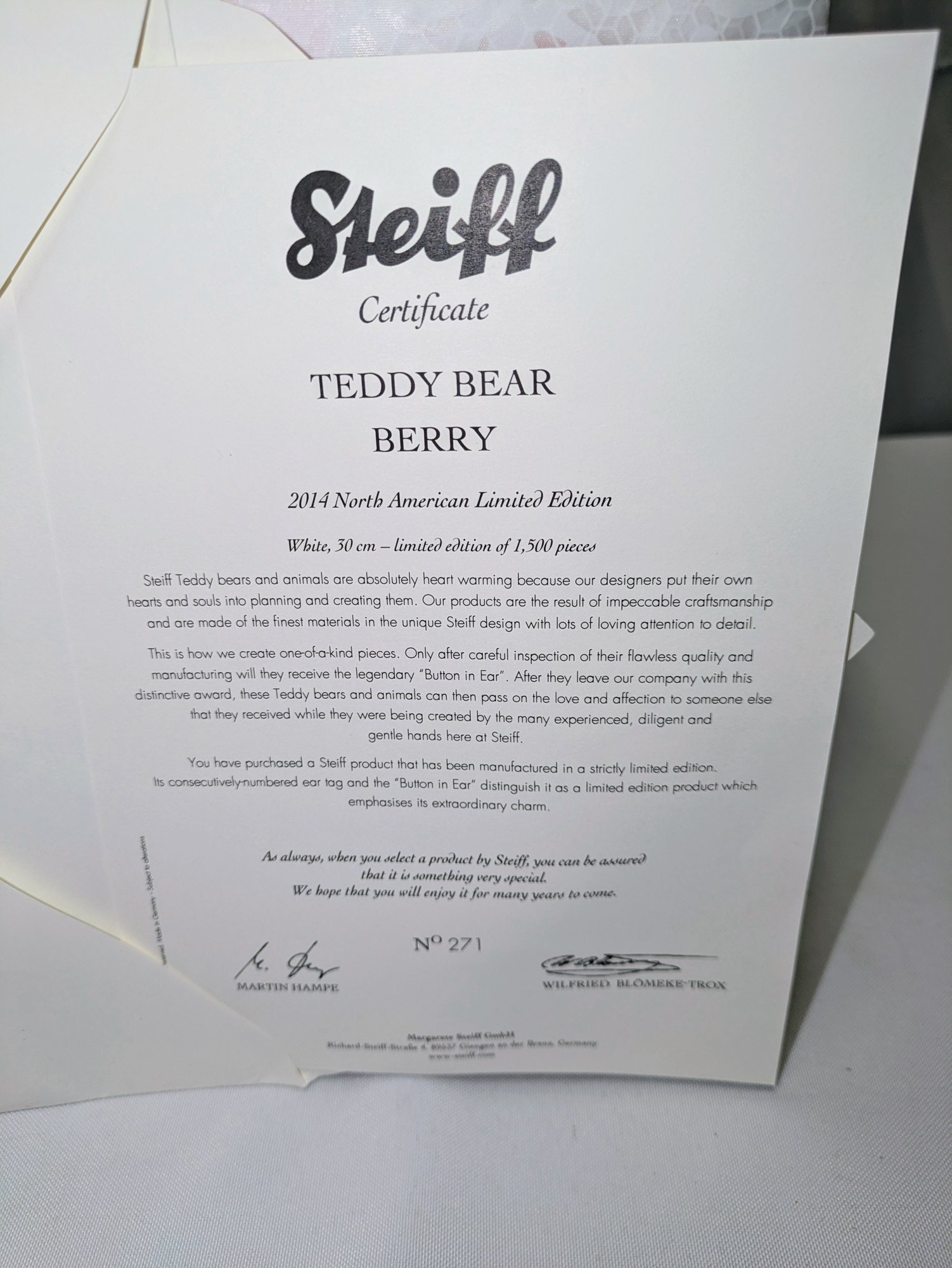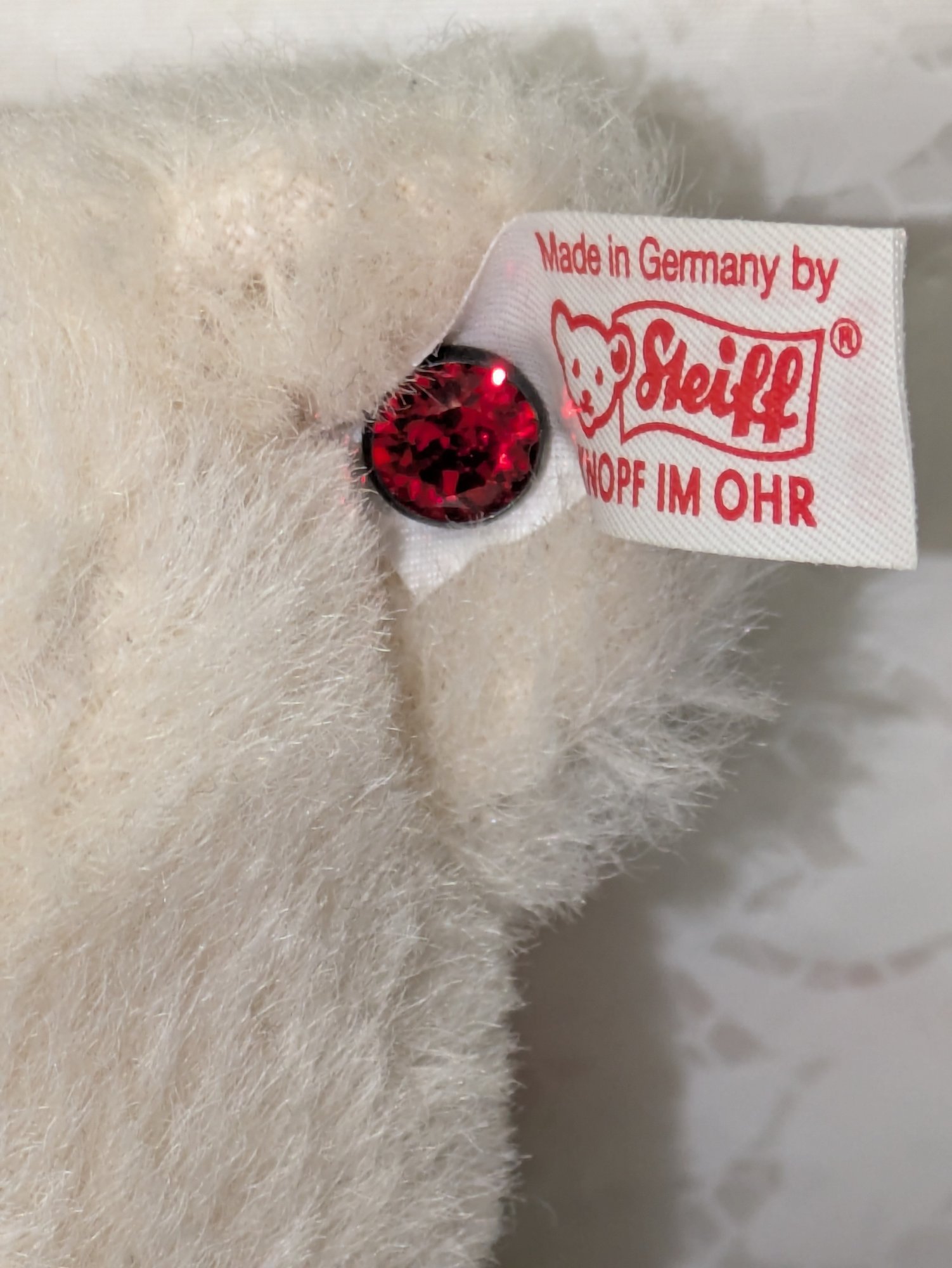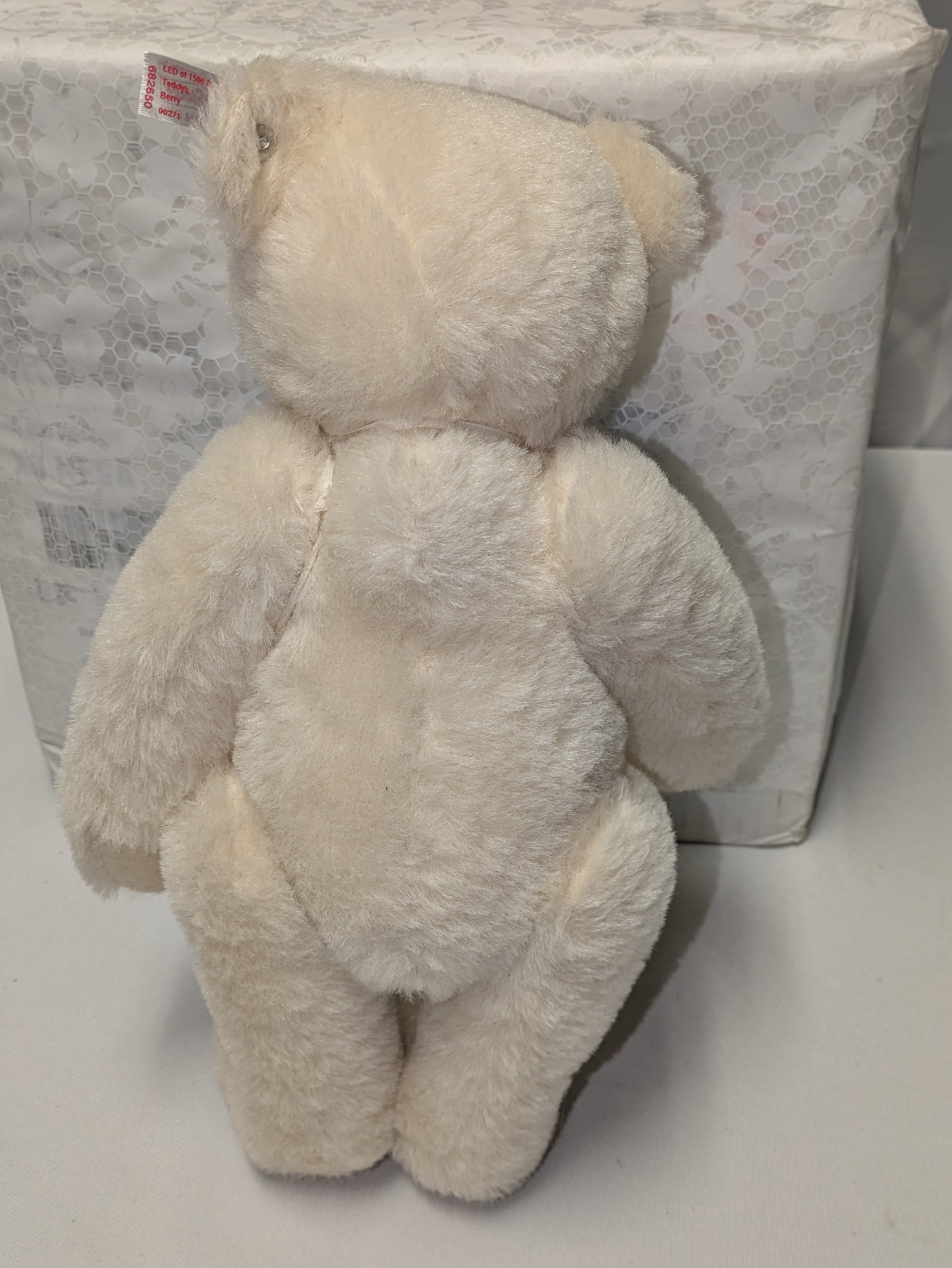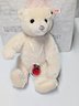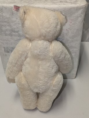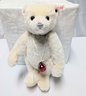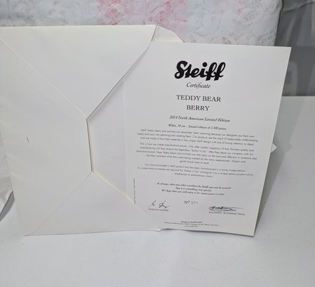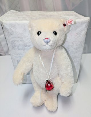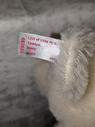 Steiff Limited Edition Berry Teddy Bear with Swarovski Crystal Accents & COA - Collectors Item. Made from the finest snow-white alpaca material. The bear is a five-way jointed teddy and measures 12 inches tall. It is adorned with Swarovski elements, including a ruby-red necklace and a deep-red Xillion crystal "Button in Ear". It was a 2013 North American exclusive, limited to 1,500 pieces.