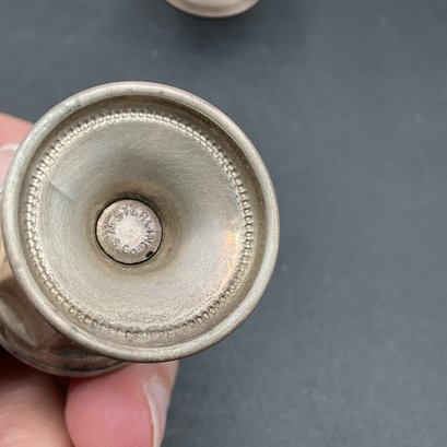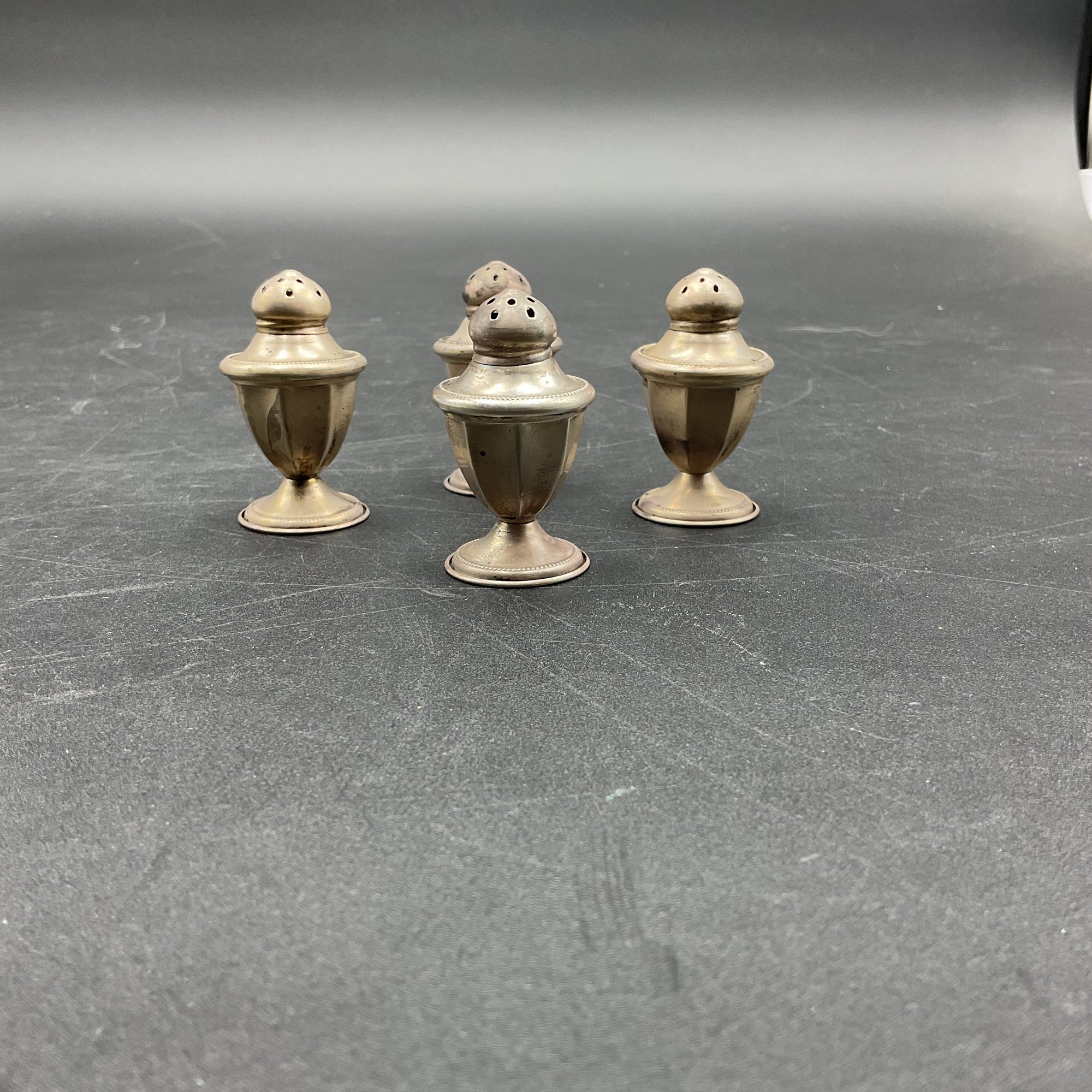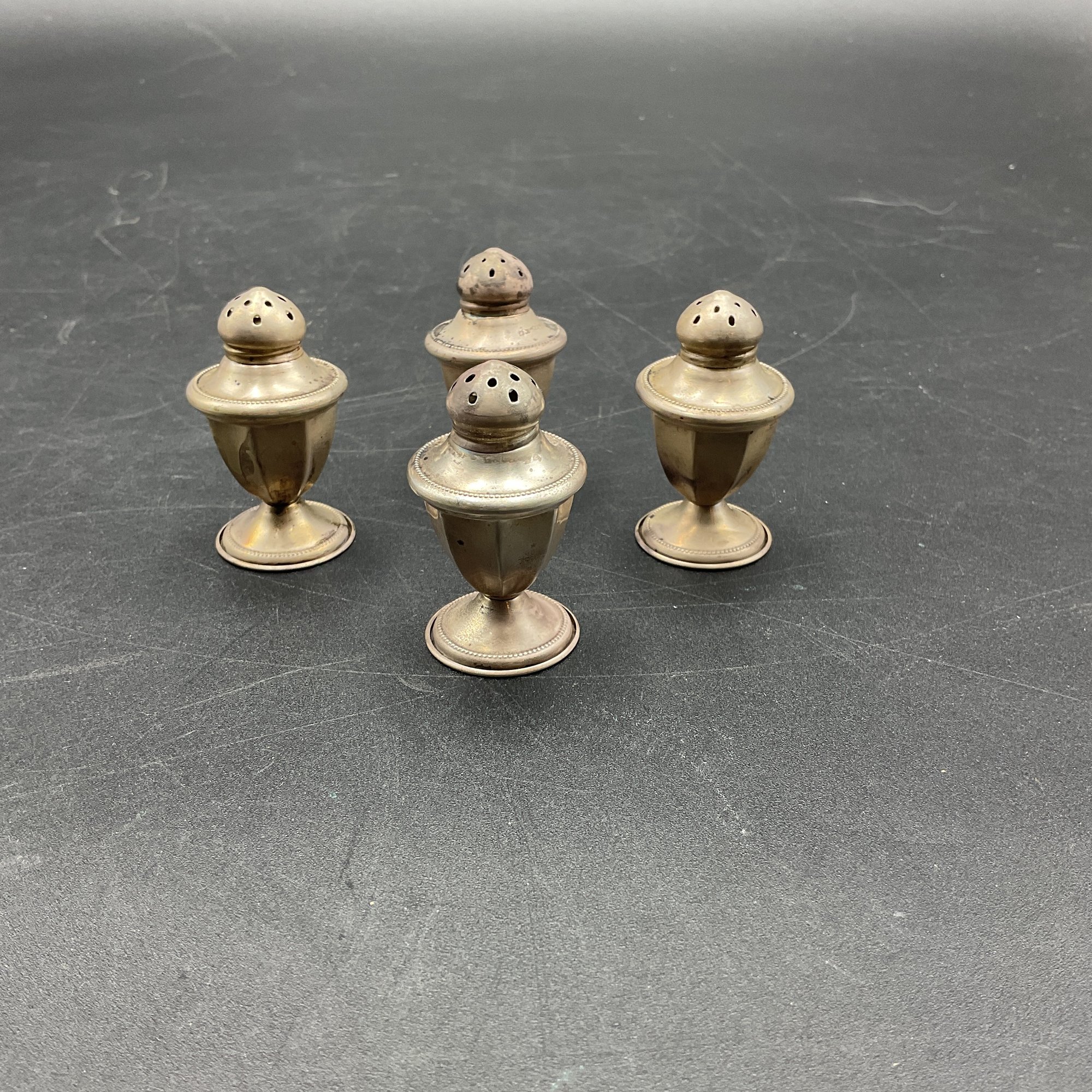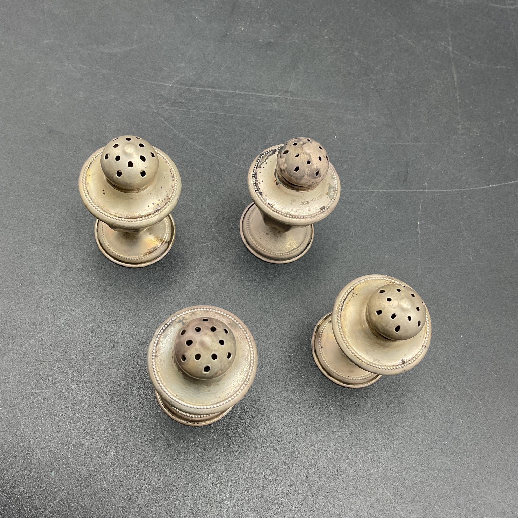 Set of four small silver salt/pepper shakers. Marked "NS Co. Sterling", from the National Silver Company, likely early to mid-century vintage. Tops remove to fill and all appear to be in great condition aside from tarnish. A little polishing and these will be in perfect condition. Non-weighted, 1.13oz.