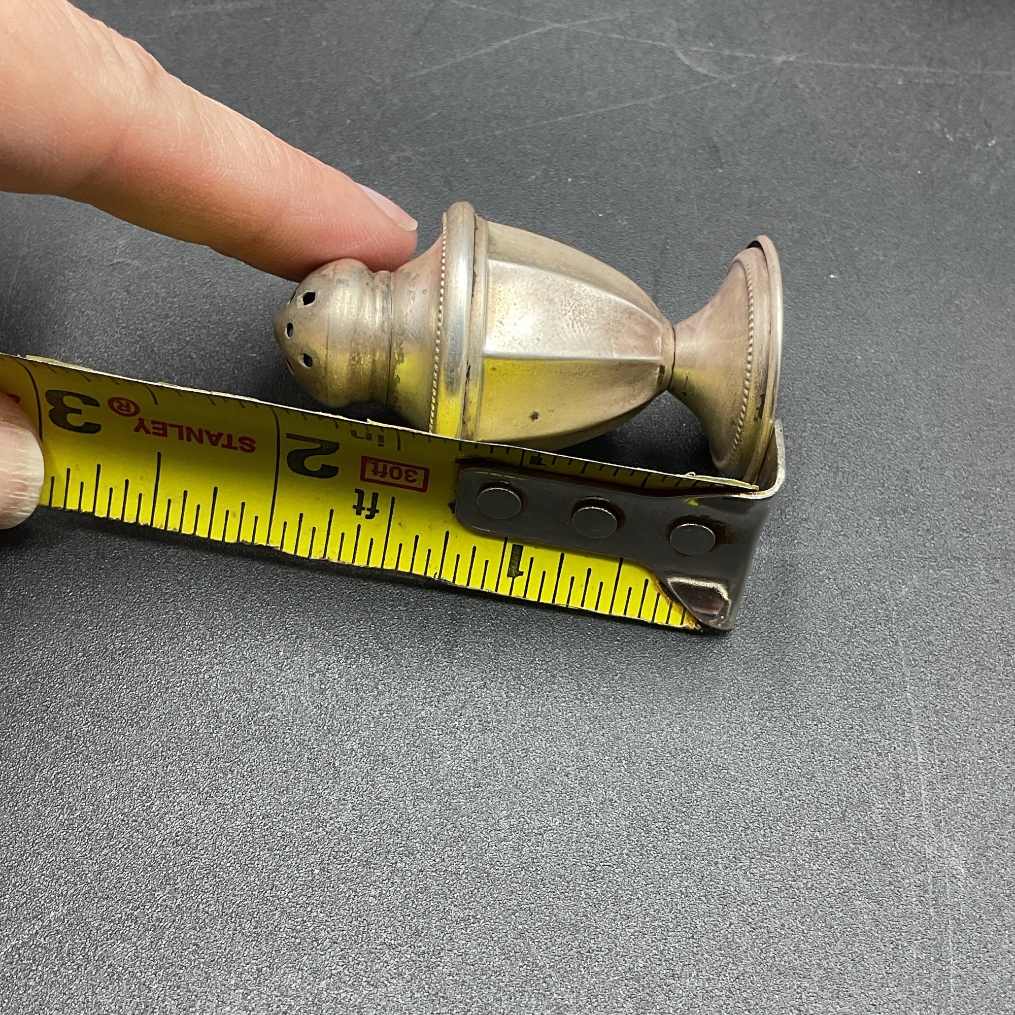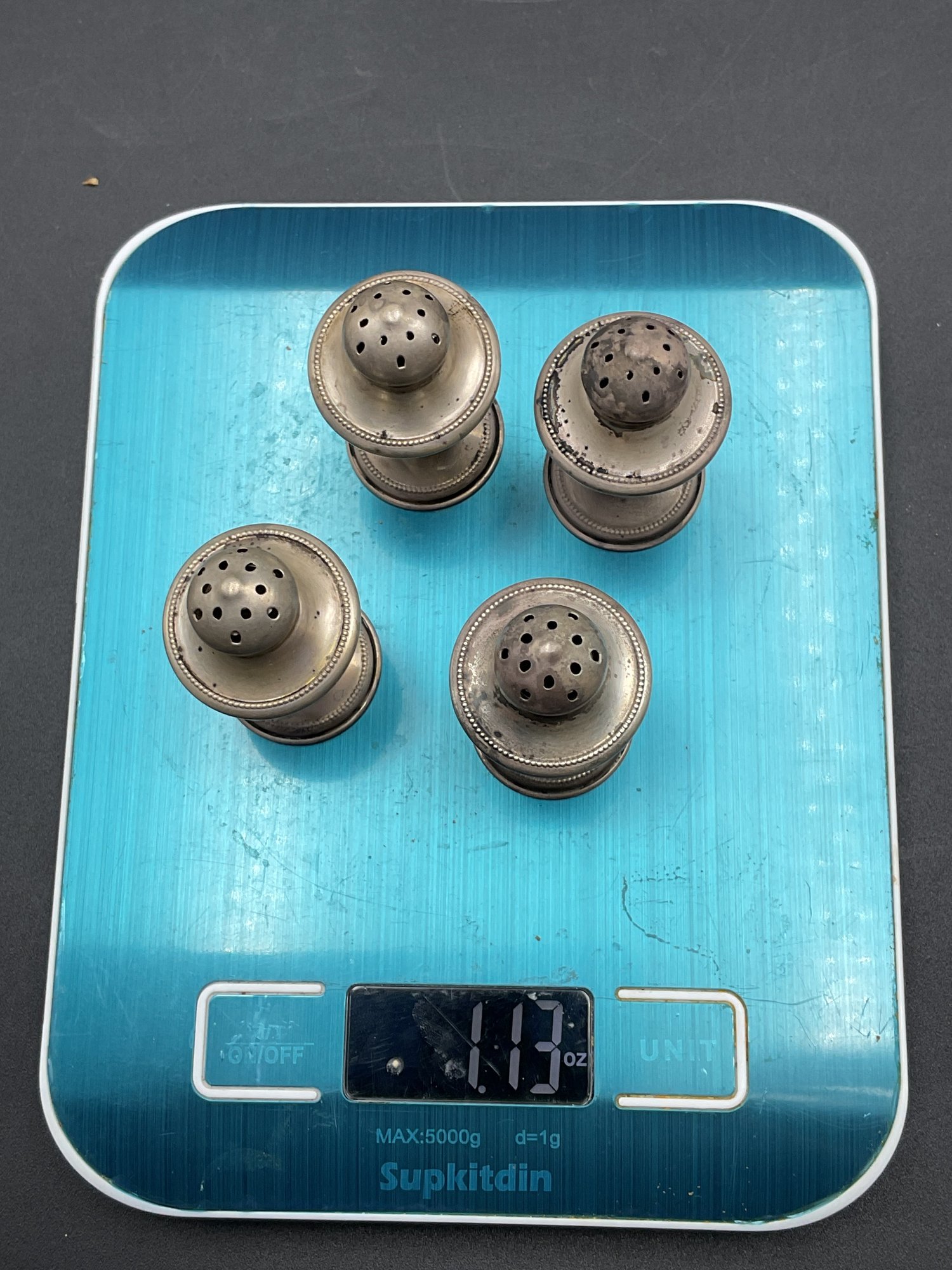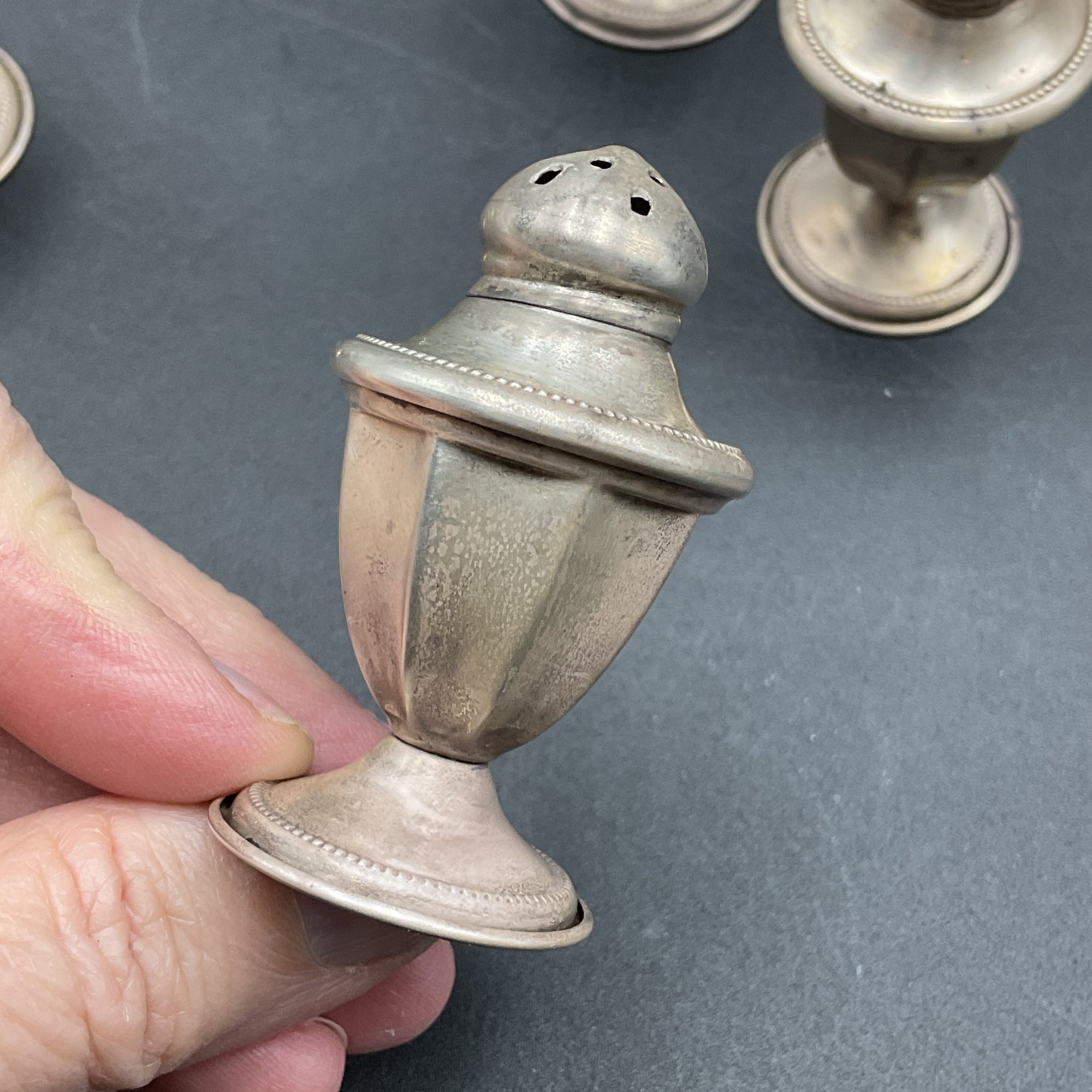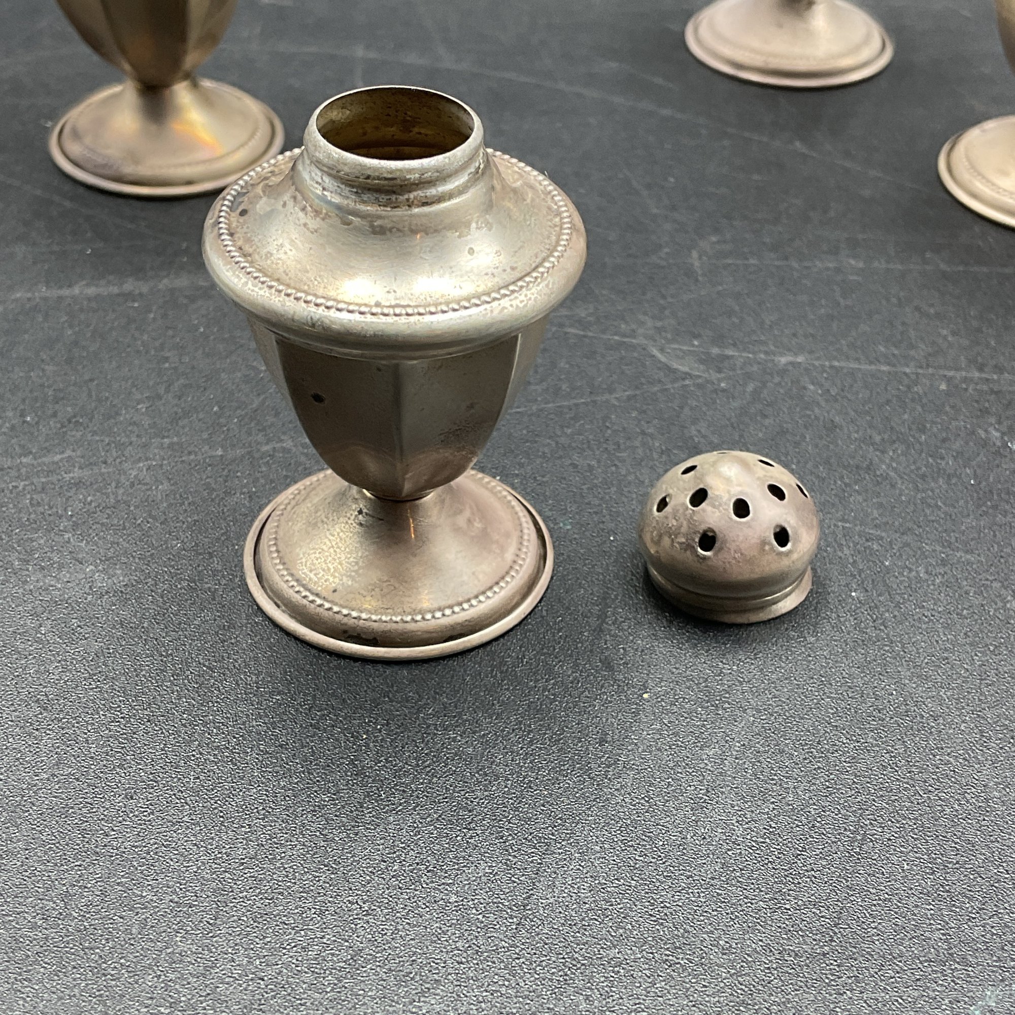 Set of four small silver salt/pepper shakers. Marked "NS Co. Sterling", from the National Silver Company, likely early to mid-century vintage. Tops remove to fill and all appear to be in great condition aside from tarnish. A little polishing and these will be in perfect condition. Non-weighted, 1.13oz.