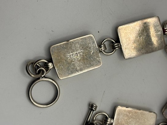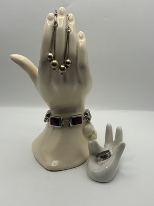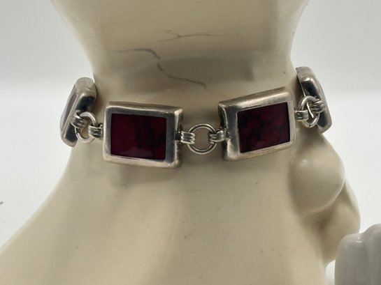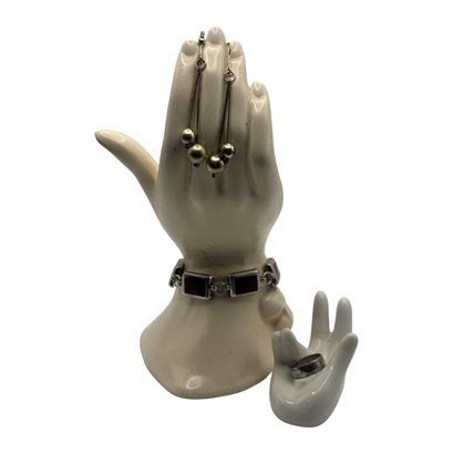 A coordinated sterling silver set featuring a link bracelet with rectangular deep red garnet-tone stones in sleek bezel settings. Paired with long drop earrings finished with polished silver bead accents and a classic sterling silver band ring. A versatile collection with modern lines and rich contrast.