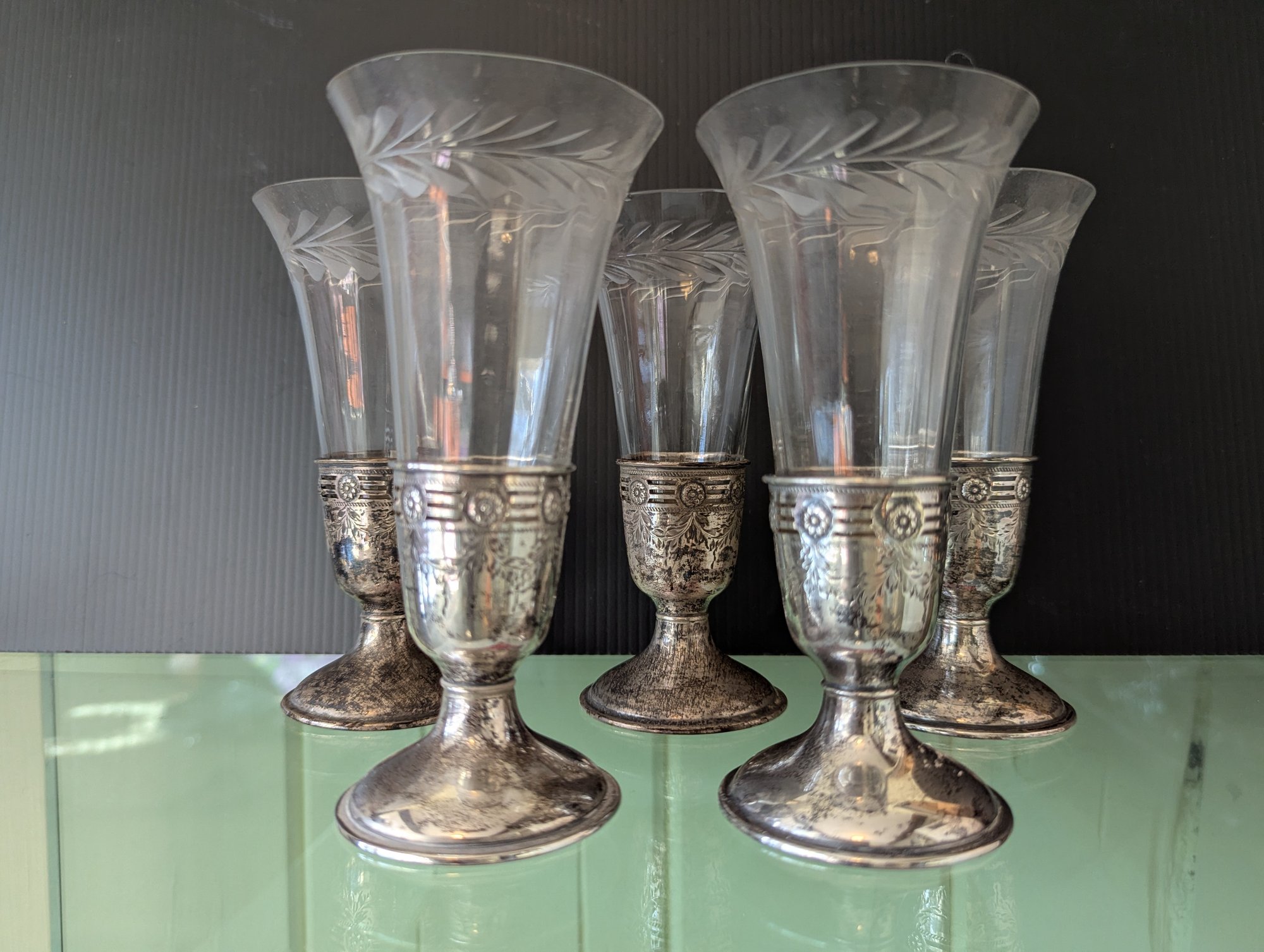 displays a set of vintage sterling silver parfait glasses with etched glass inserts, likely manufactured by the Webster Company.