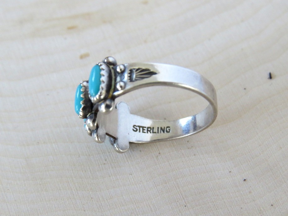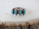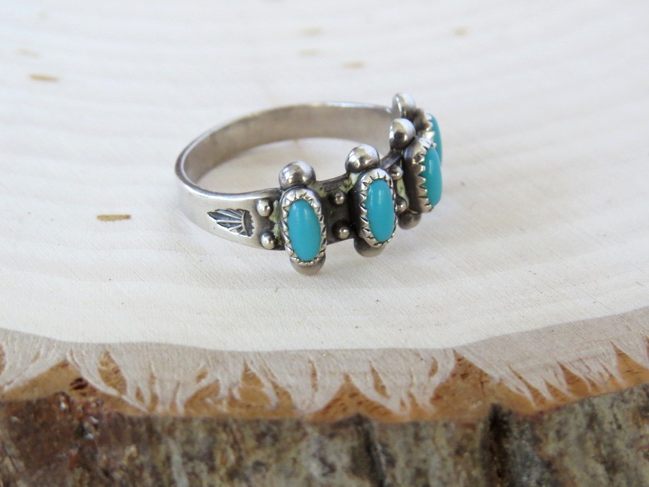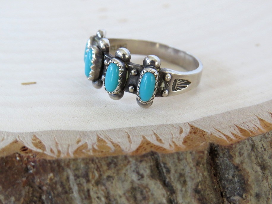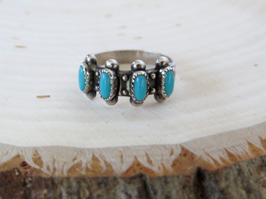 This is a Size 7 1/2 Sterling silver ring with four oval shaped turquoise colored stones. Band width is 1/8". Ring is marked Sterling on the inside of the band.