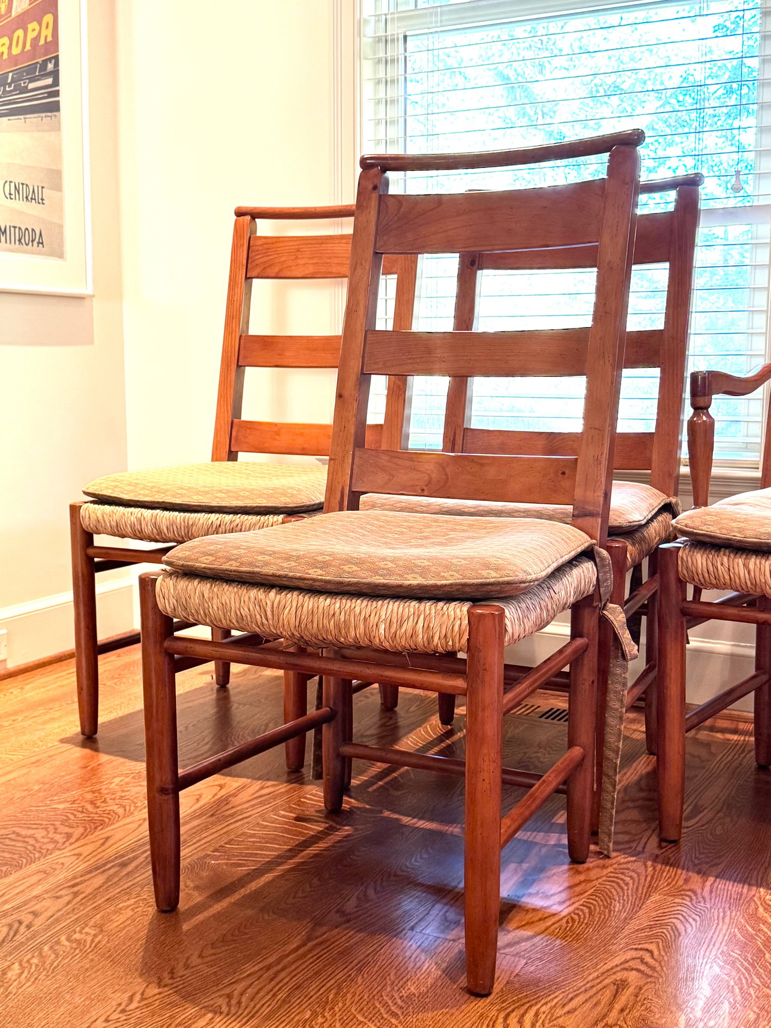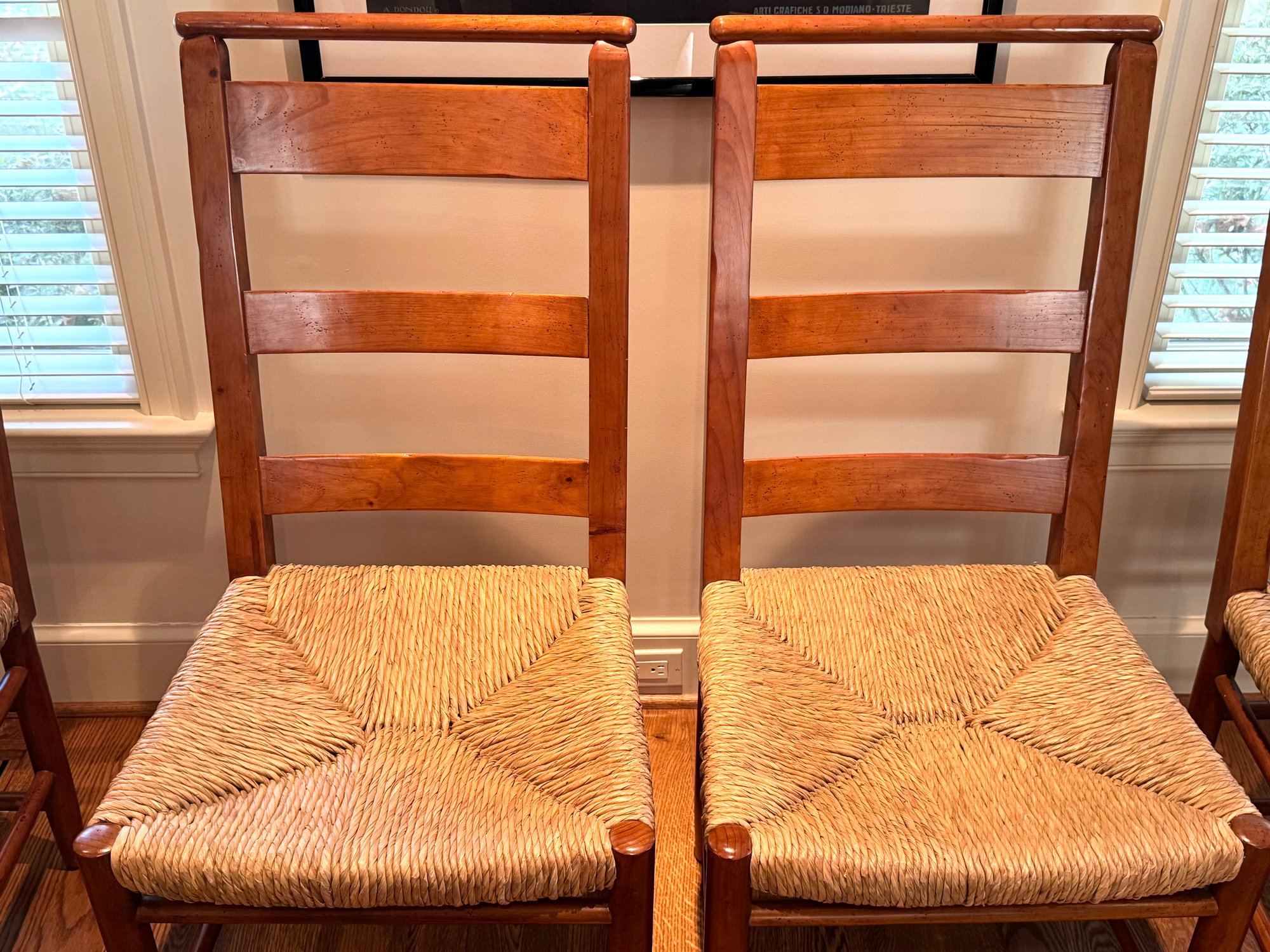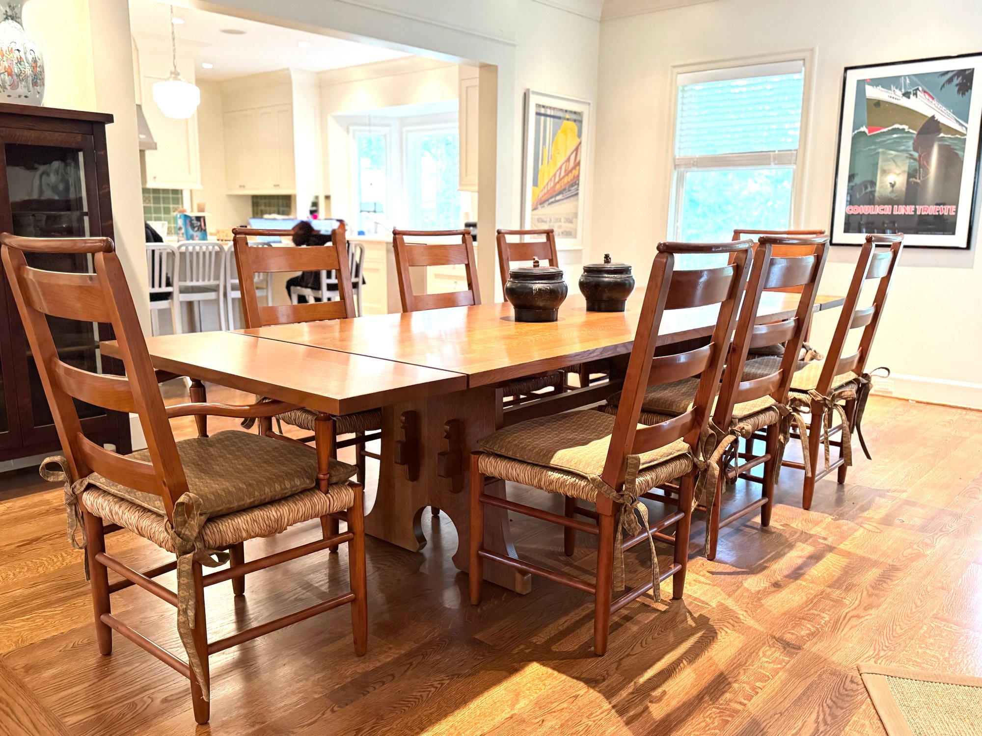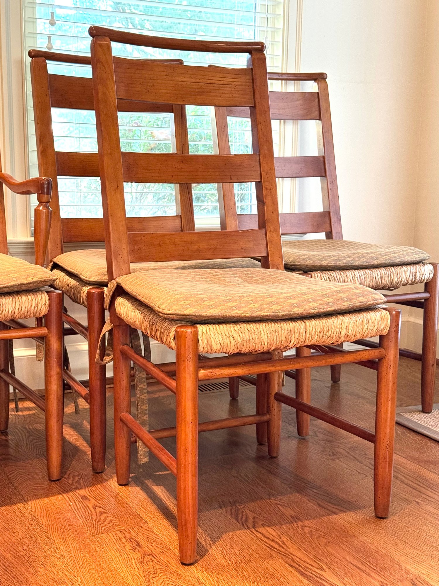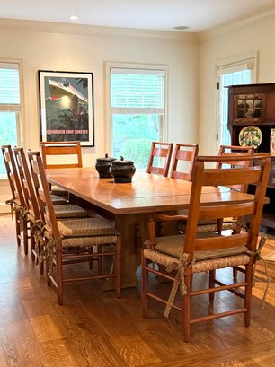 This harvest style dining set includes a beautiful Stickly trestle table with two extender leaves. The chairs are Milling Road by Baker and blend harmoniously together with their rush seats and ladder back design. THE CHAIRS HAVE CUSHIONS And can be used with or without! All are in very nice condition where they have been used in a weekend home with light use. The arm chair handles have some subtle finish wear on the arm rests that can easily polished. (Includes cushion covers) Absolutely perfect for the upcoming holiday season