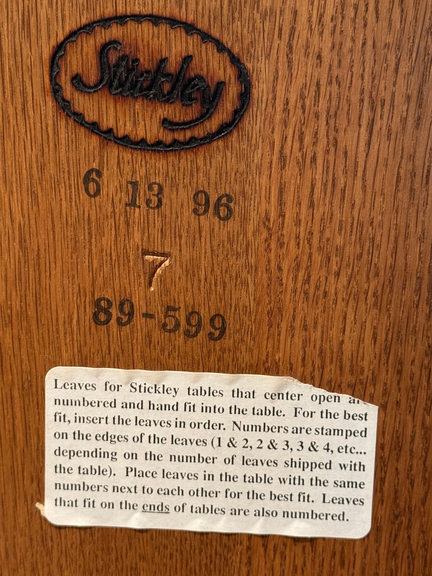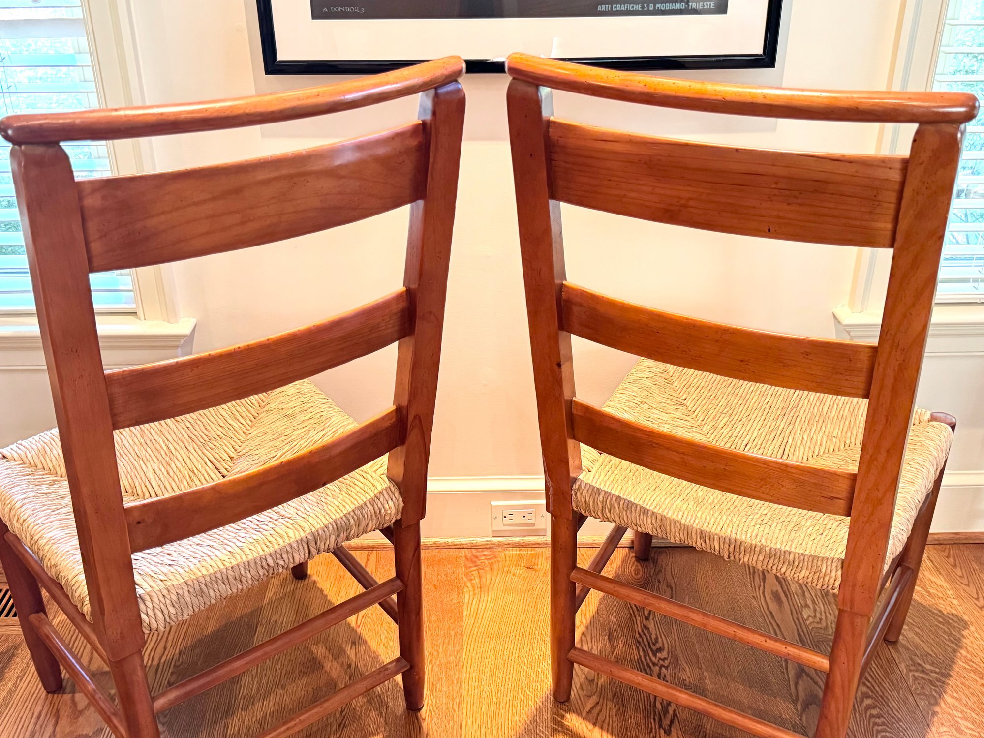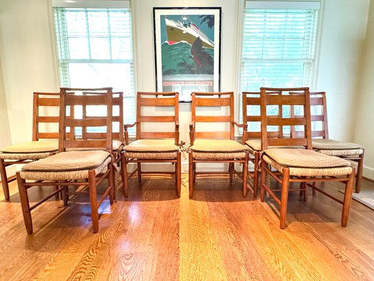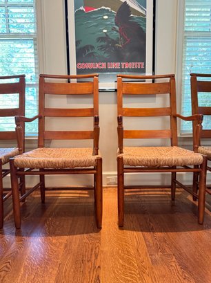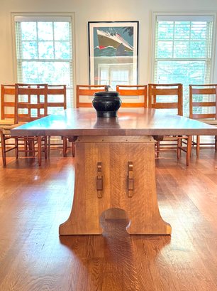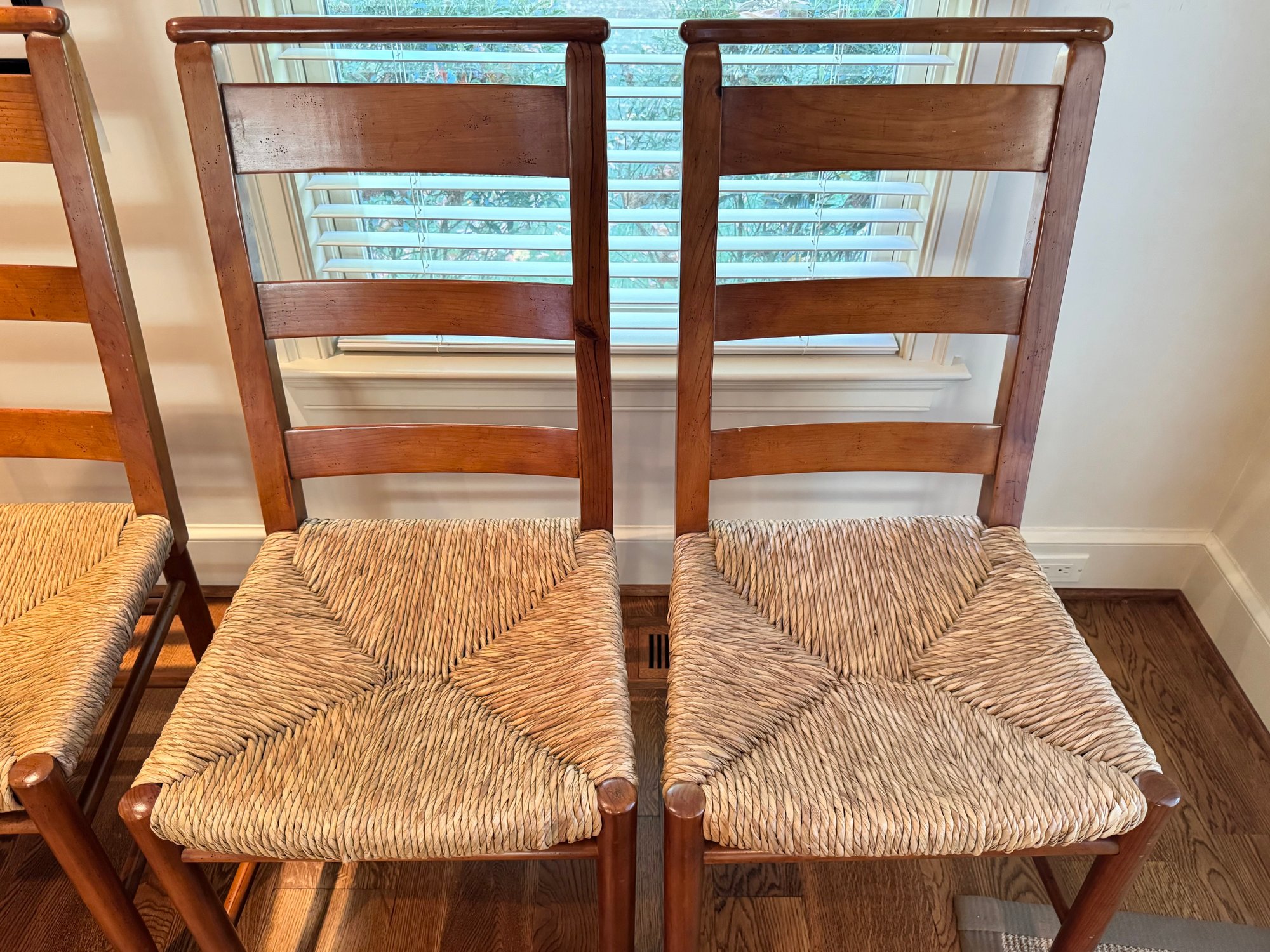 This harvest style dining set includes a beautiful Stickly trestle table with two extender leaves. The chairs are Milling Road by Baker and blend harmoniously together with their rush seats and ladder back design. THE CHAIRS HAVE CUSHIONS And can be used with or without! All are in very nice condition where they have been used in a weekend home with light use. The arm chair handles have some subtle finish wear on the arm rests that can easily polished. (Includes cushion covers) Absolutely perfect for the upcoming holiday season