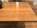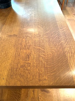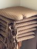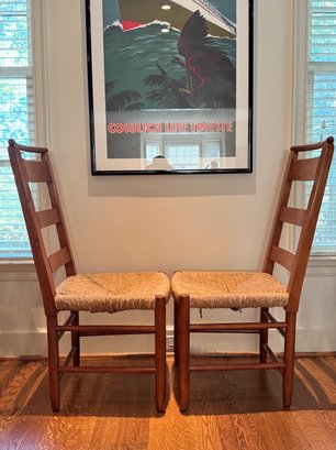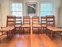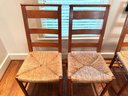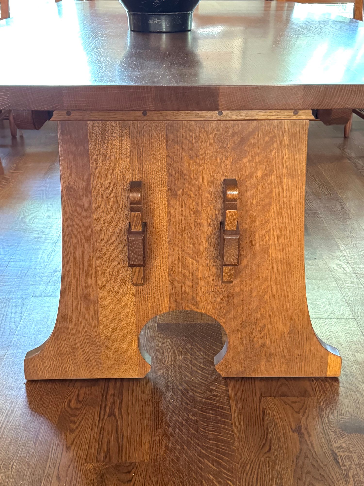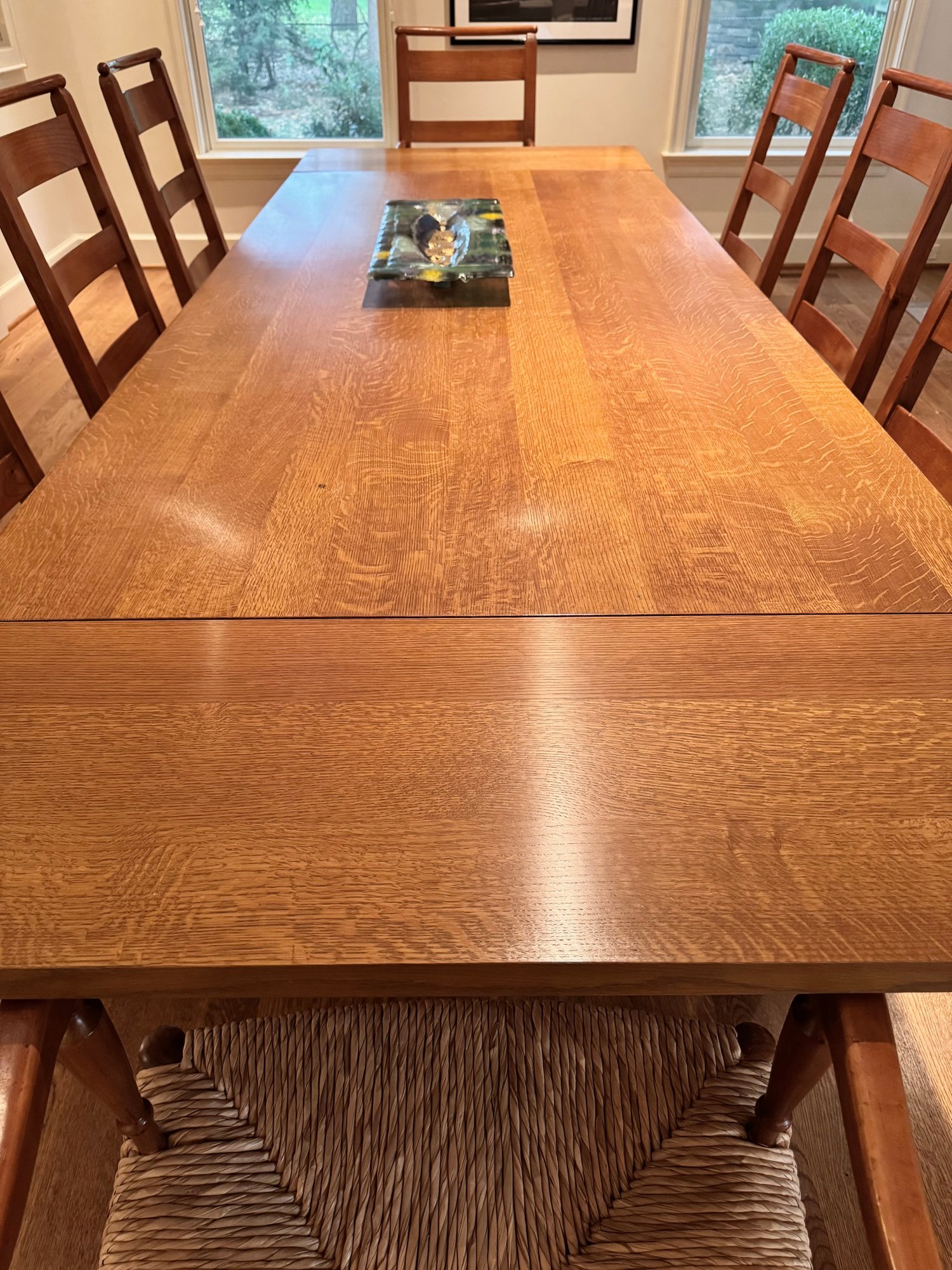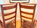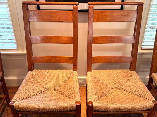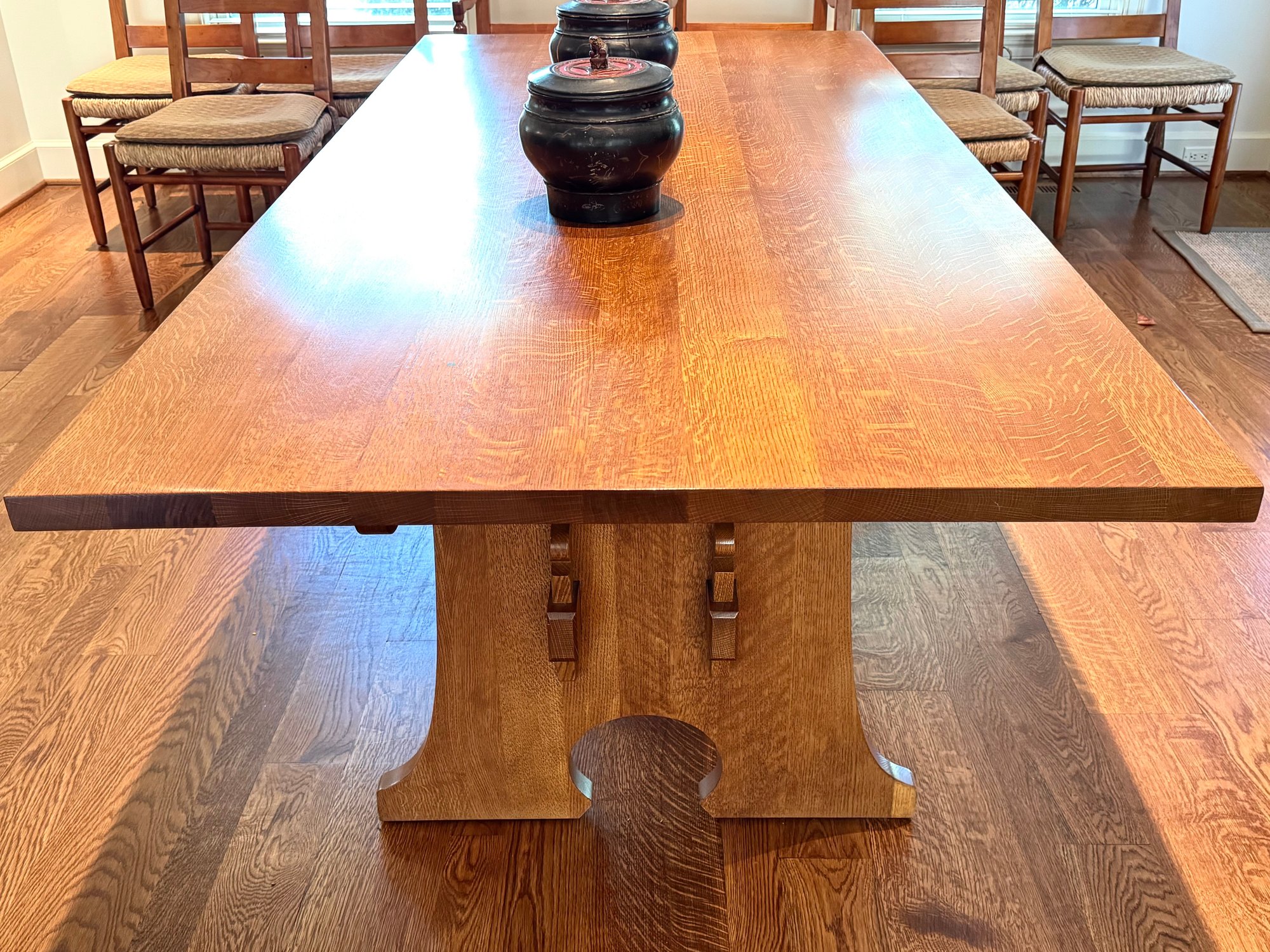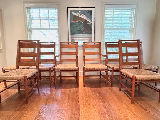 This harvest style dining set includes a beautiful Stickly trestle table with two extender leaves. The chairs are Milling Road by Baker and blend harmoniously together with their rush seats and ladder back design. THE CHAIRS HAVE CUSHIONS And can be used with or without! All are in very nice condition where they have been used in a weekend home with light use. The arm chair handles have some subtle finish wear on the arm rests that can easily polished. (Includes cushion covers) Absolutely perfect for the upcoming holiday season