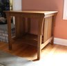 late 20th century, model no. 35 Fayetteville Oak, square form with two shelves with alternating slat panels, on straight legs, labeled.