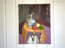 Still life of decanter with fruit, initialed by artist.