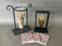 Pretty decor including a glass decorative piece with stones, a buddha head and some rug coasters