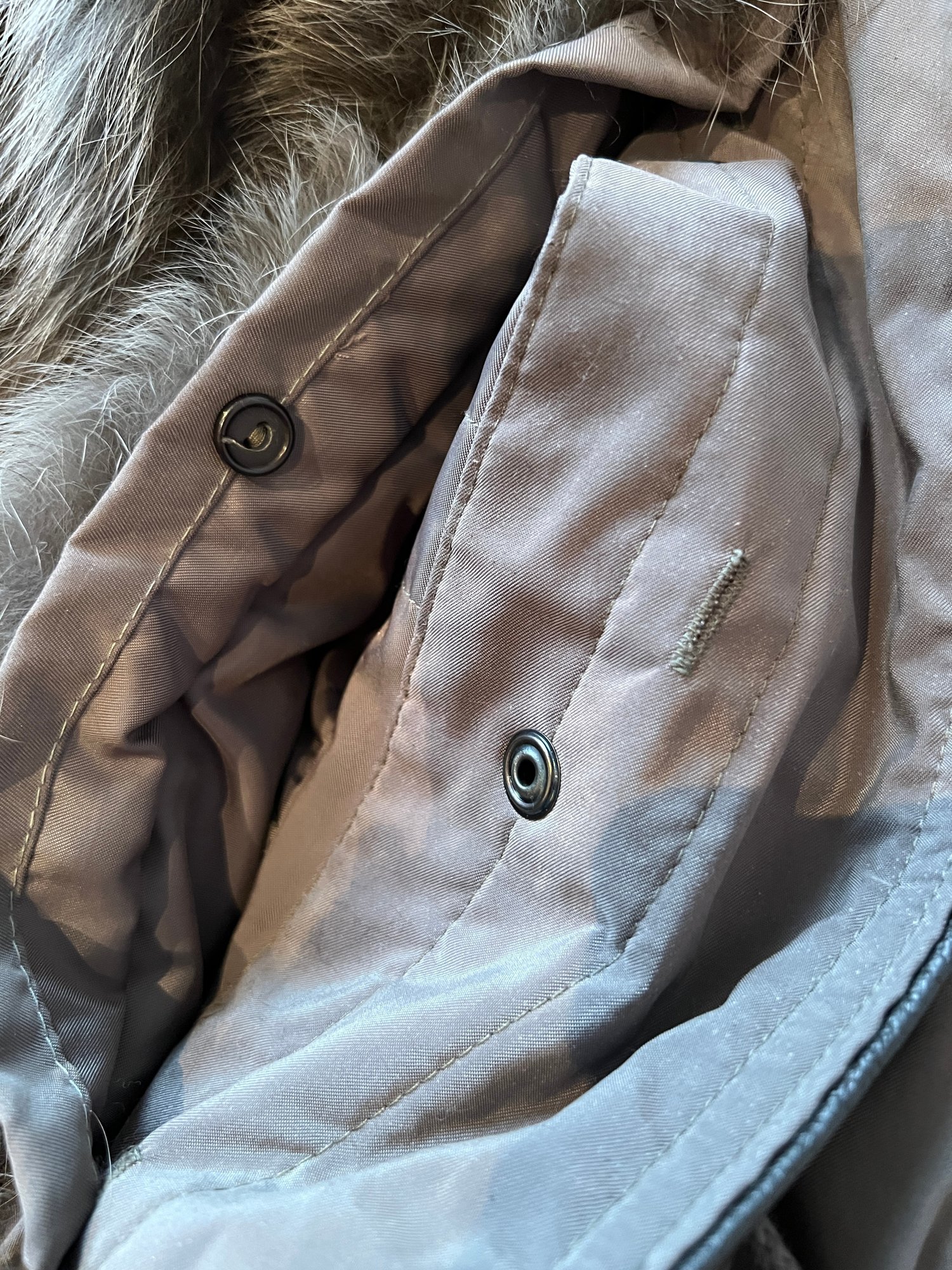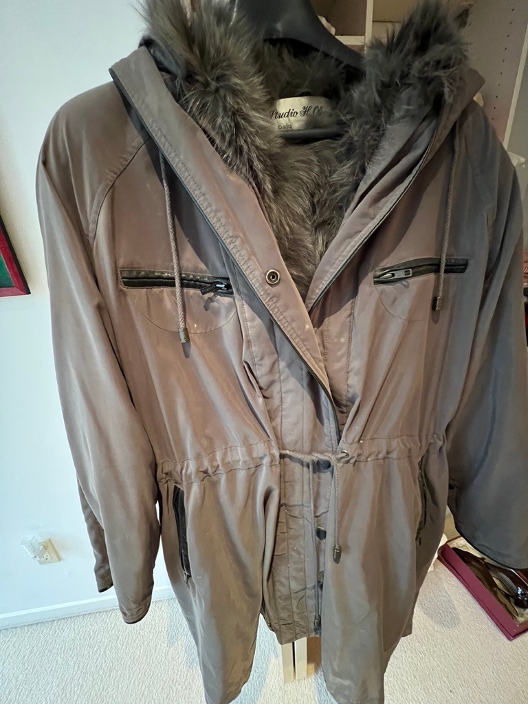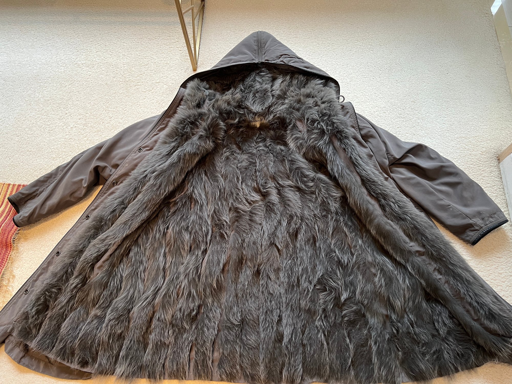 Studio H Oleson from Oslo, Norway, very warm, very pretty, lined w/Fox, winter jacket, a grey/khaki, color, removable lining, buttons in and out, hood zips halfway, sides tighten or loosen with drawstring, as does the collar, car length, pockets lined with leather for better wear, in very good, hardly worn condition. Approx size 6