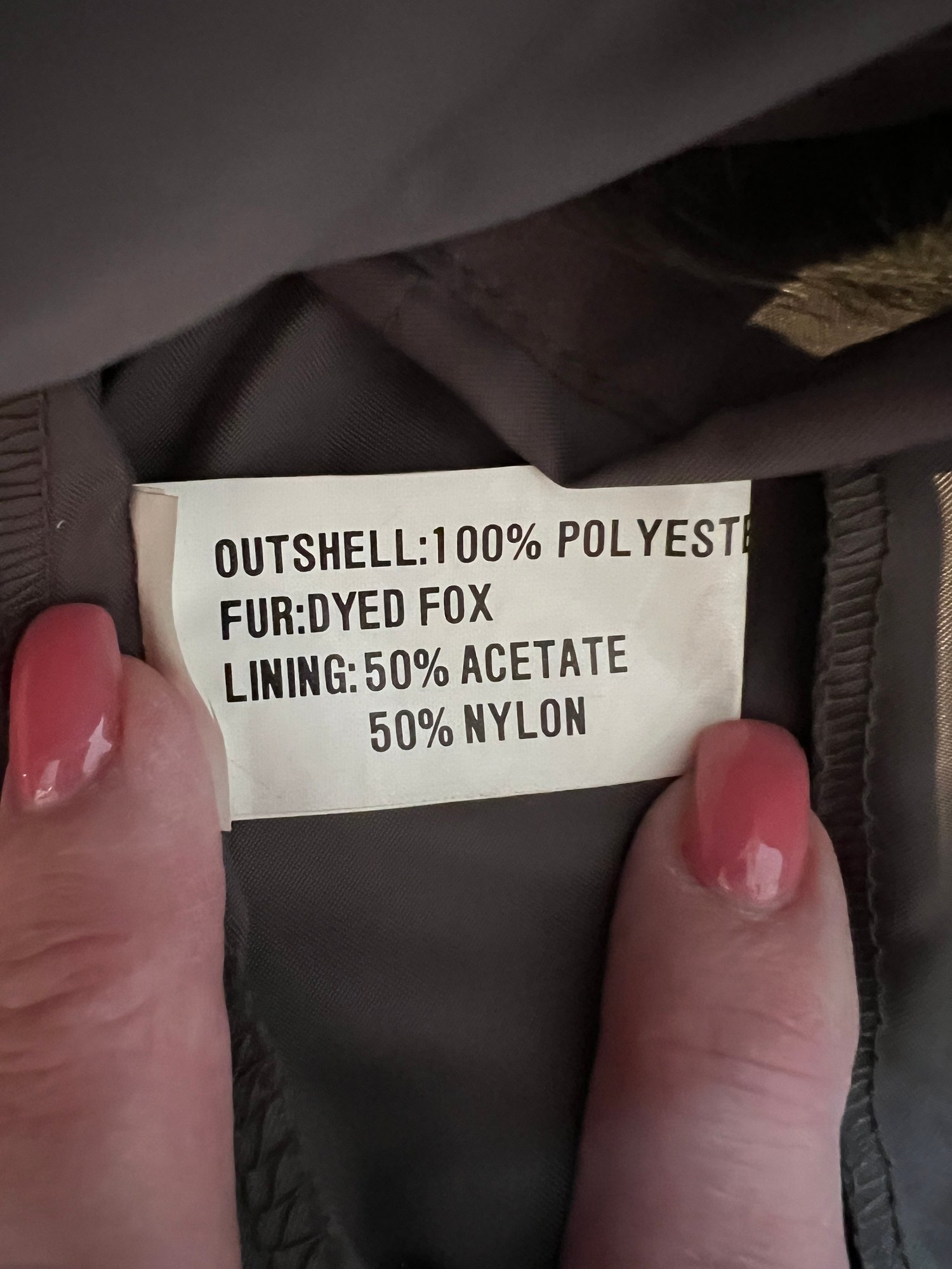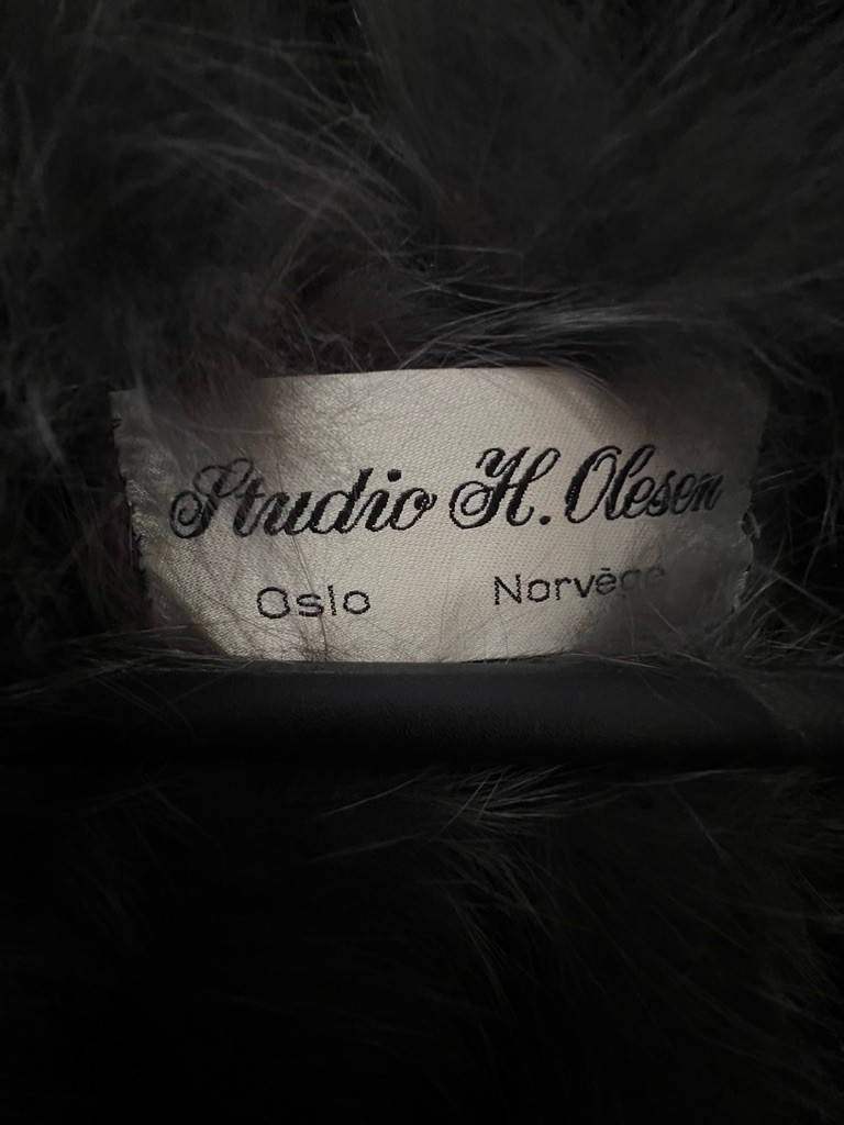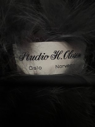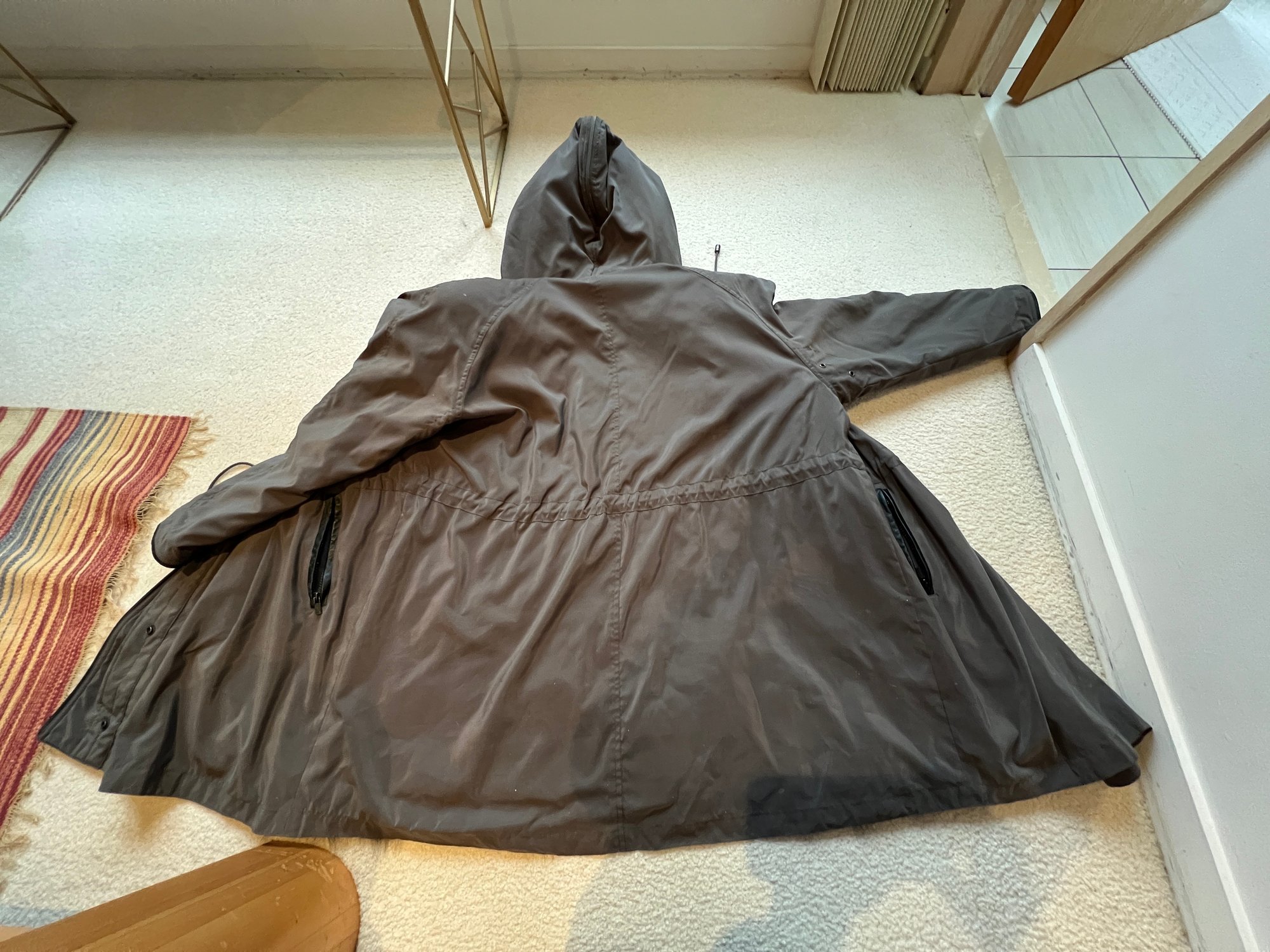 Studio H Oleson from Oslo, Norway, very warm, very pretty, lined w/Fox, winter jacket, a grey/khaki, color, removable lining, buttons in and out, hood zips halfway, sides tighten or loosen with drawstring, as does the collar, car length, pockets lined with leather for better wear, in very good, hardly worn condition. Approx size 6