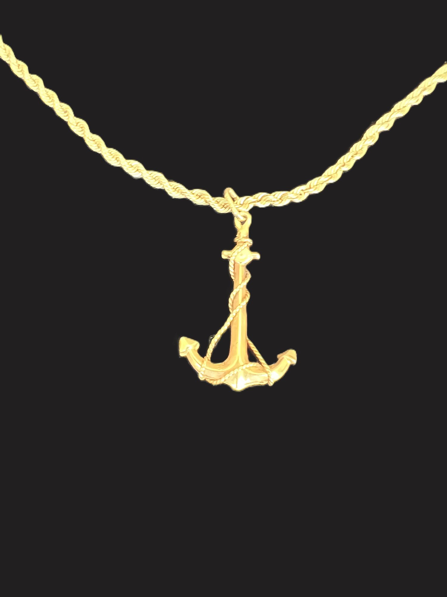 Absolutely stunning 14k gold Italian anchor pendant on a gold tone chain, which is not marked for carat gold. Pendant doesn't have much weight - less than one gram.