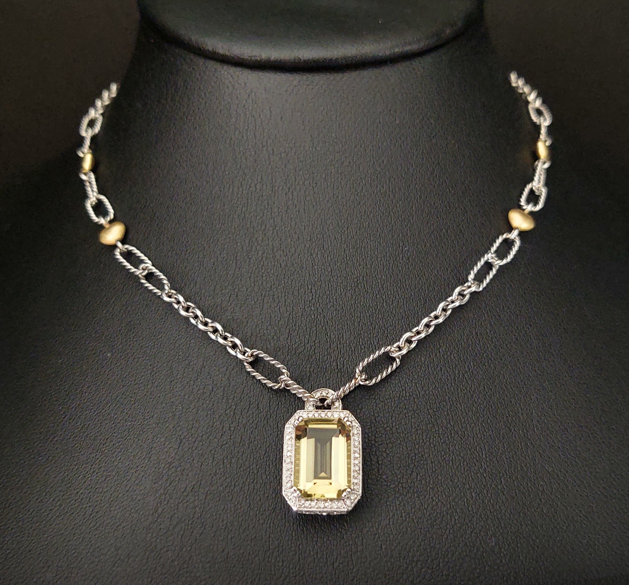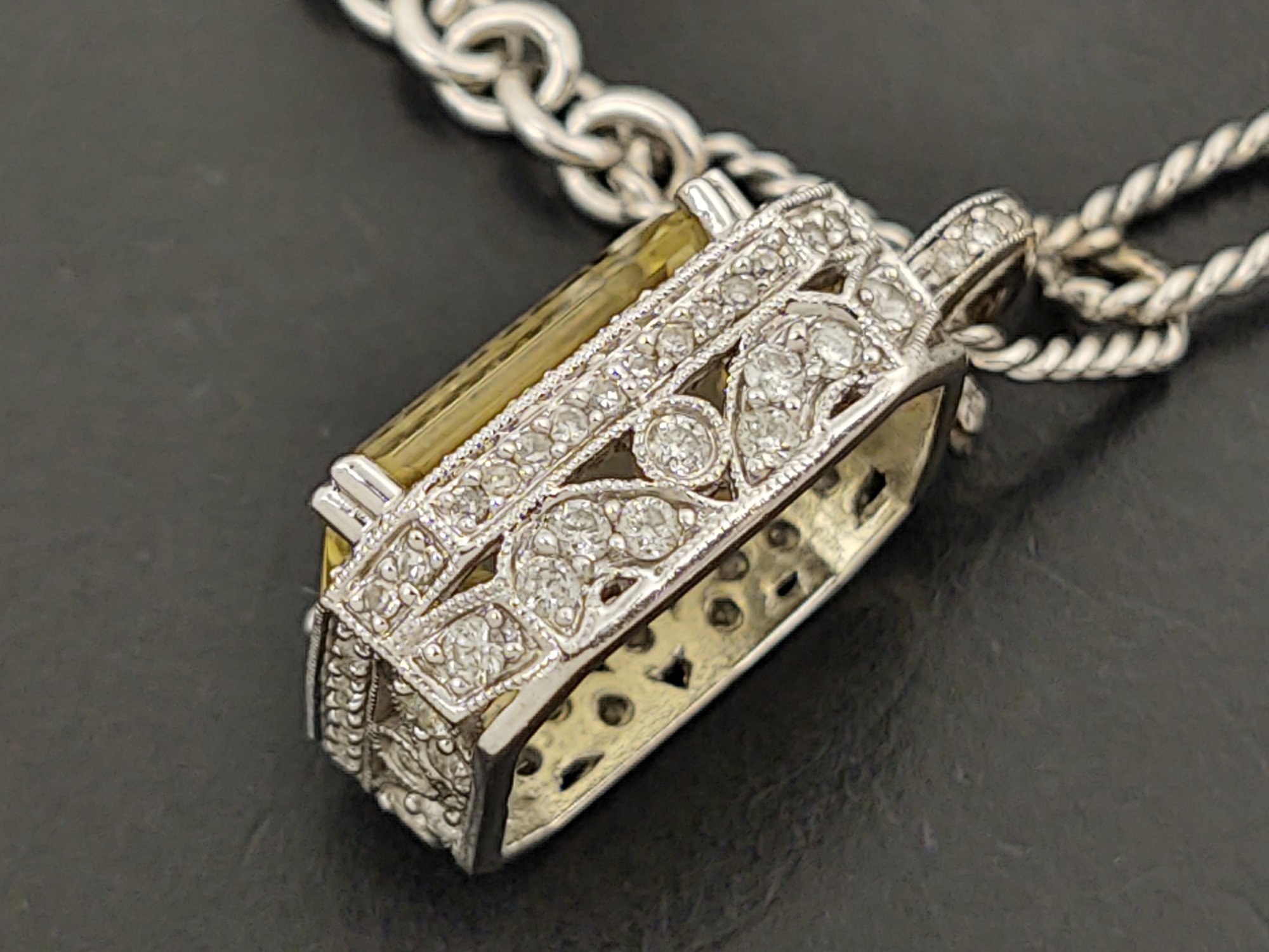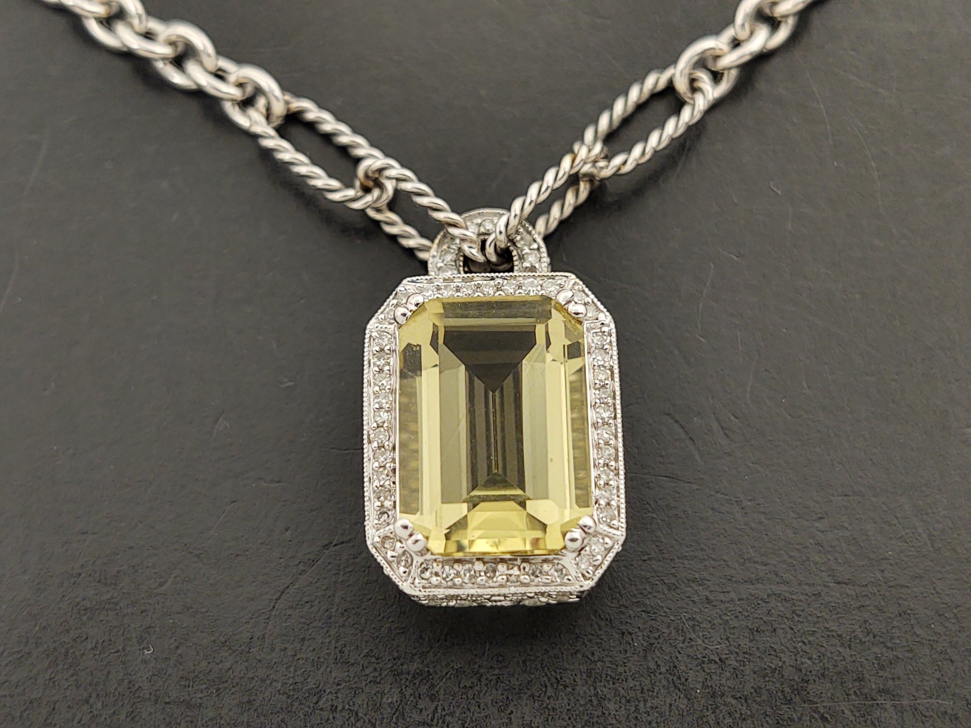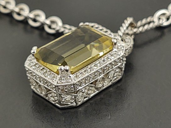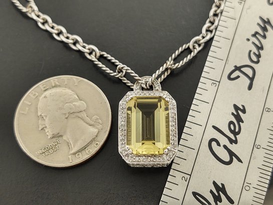 Measures 16 1/8" long. Weighs 14.7 grams. The pendant features a beautiful 7.25ct citrine.. and there also 127 small diamonds pave set into the the pendant with a total weight of 0.87ctw for the diamonds.