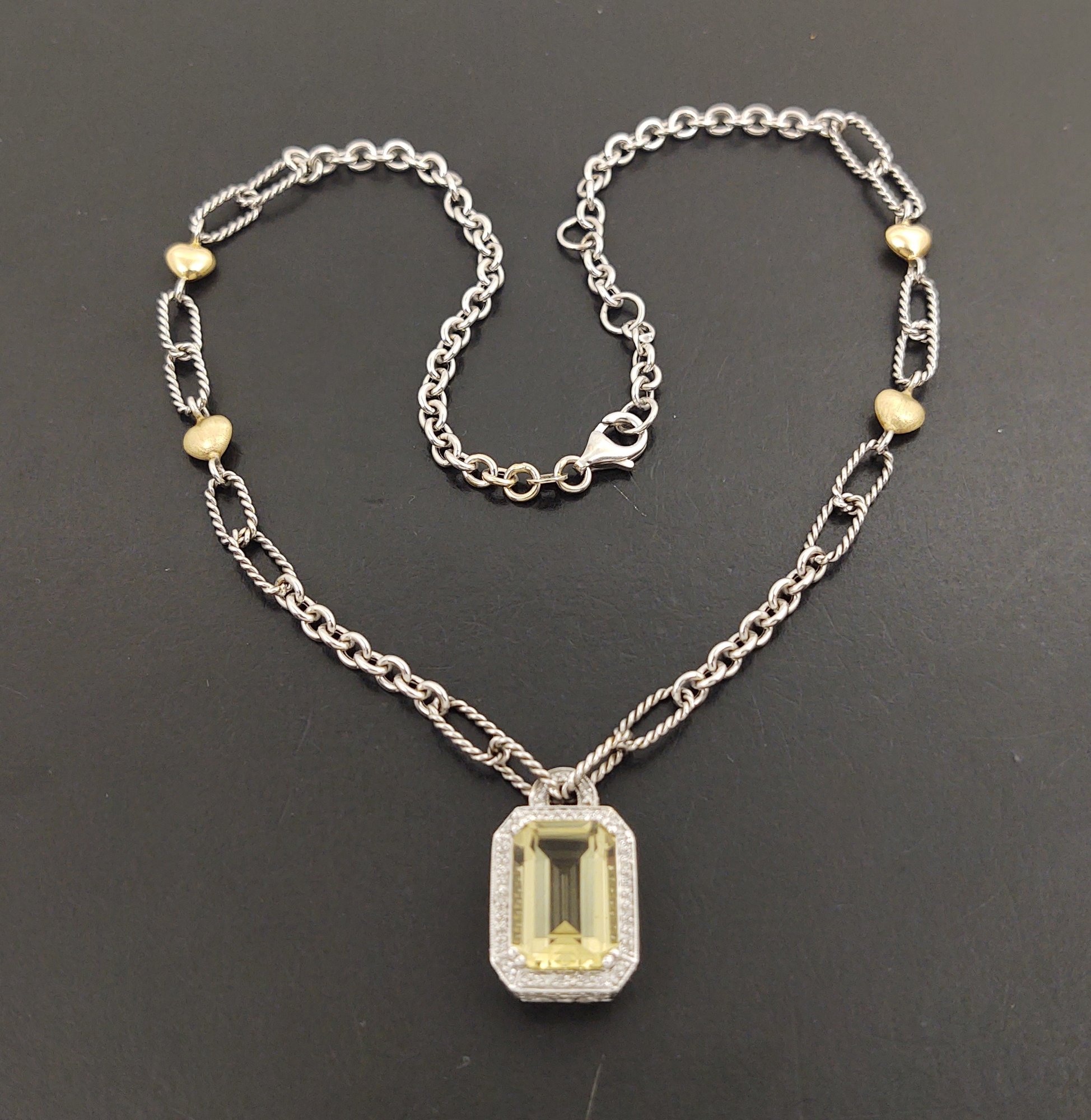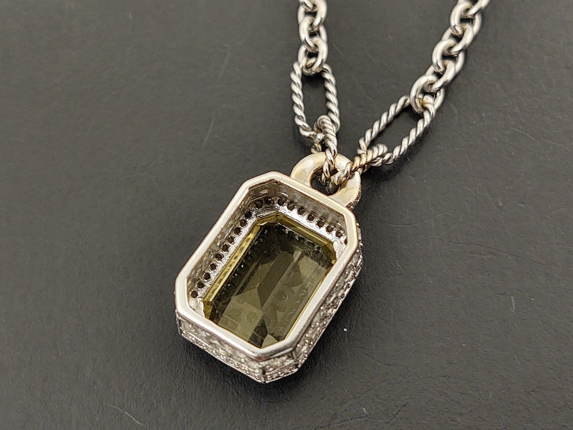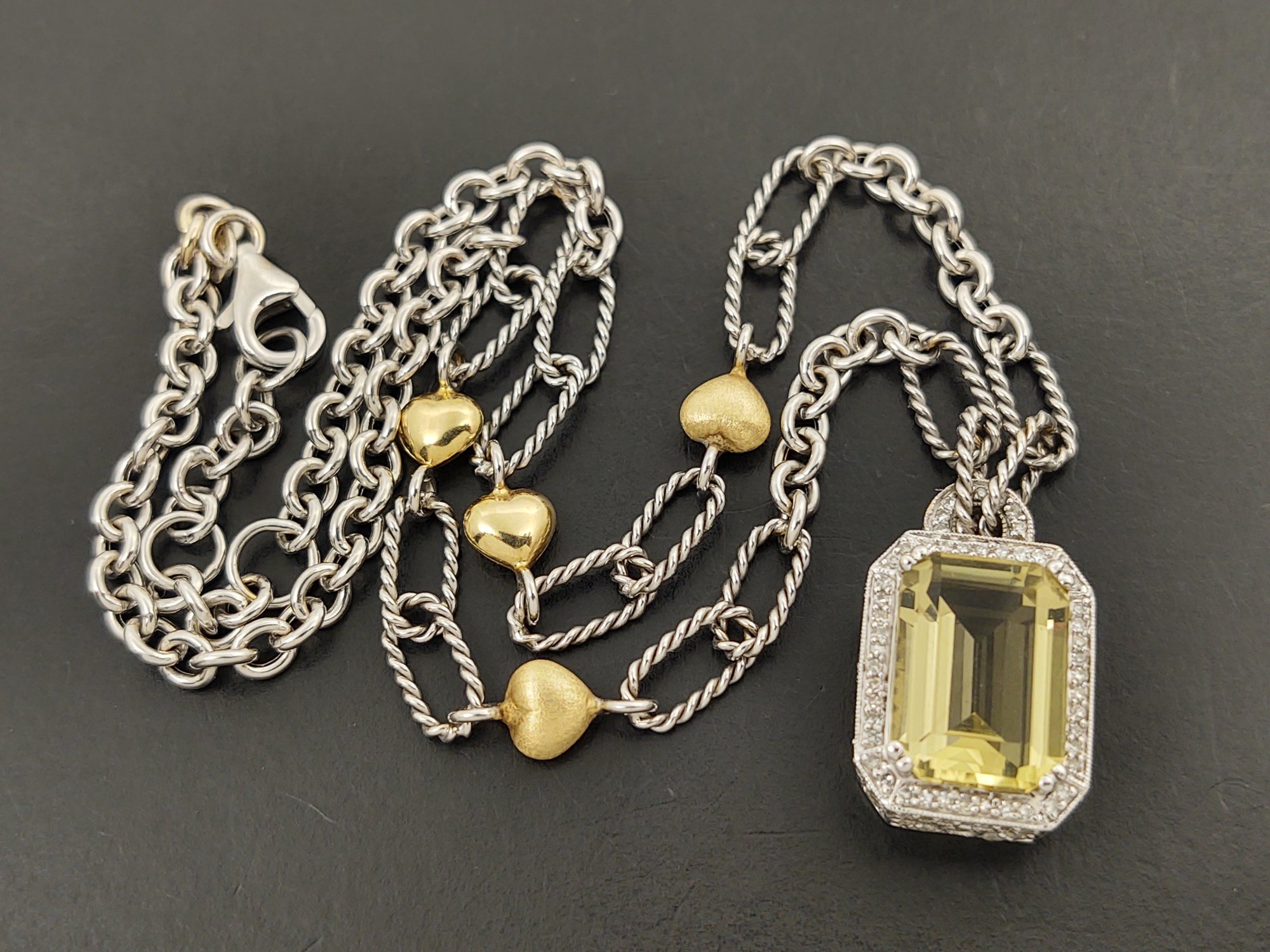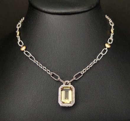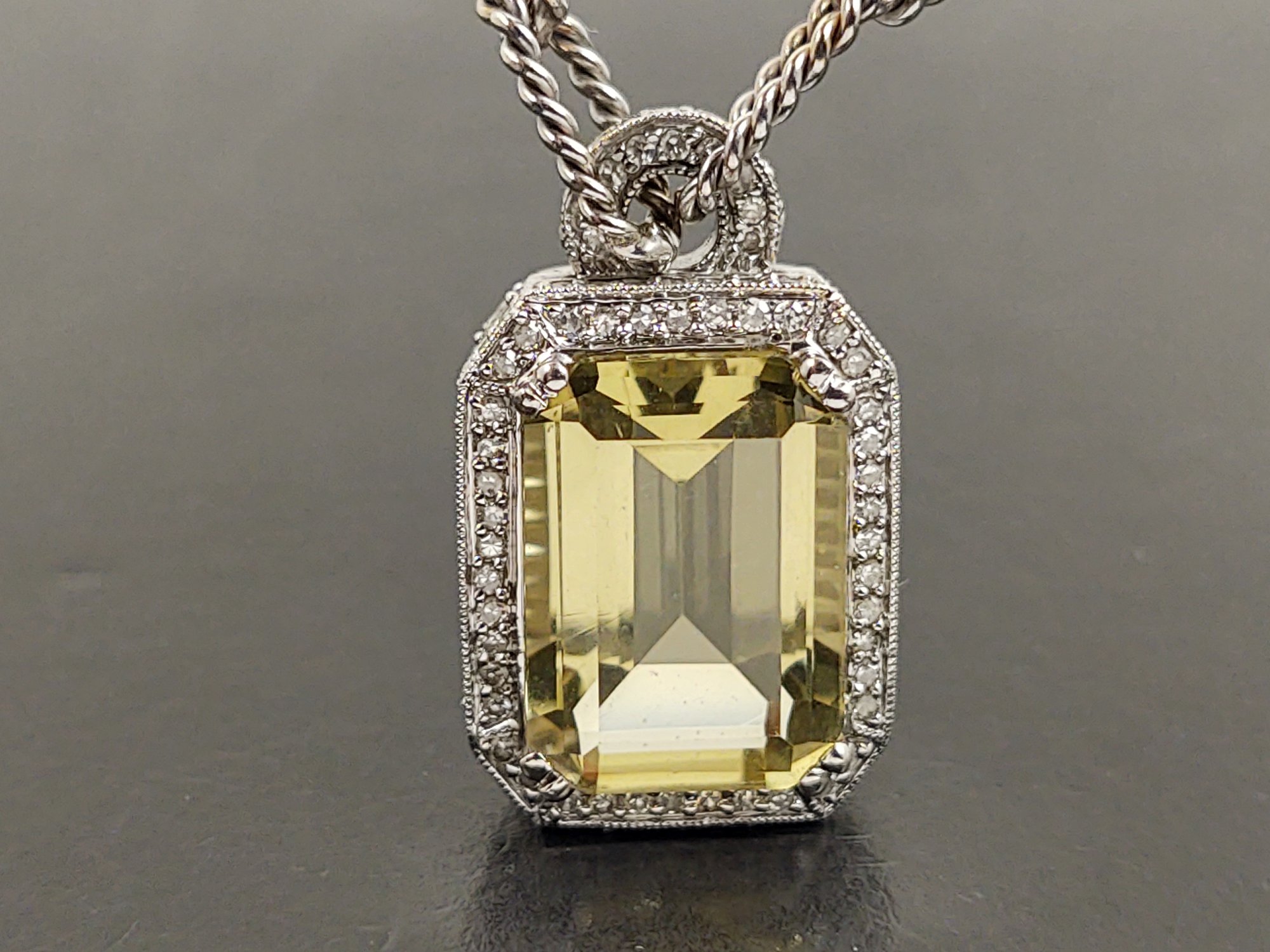 Measures 16 1/8" long. Weighs 14.7 grams. The pendant features a beautiful 7.25ct citrine.. and there also 127 small diamonds pave set into the the pendant with a total weight of 0.87ctw for the diamonds.