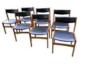 Gorgeous set of 6 teak chairs marked Made in Denmark. Our research has found that these are designed by Erik Buch for Anderstrup Møbelfabrik in the 1960's and we found them online for $500 or more per chair! All original and unrestored, the wood is in outstanding condition with black vinyl seat and backs. One seat has a poorly made patch and several of the seats have small spots of damage to the vinyl. But the frames are in great condition - no wobbles, no gouges and just a few scuffs that should clean off. Awesome Mid-Century vintage vibe ready to find their new home.