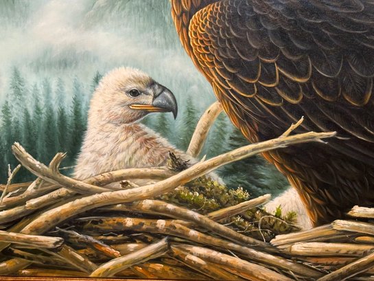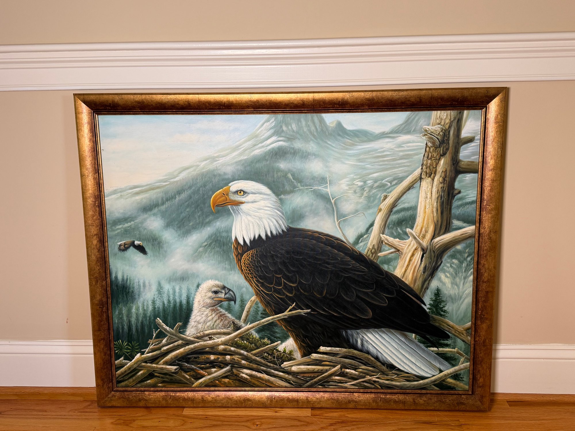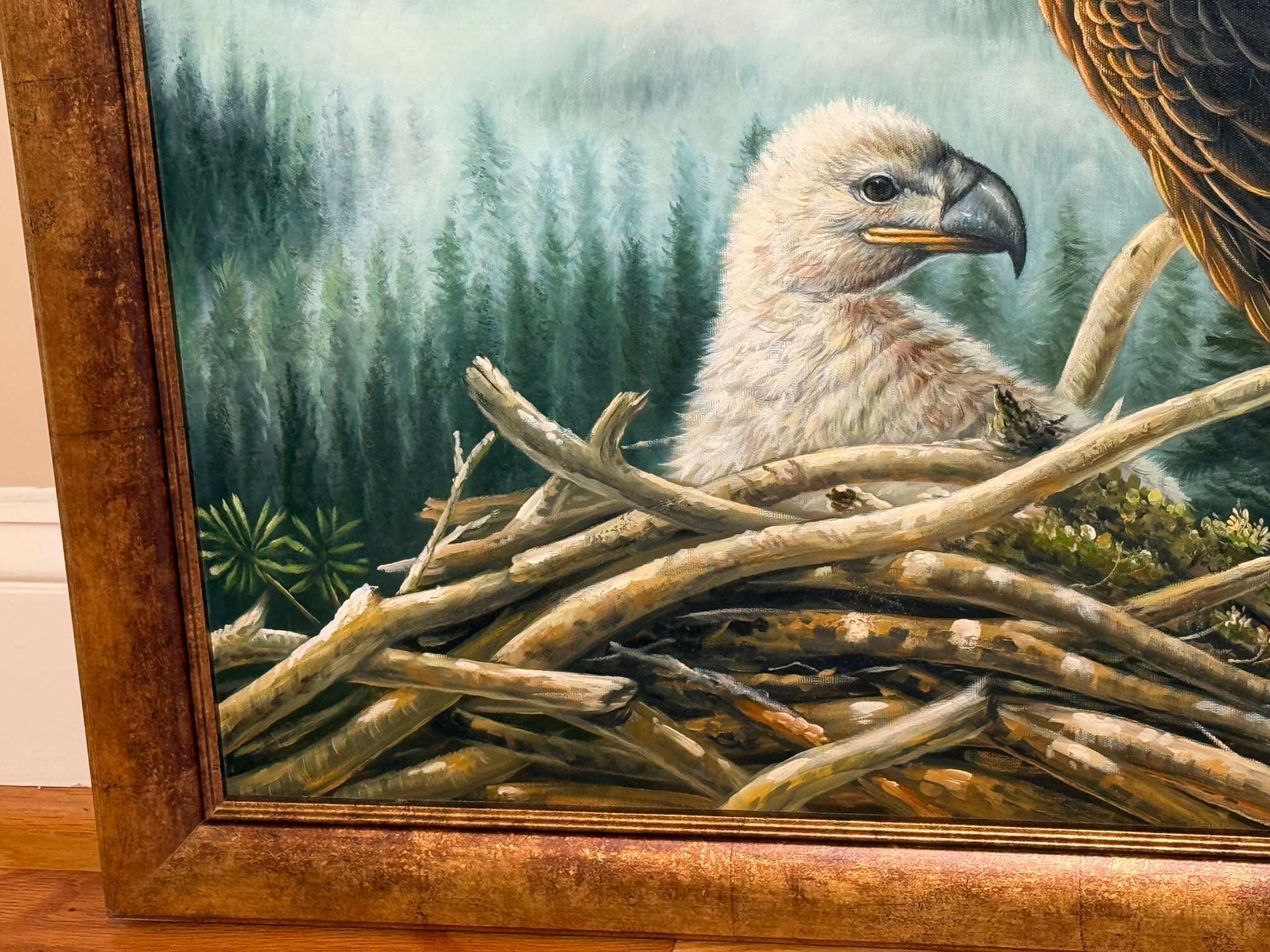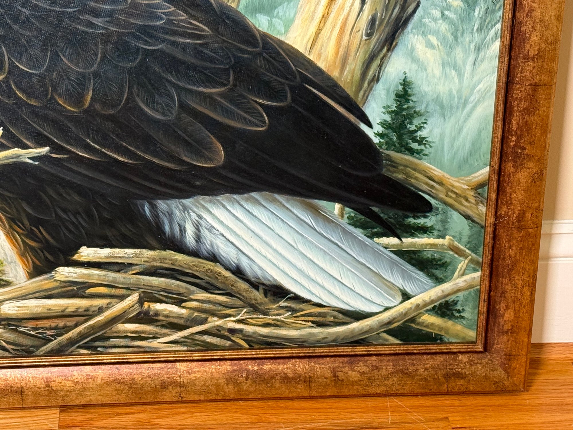 This is an absolutely beautiful original oil painting of an Eagle in its nest in its natural environment. We do not detect any artist signature. This is large and makes a statement.