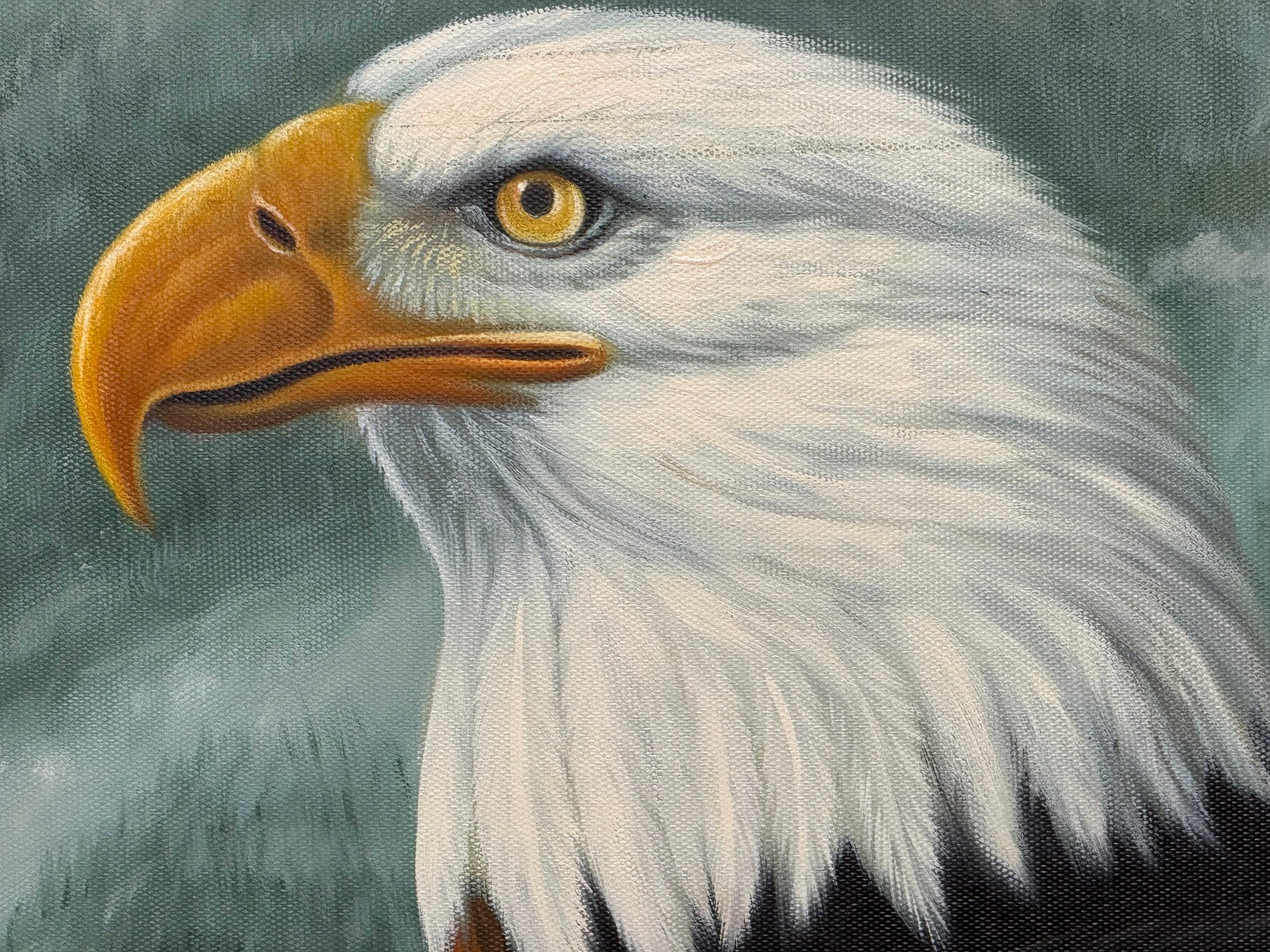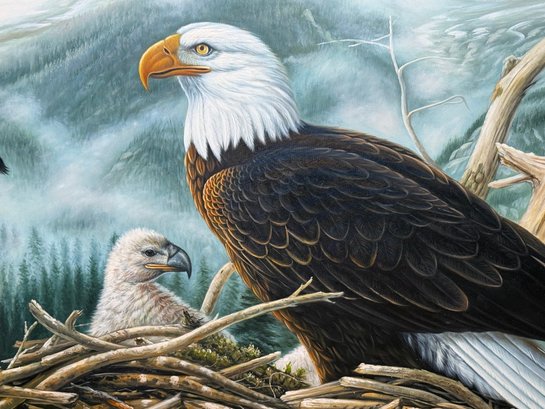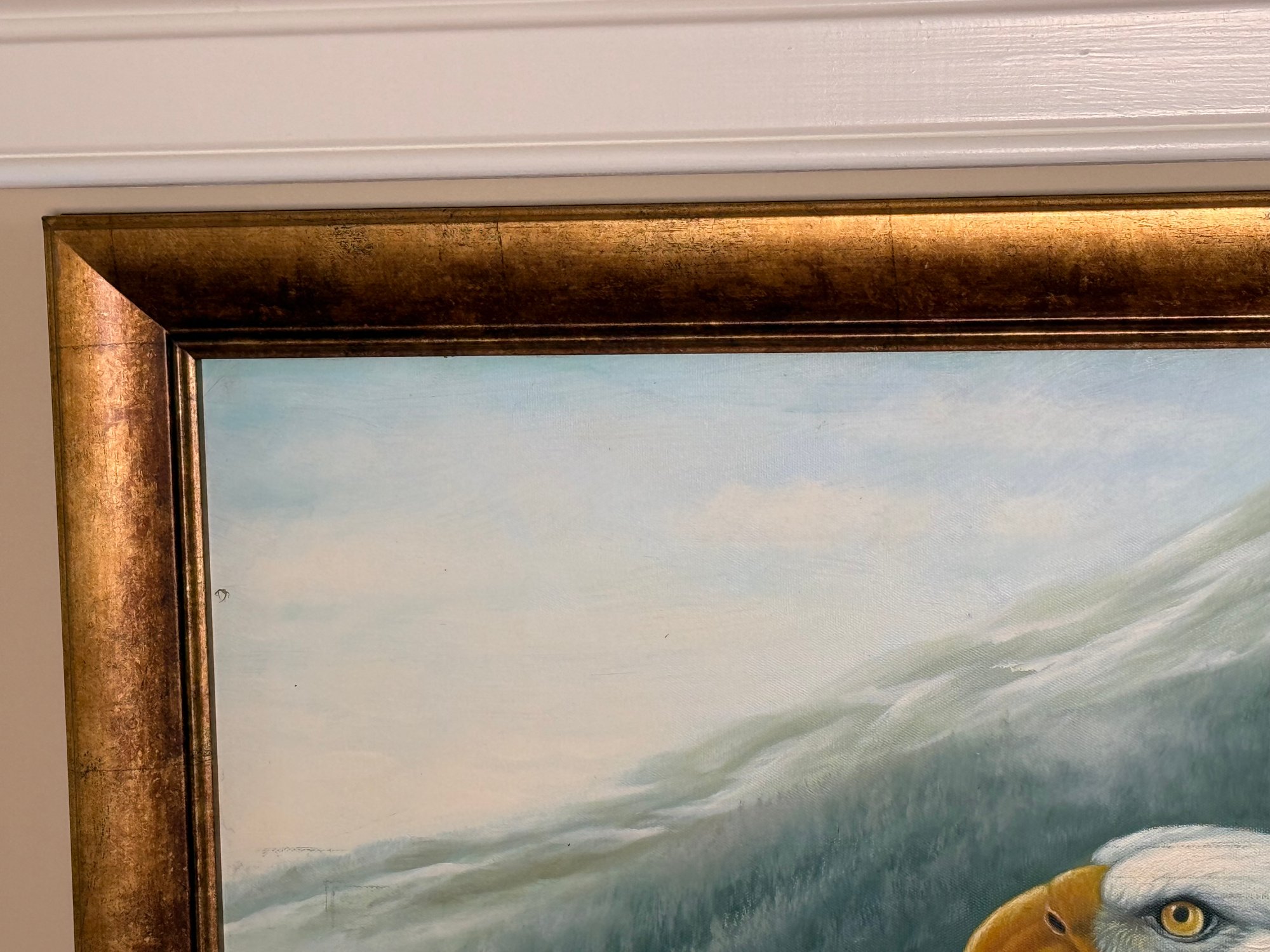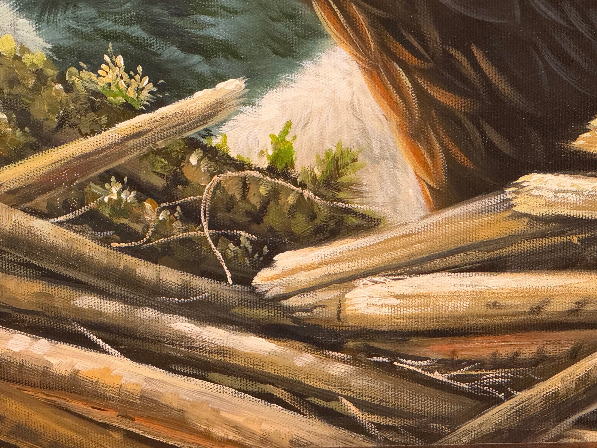 This is an absolutely beautiful original oil painting of an Eagle in its nest in its natural environment. We do not detect any artist signature. This is large and makes a statement.