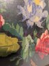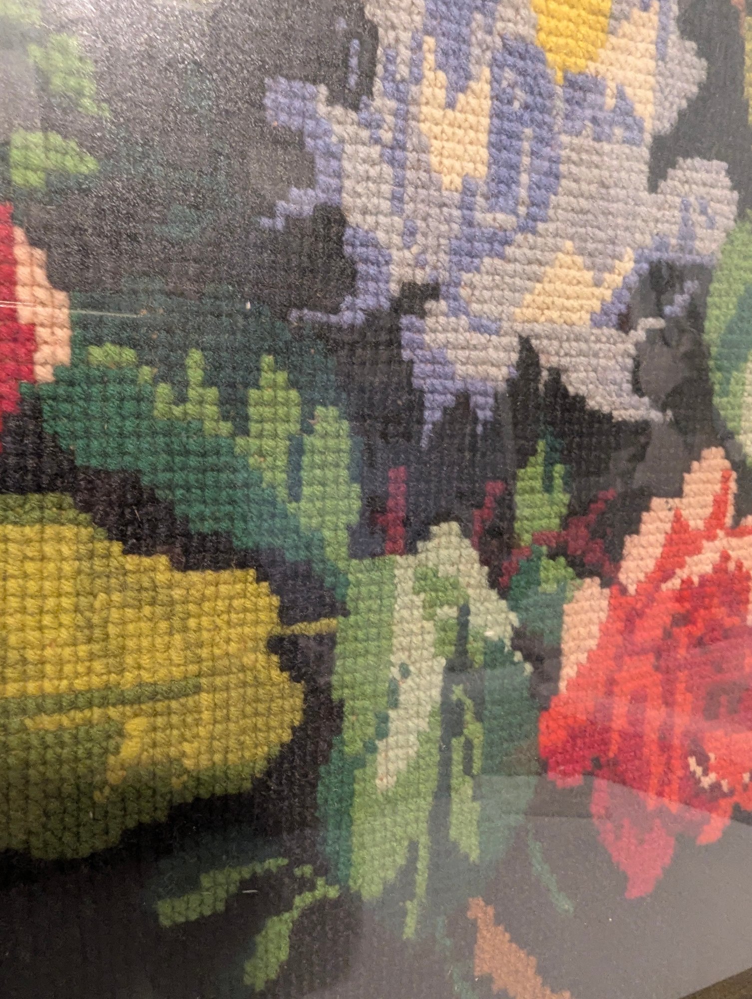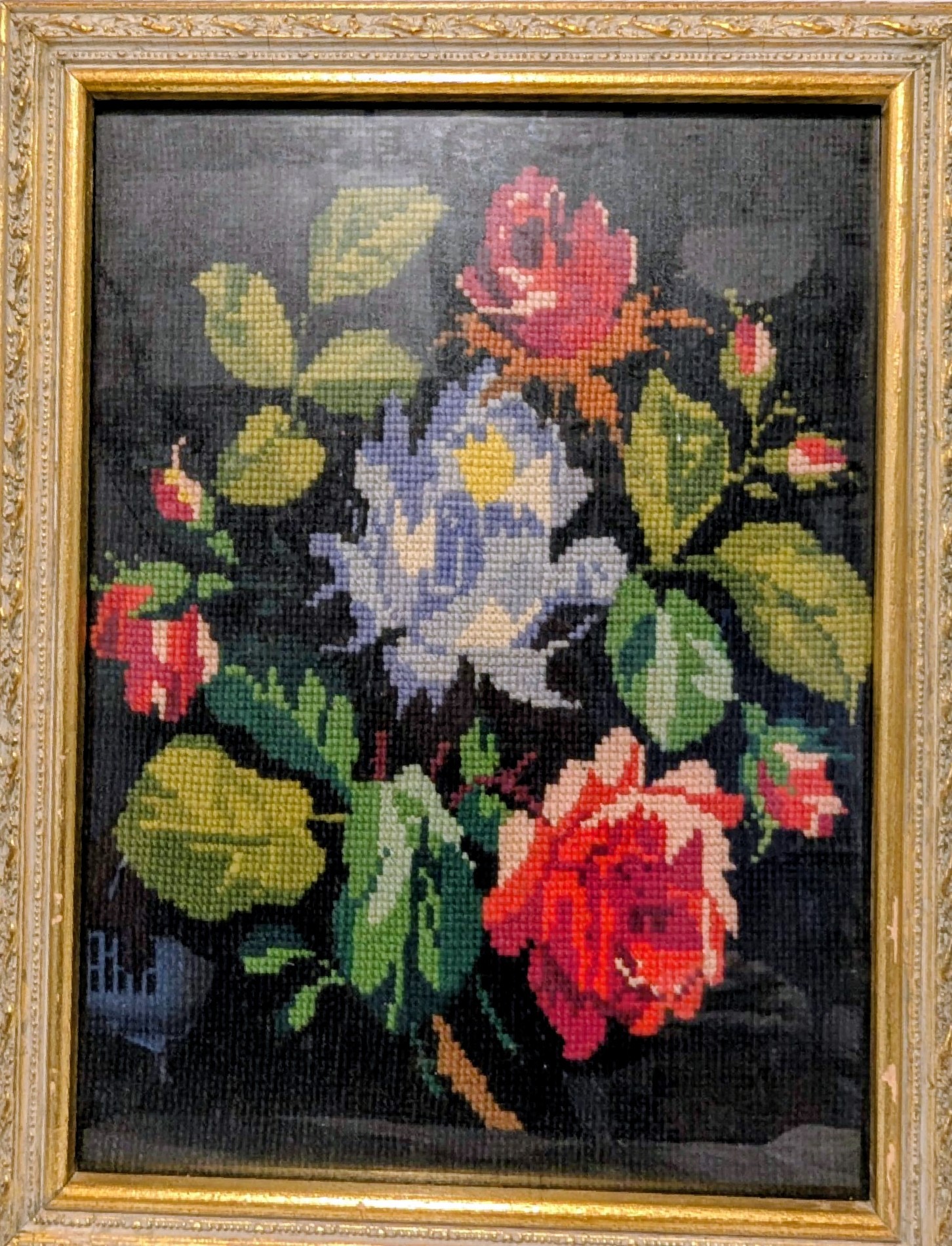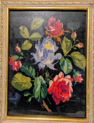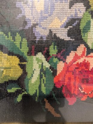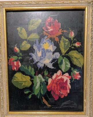 This piece is the nicest Victorian-style needlepoint I have ever seen. The craft/art form was extremely popular during the 1940s through the 1960s. This one features a lush, multi-colored floral bouquet—prominently showcasing red and white roses—set against a deep ebony (black) background. The high-contrast color palette was specifically designed to make the floral pigments appear more vibrant and "pop" from the frame.