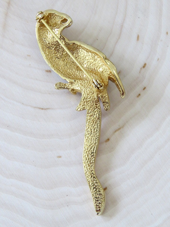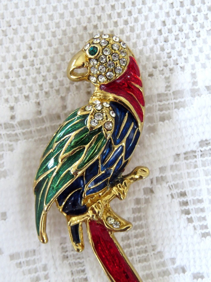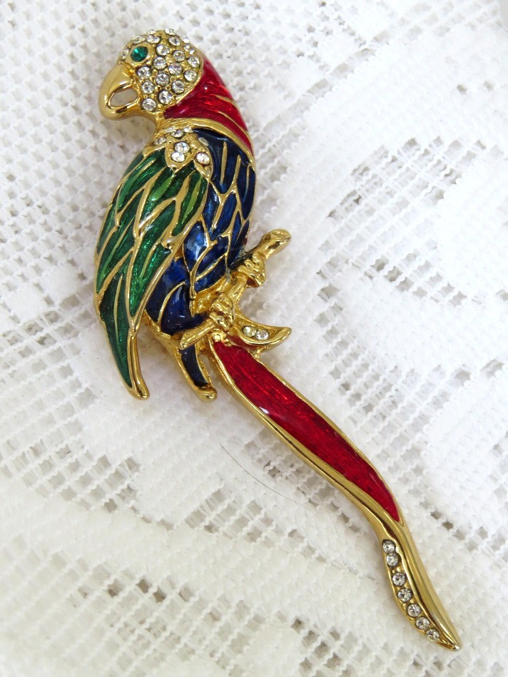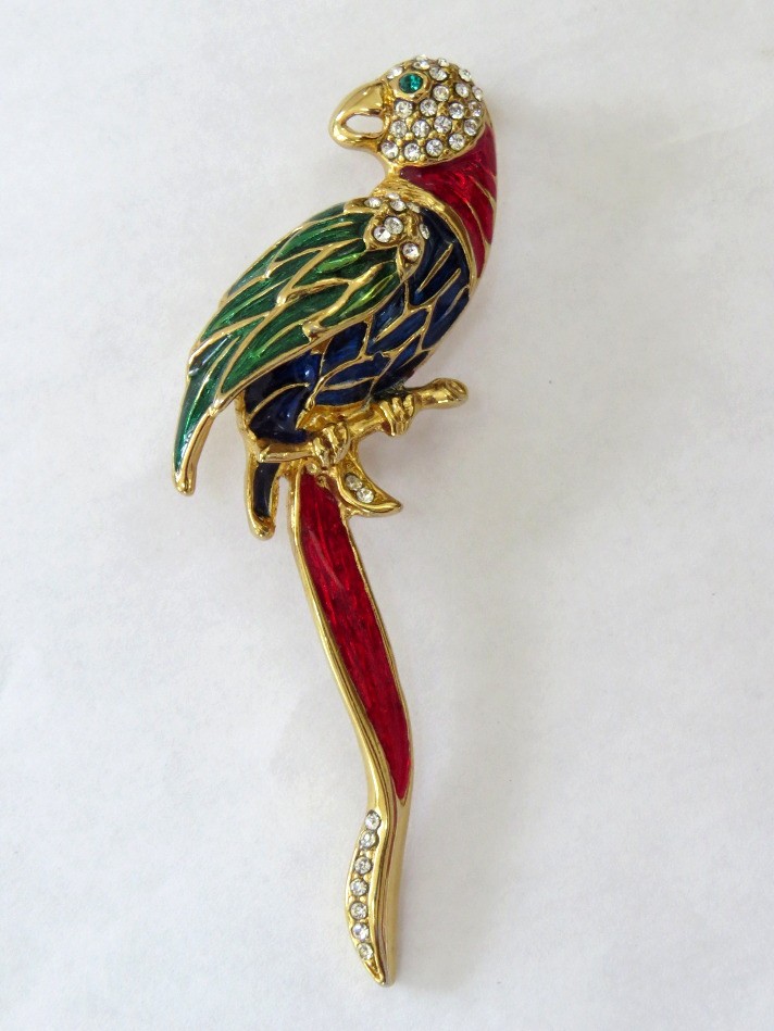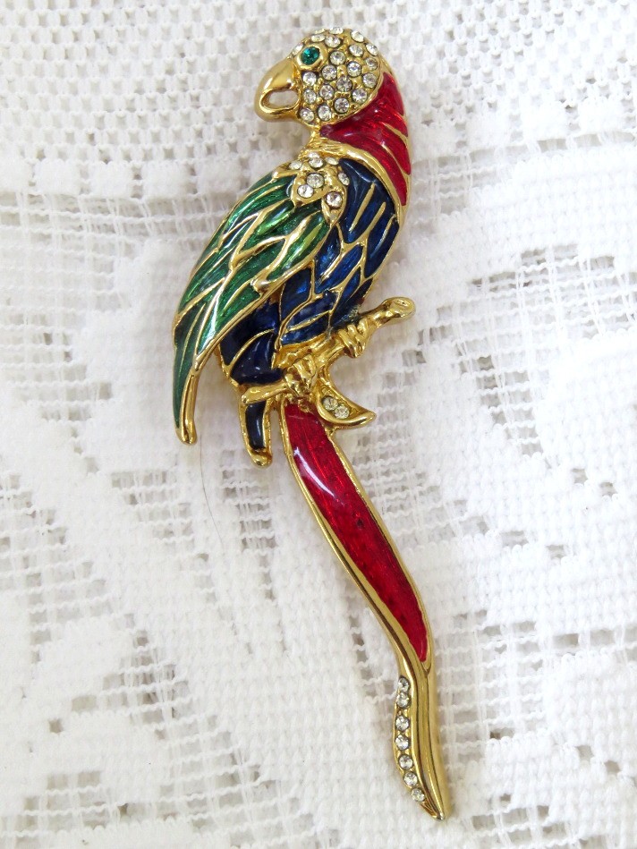 Stunning vintage 1990s rhinestone crystal and enamel gold tone Macaw parrot 3 1/2” long brooch. This colorful vintage piece with its intricate design is a perfect blend of beauty and nature, with clear rhinestone crystals, emerald colored eye and multicolor enamel adding to its charm. Brooch has working clasp.