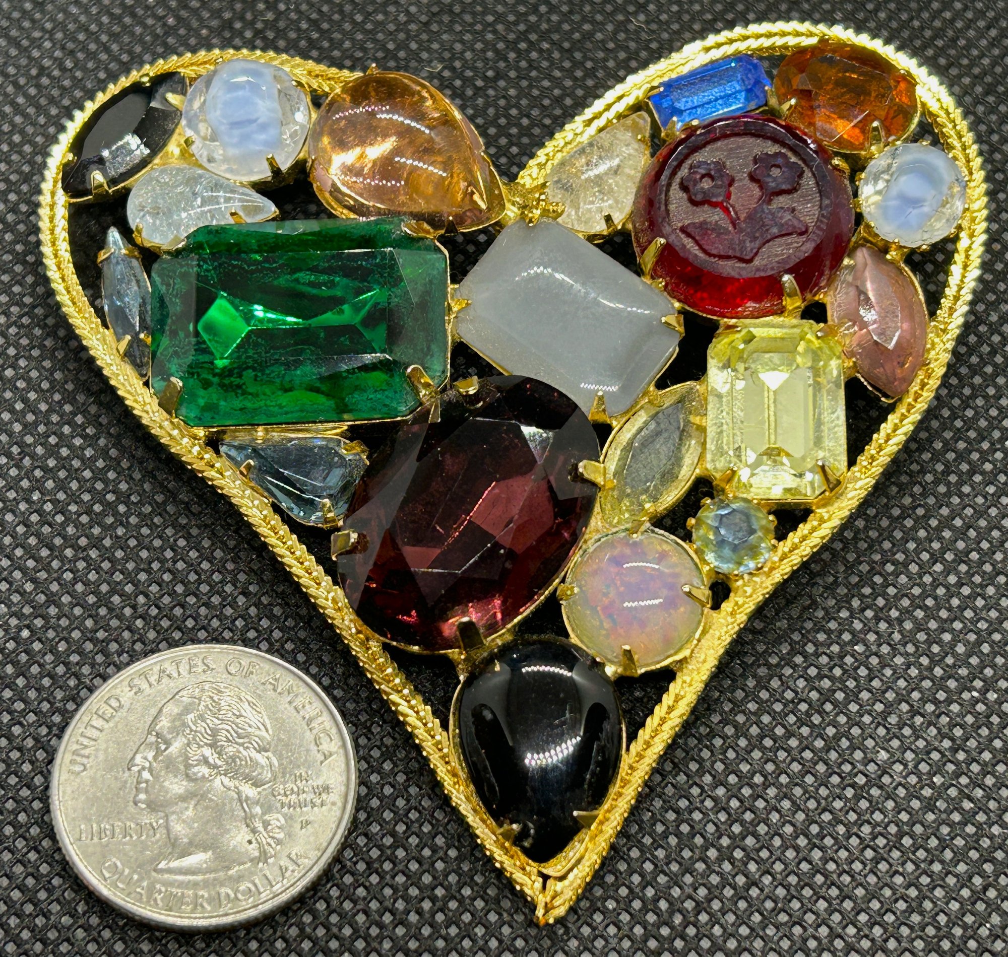 It is quite large, with a myriad of hand-set stones in every color. Most notable is the intaglio carved red stone with blooming flowers. It has good age, likely 1950s/60s. A true statement piece! Condition is very good.