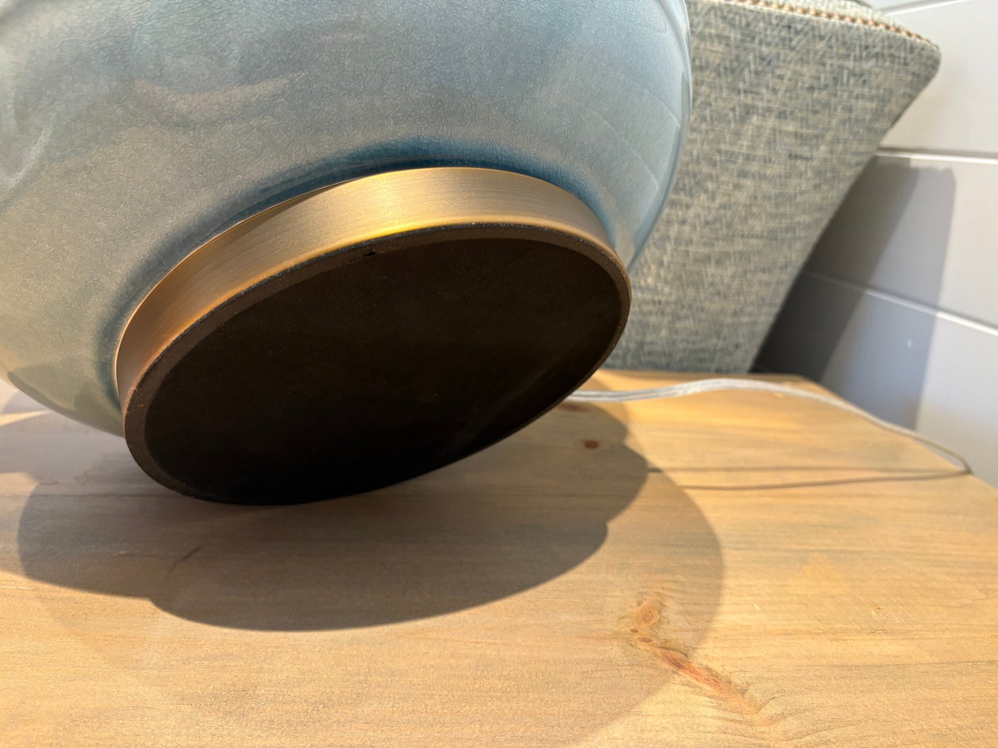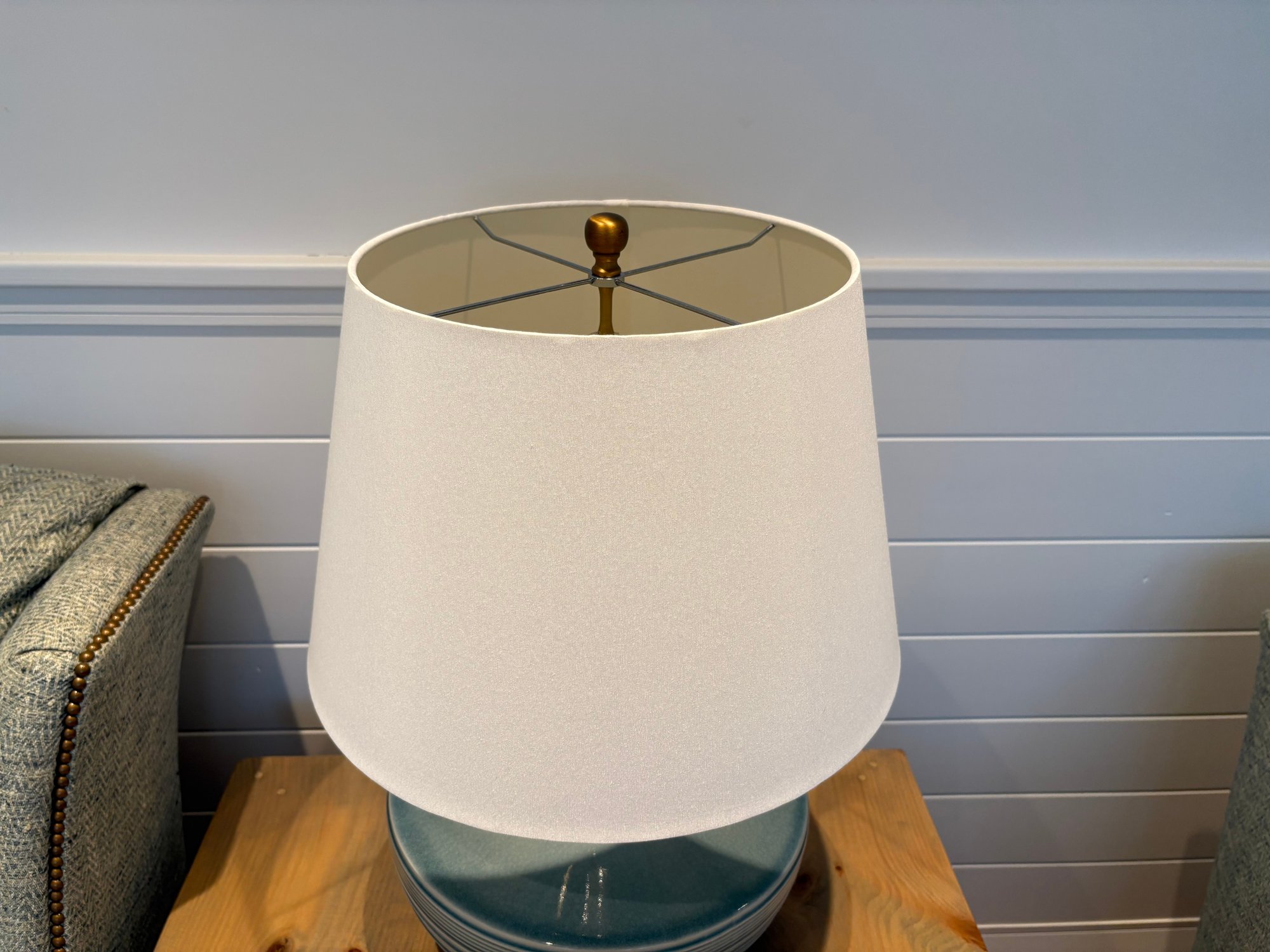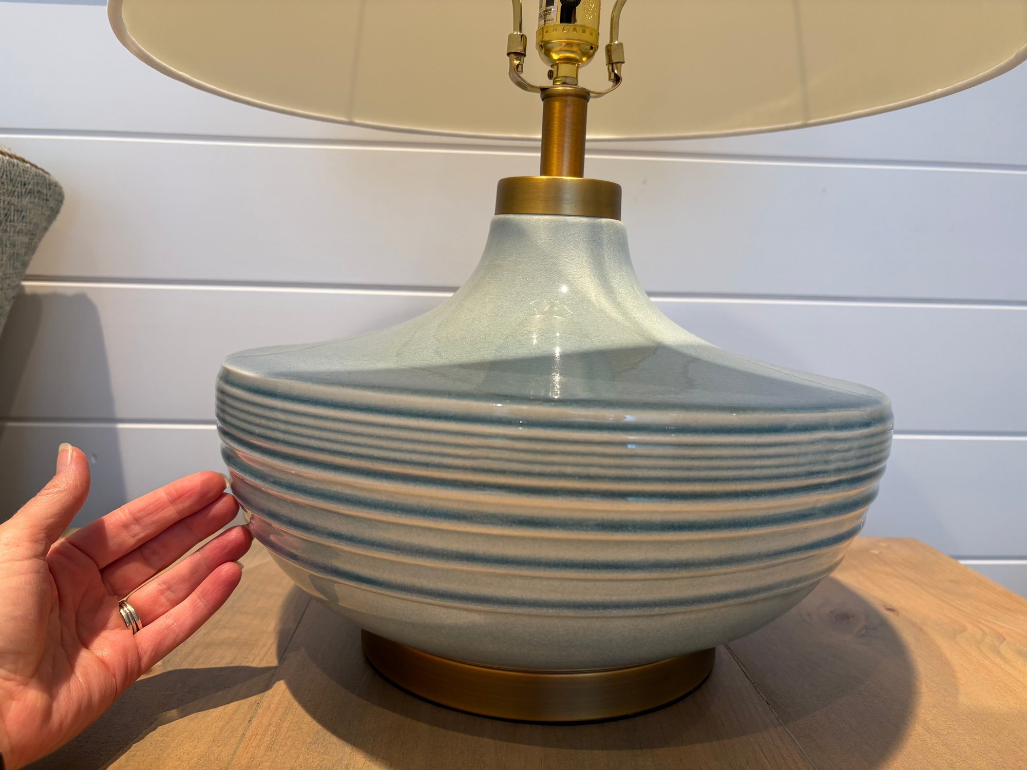 Stunning light blue ceramic table lamp with brass accents and white linen shade.