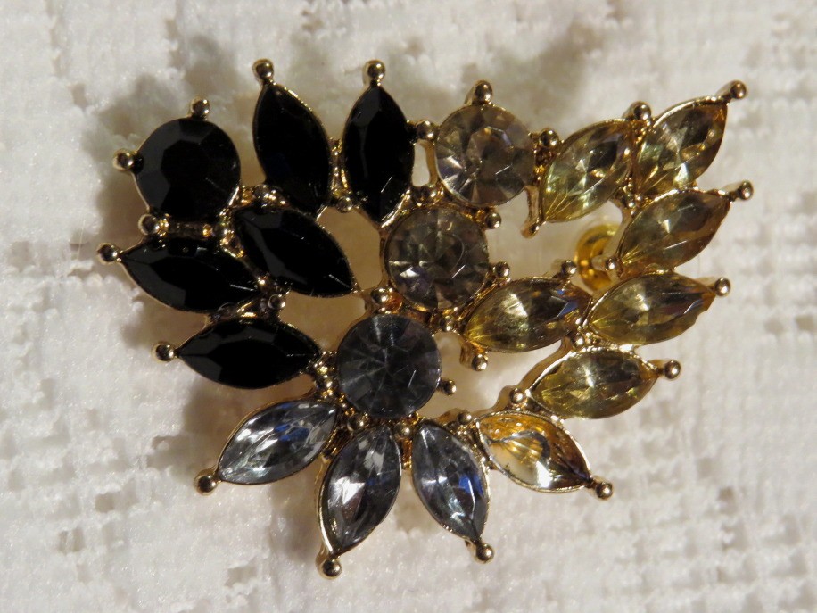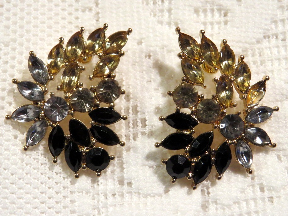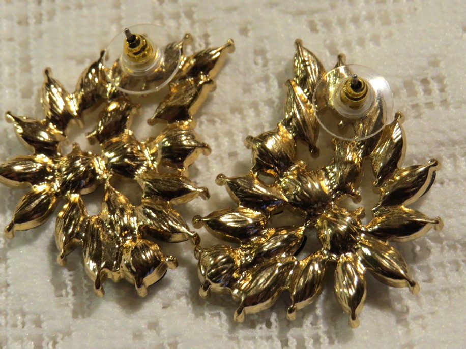 These stunning gold tone stud pierced earrings by 14th & Union, feature marquise cut stones accented with round cut stones in a leaf or floral shape. Measure 1 1/2" long X 1 1/4" at the widest point. The left earring is missing 1 rhinestone which can be fixed by a jeweler.