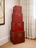 Set of four vintage Chinese lacquered storage boxes in a classic red finish, each fitted with traditional brass hardware. Designed as a nesting set, the boxes fit داخل one another for compact storage while also displaying beautifully when stacked in graduated sizes.