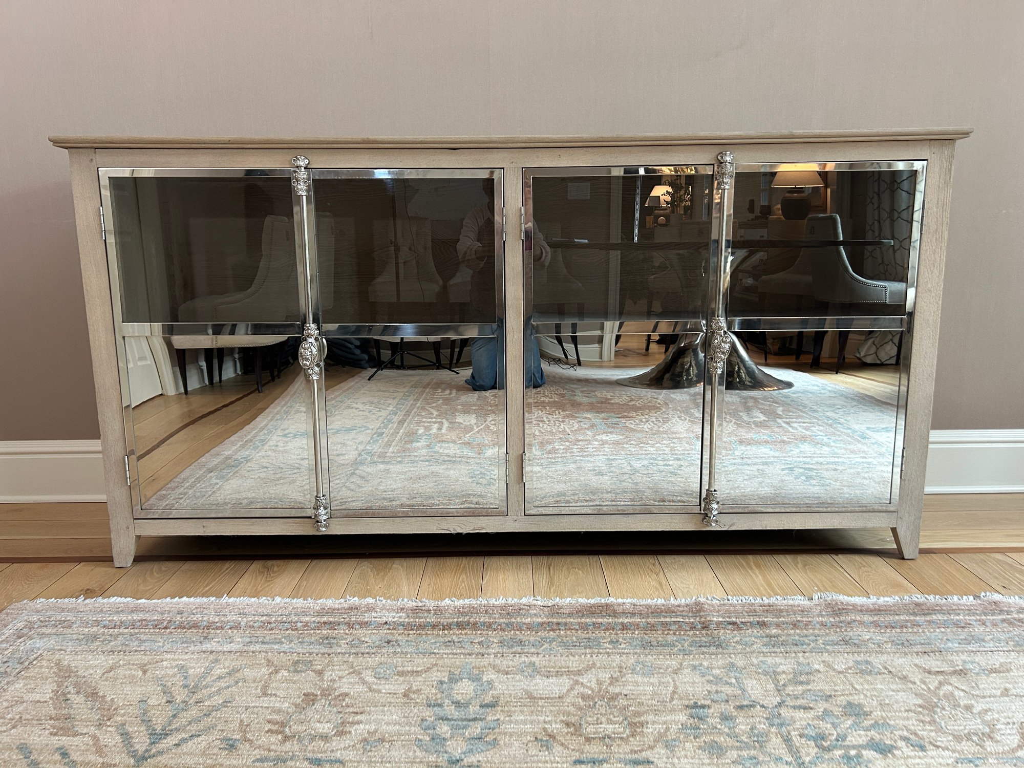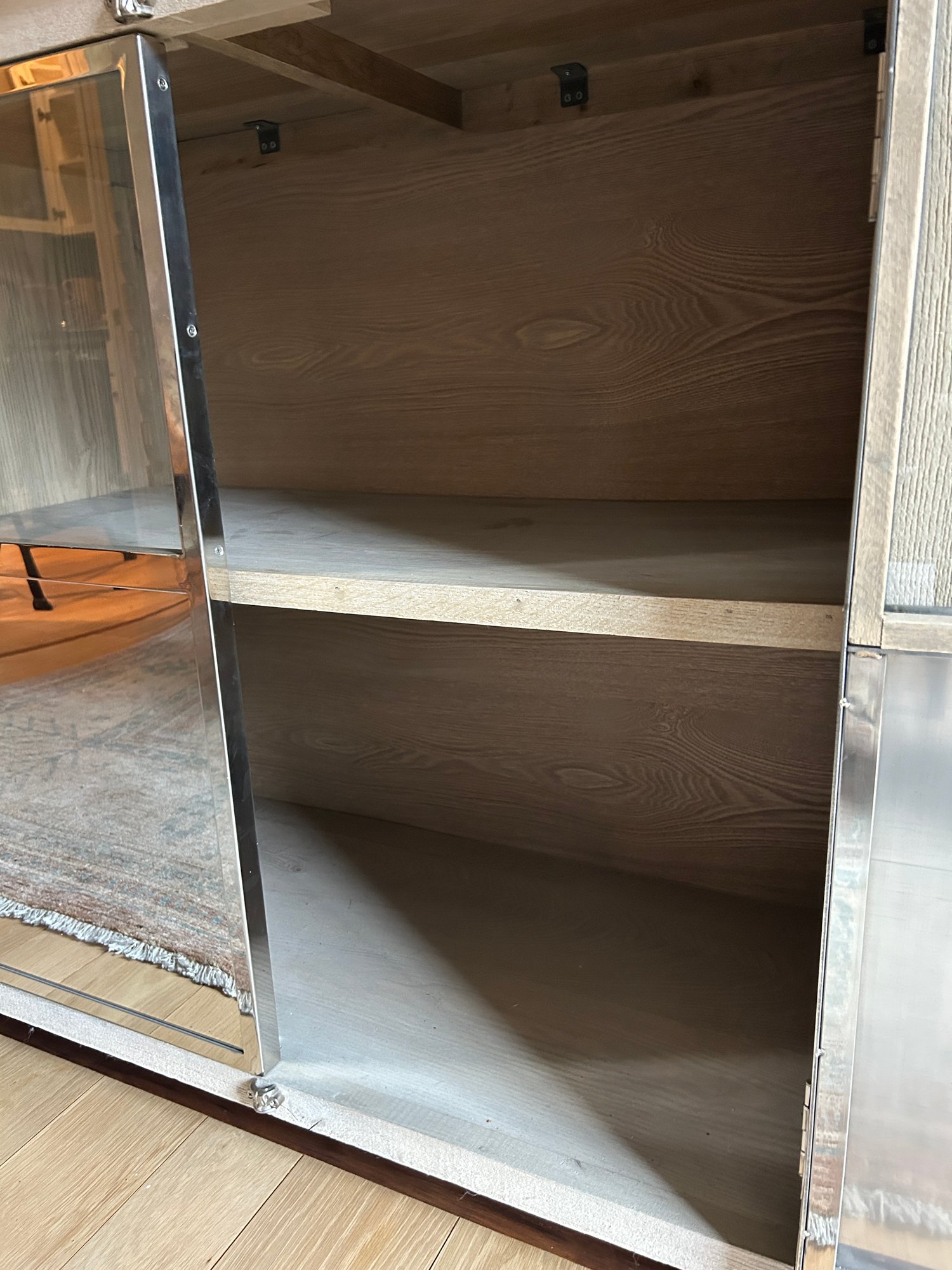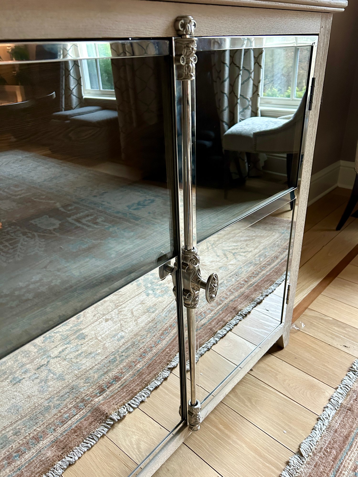 Grey oak with nickel hardware. Each door has a split pane with mirrored glass on bottom and smoked glass on top. Beautiful ombre effect. Adjustable shelves.