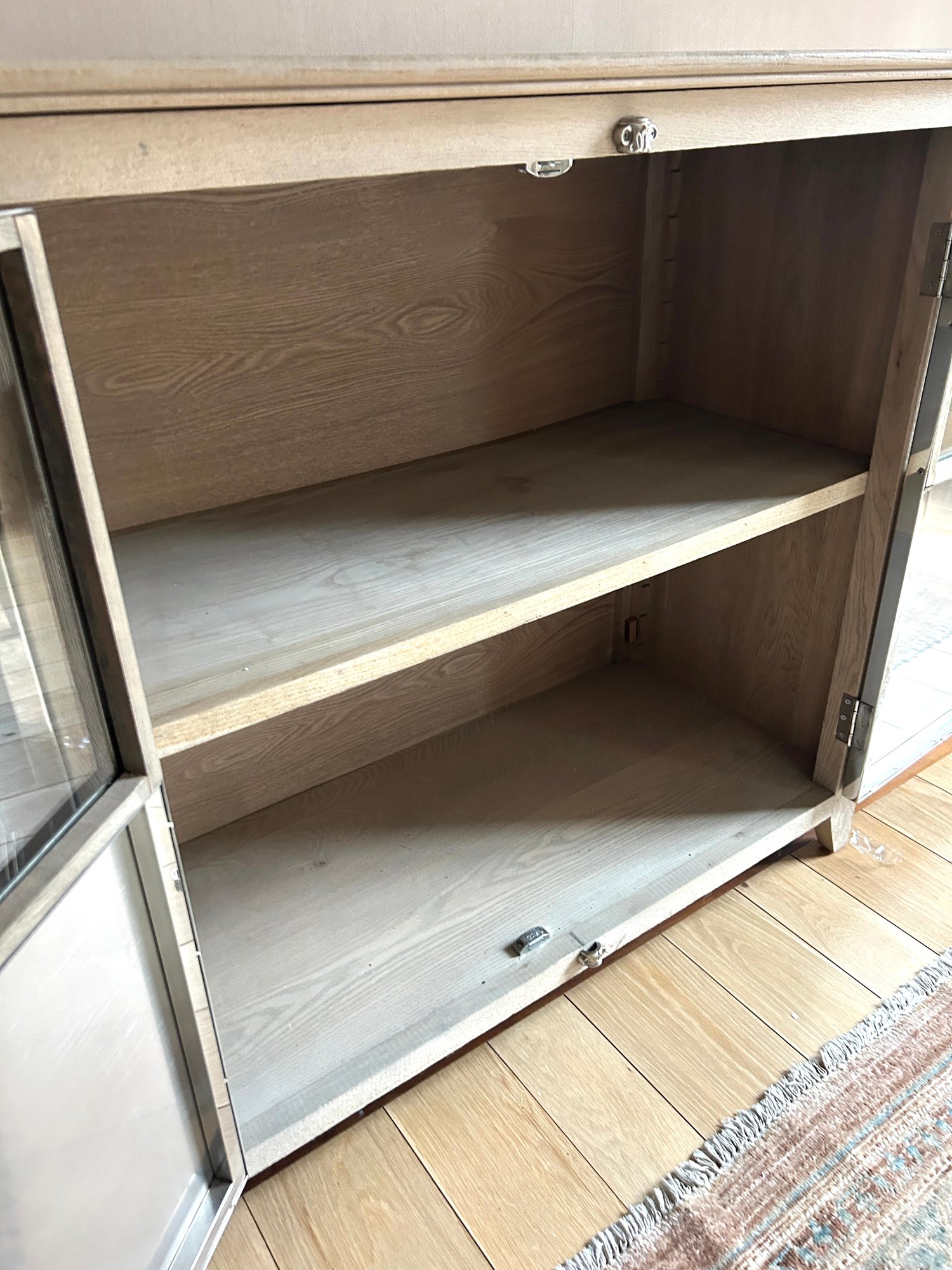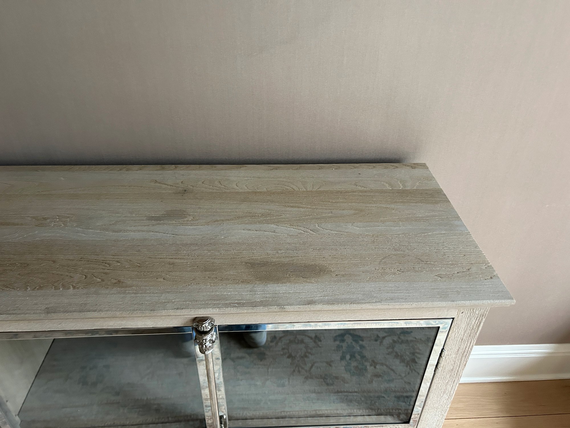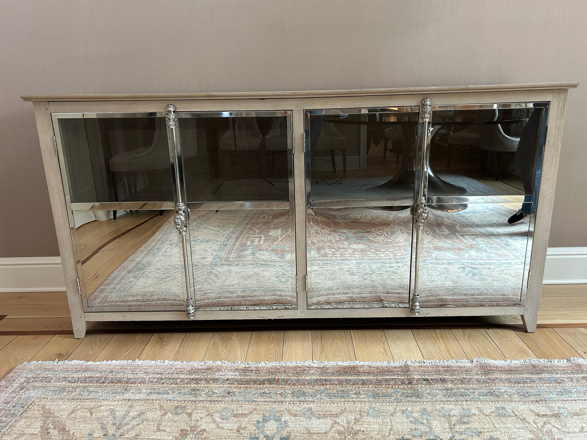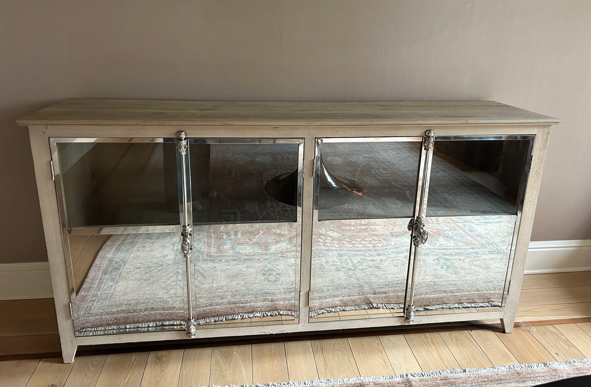 Grey oak with nickel hardware. Each door has a split pane with mirrored glass on bottom and smoked glass on top. Beautiful ombre effect. Adjustable shelves.