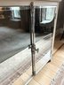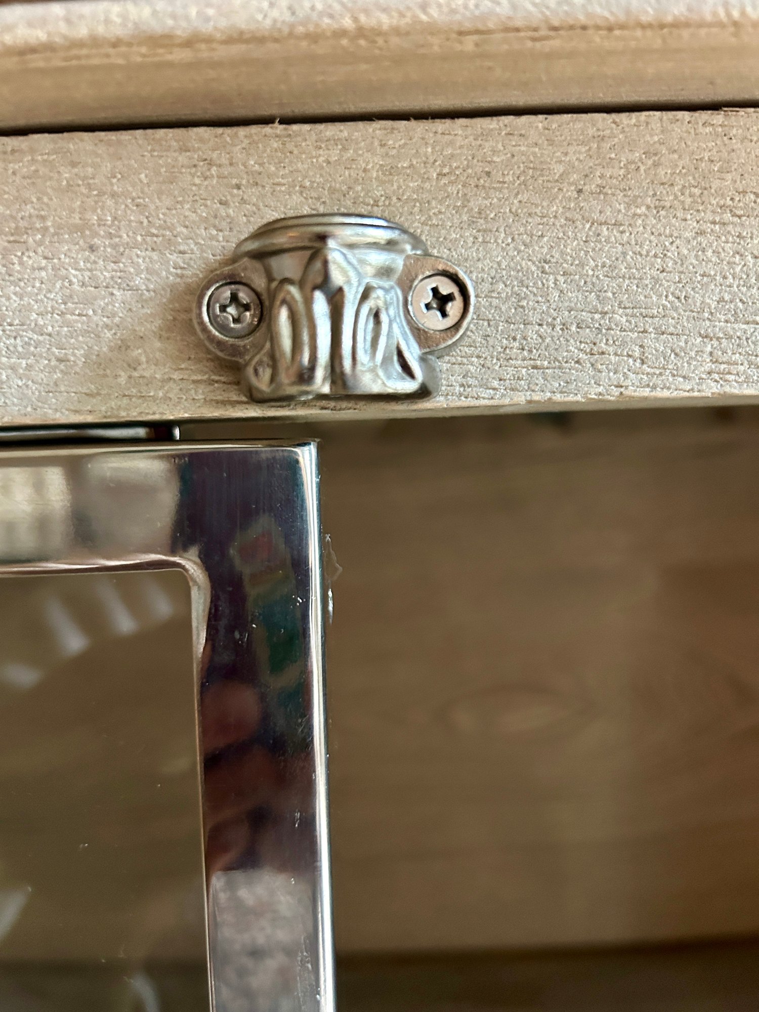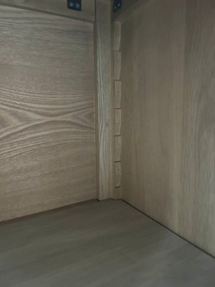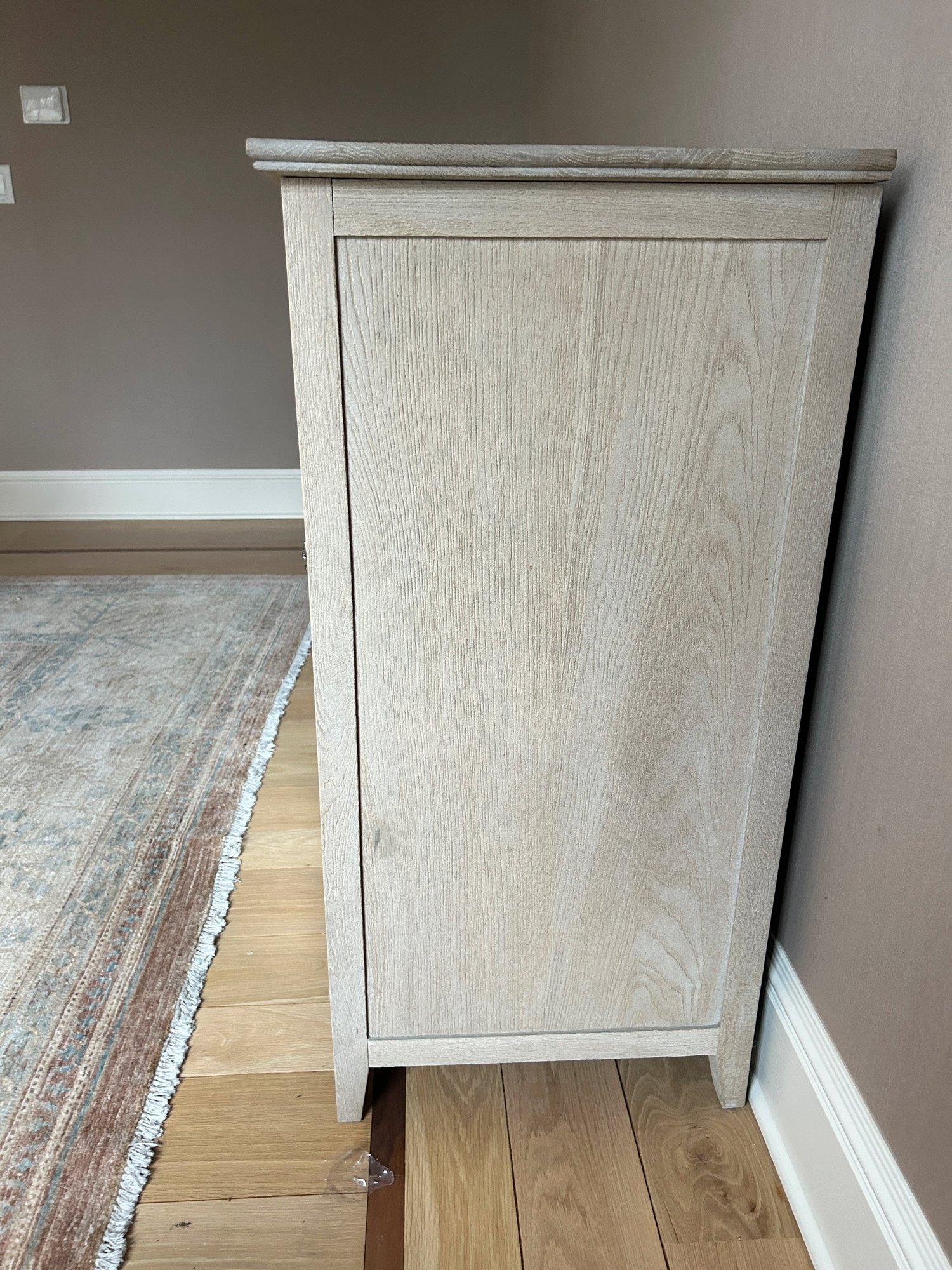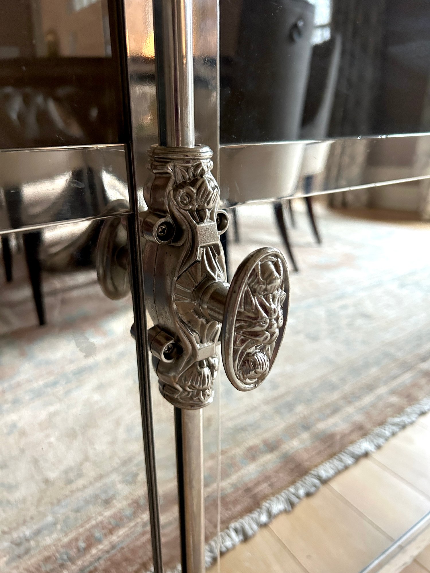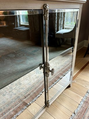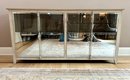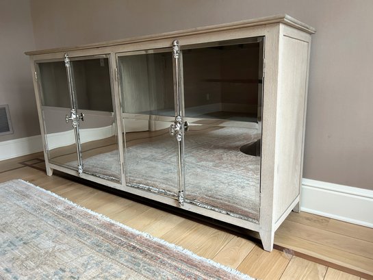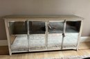 Grey oak with nickel hardware. Each door has a split pane with mirrored glass on bottom and smoked glass on top. Beautiful ombre effect. Adjustable shelves.