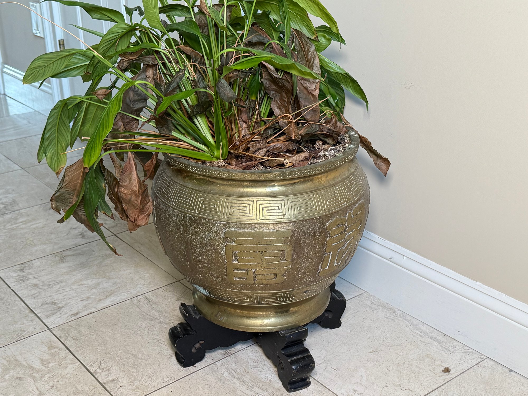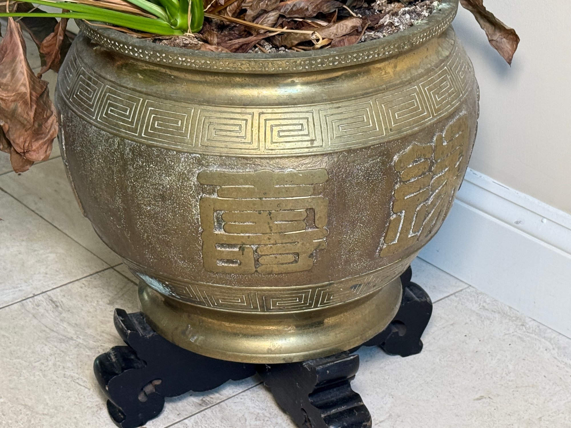 The planter has traditional Chinese motifs including the double happiness symbol. A carved wooden base elevates the planter.
