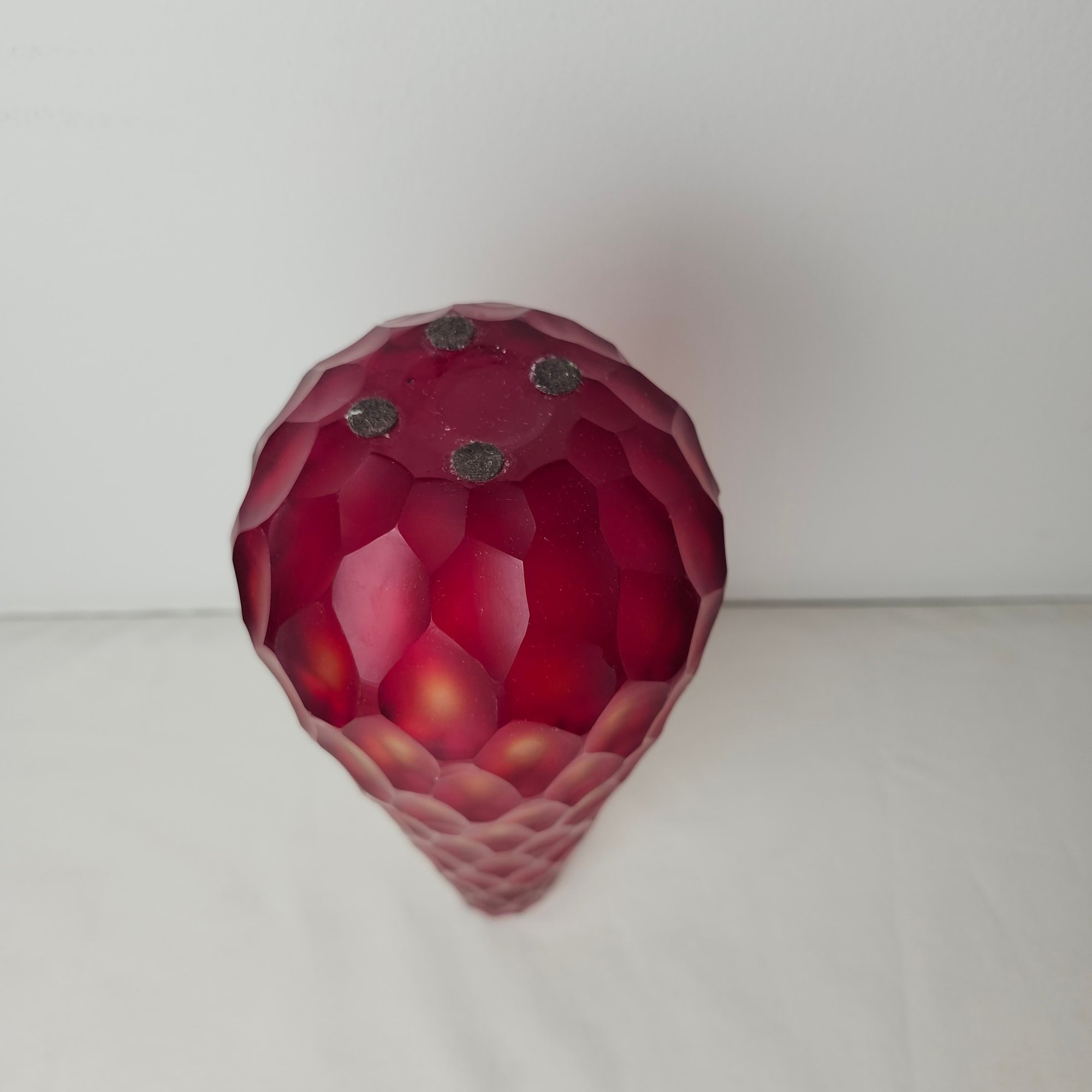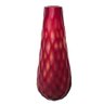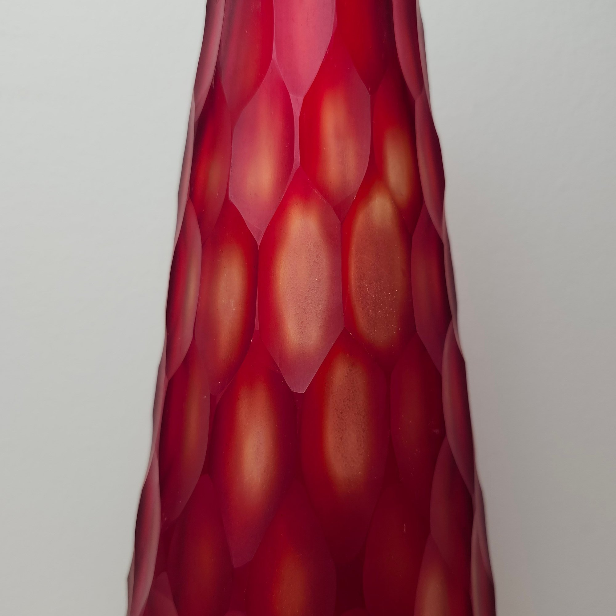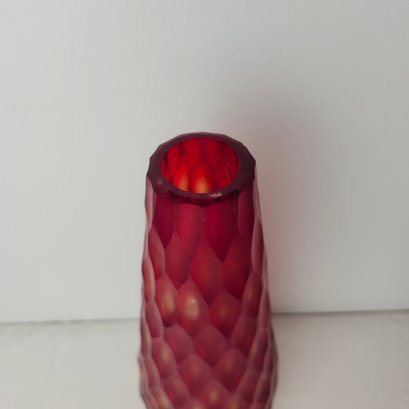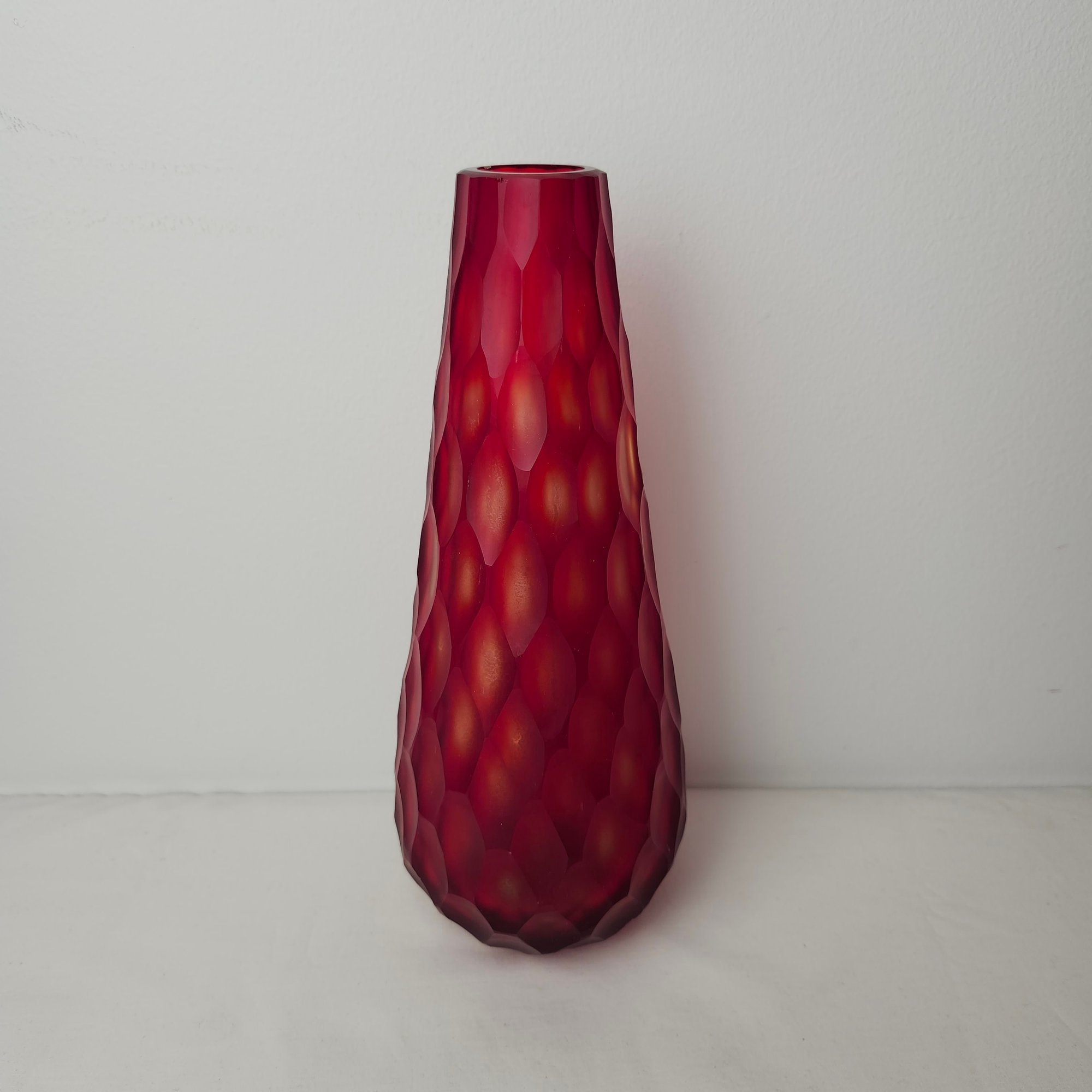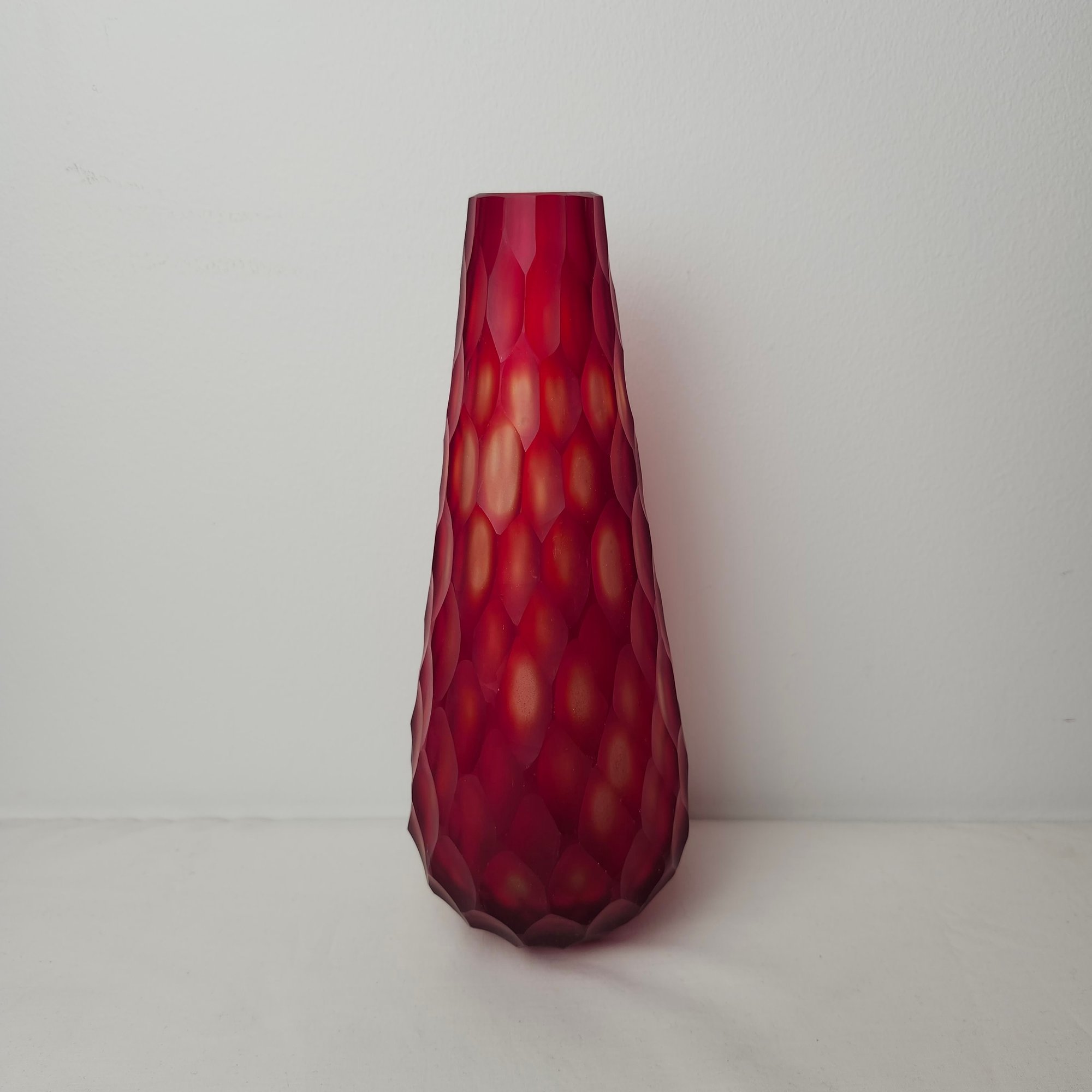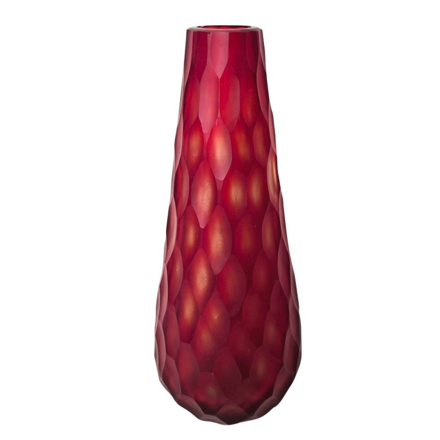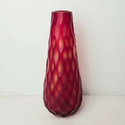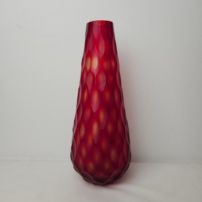 Gorgeous tall red vase with multi faceted exterior. Red satin glass with almost a cut to clear style to the faceted cuts to the exterior.