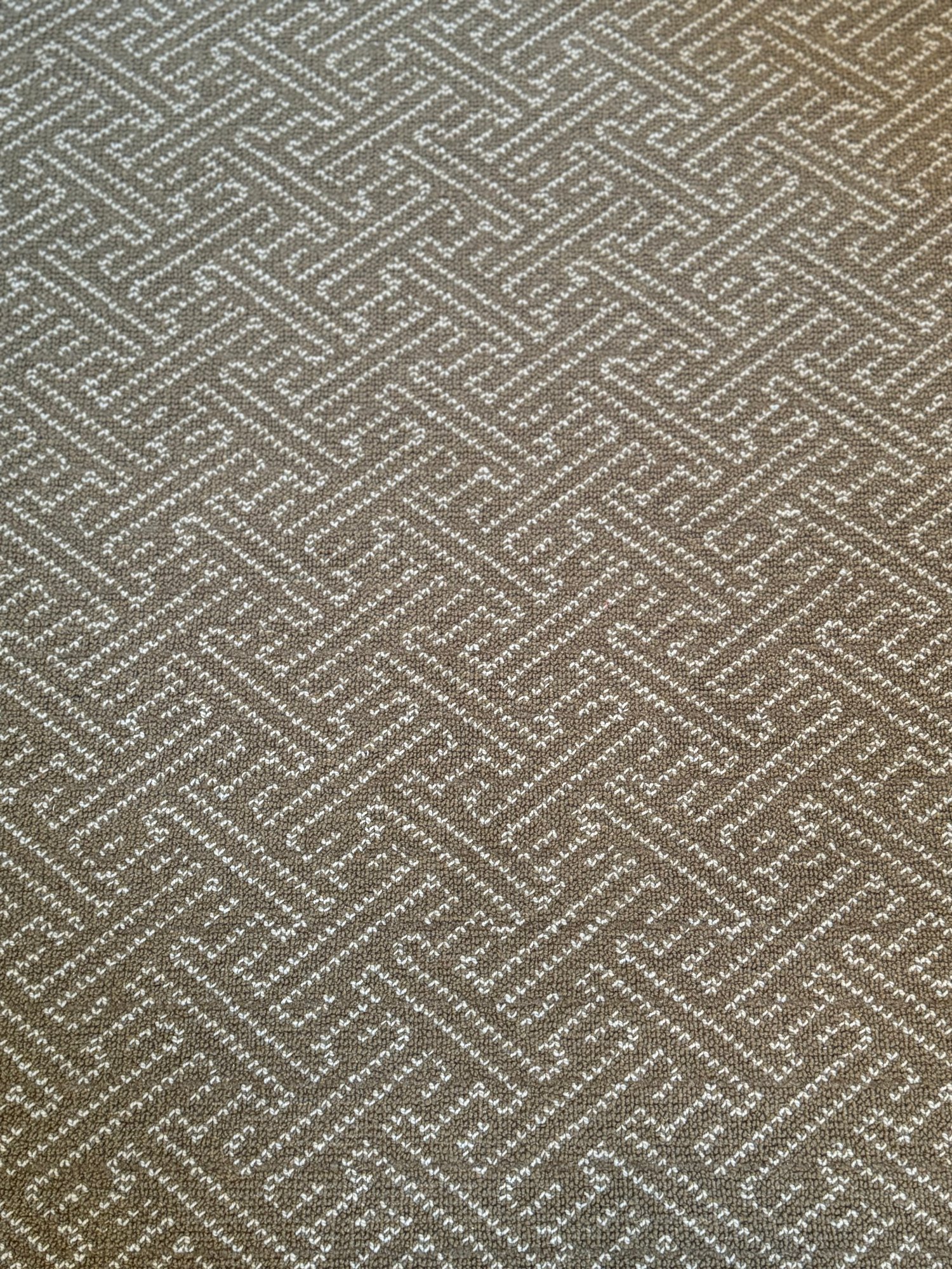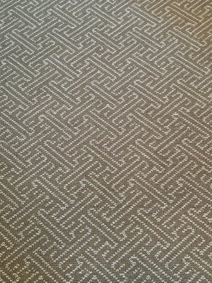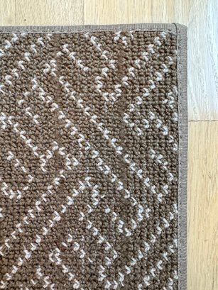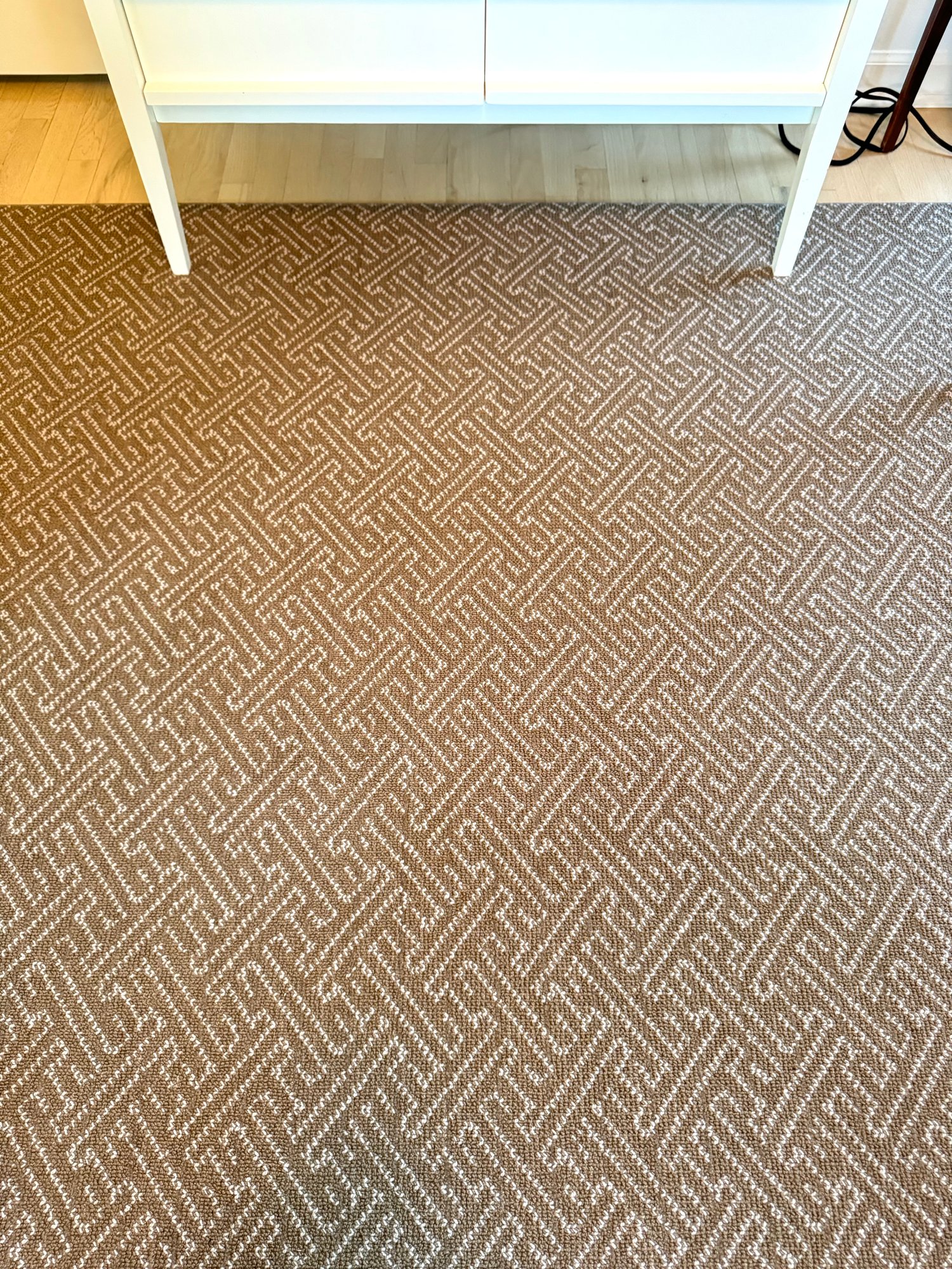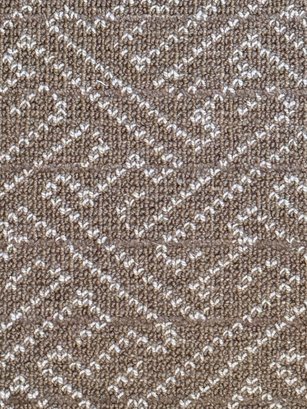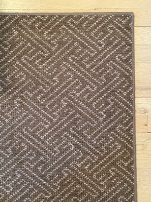 This contemporary styled custom low pile carpet is a lovely light chocolate and creme tone with a patterned geometric design. It in excellent condition - perfect for small bedrooms or home office. Stylishly simple! Size 9'3" x 9'8"