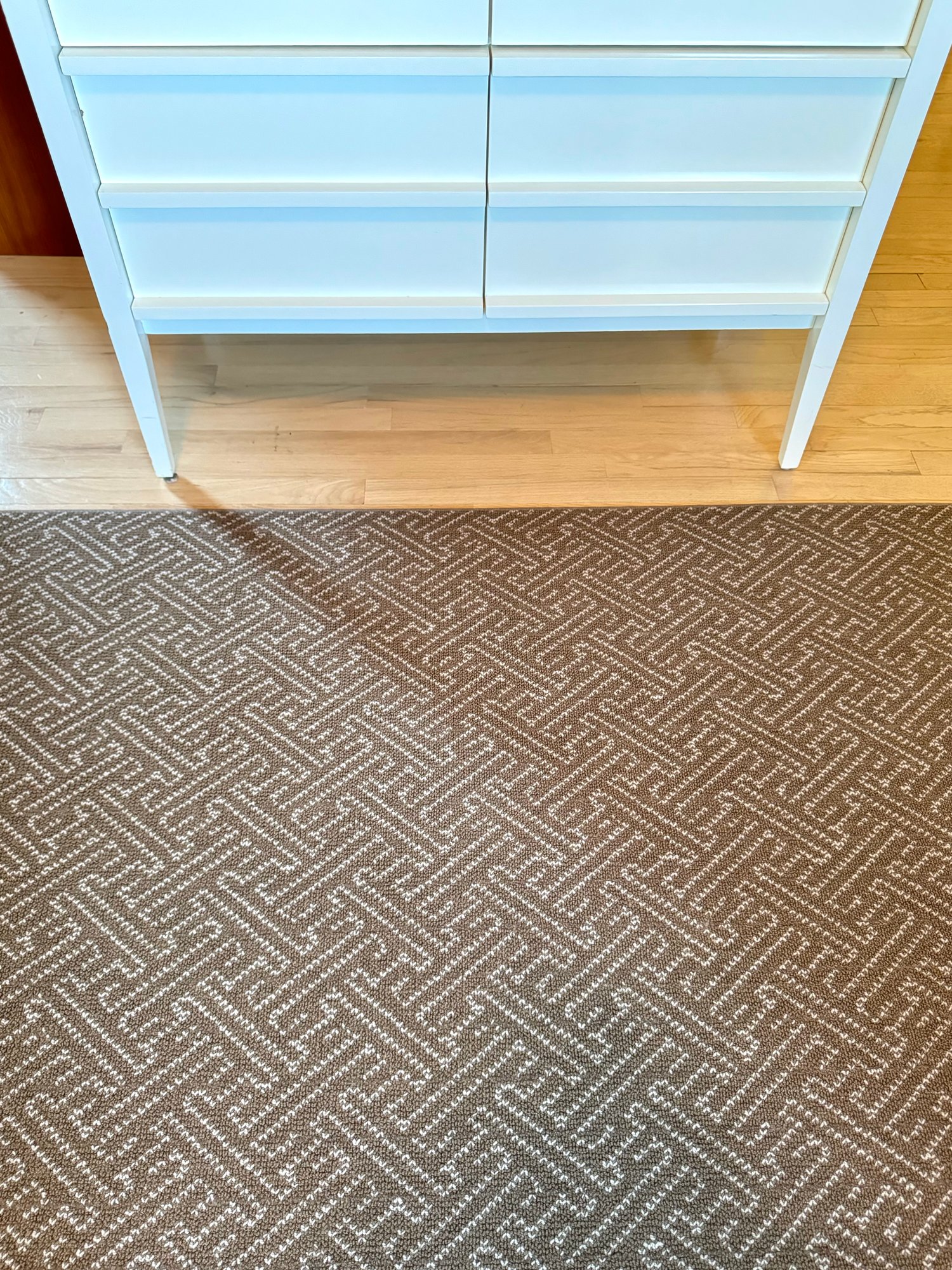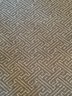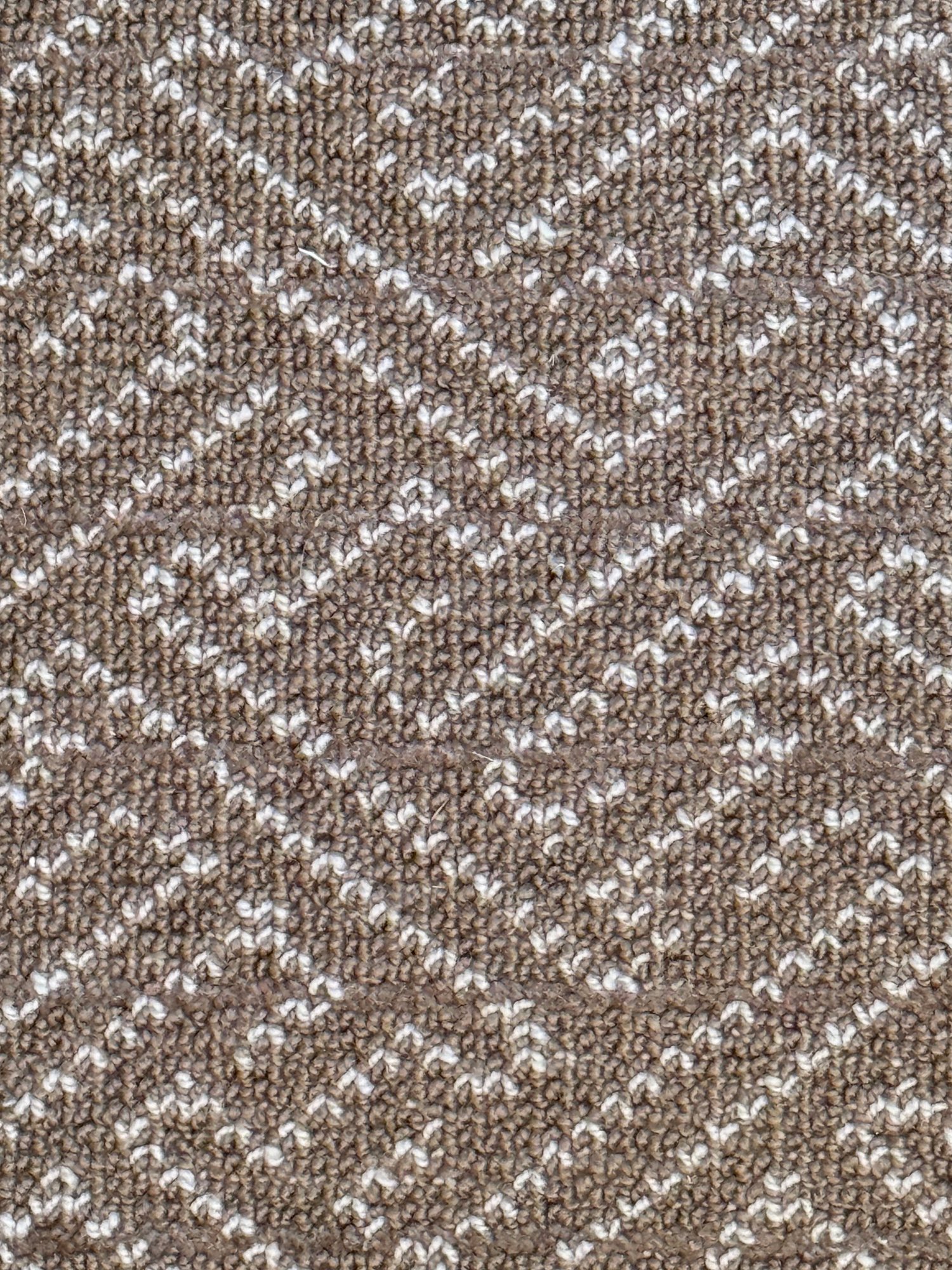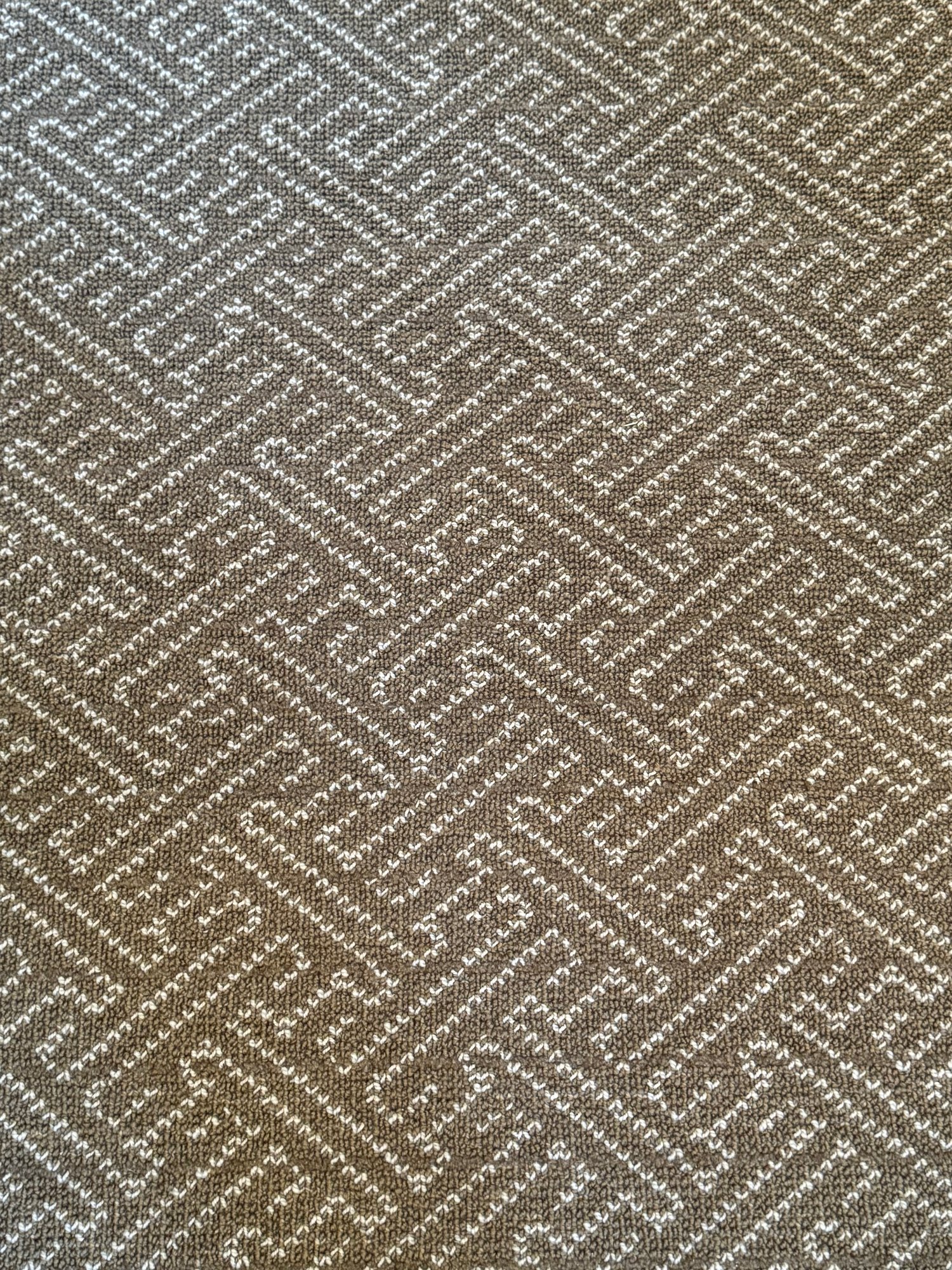 This contemporary styled custom low pile carpet is a lovely light chocolate and creme tone with a patterned geometric design. It in excellent condition - perfect for small bedrooms or home office. Stylishly simple! Size 9'3" x 9'8"
