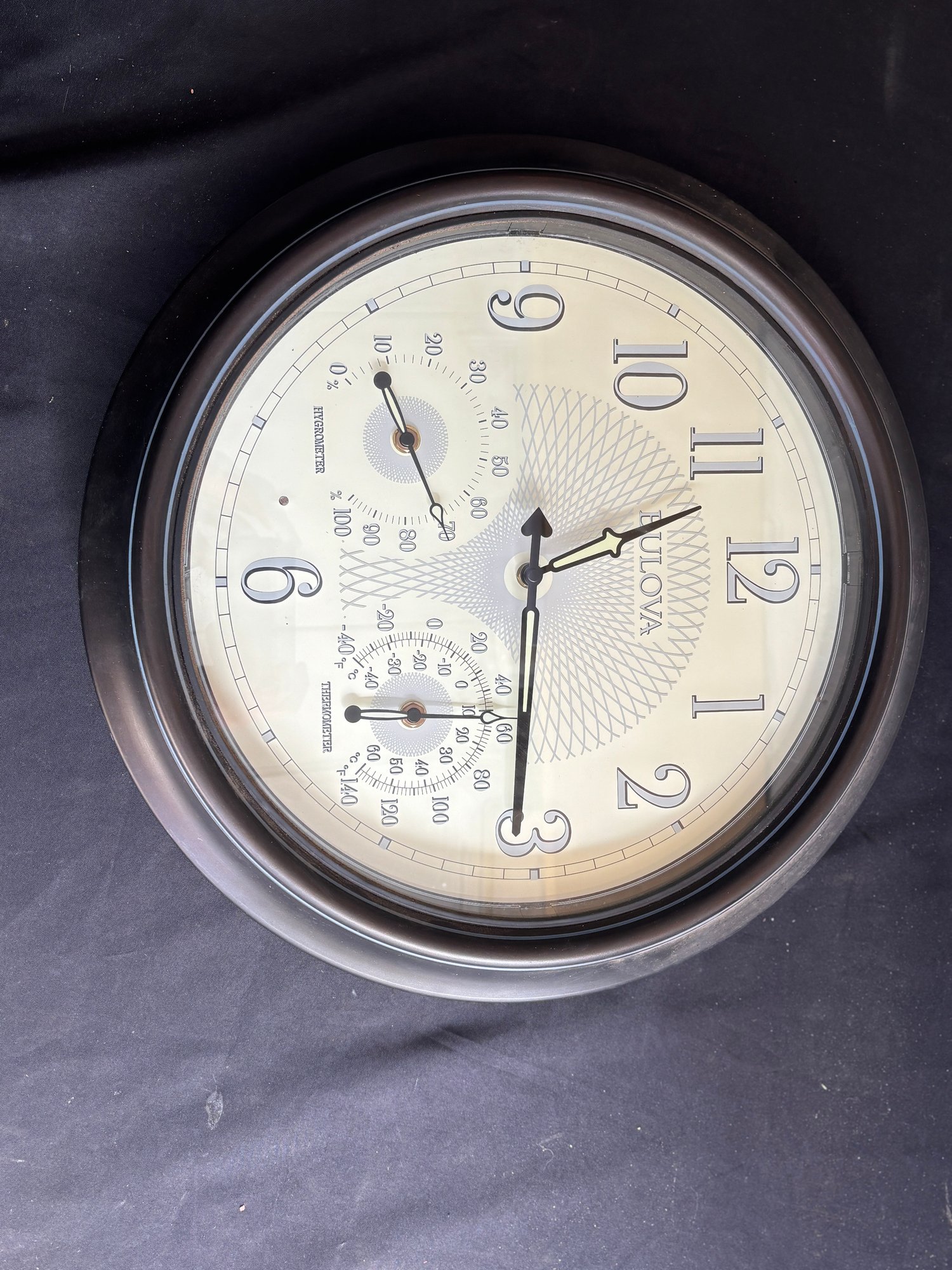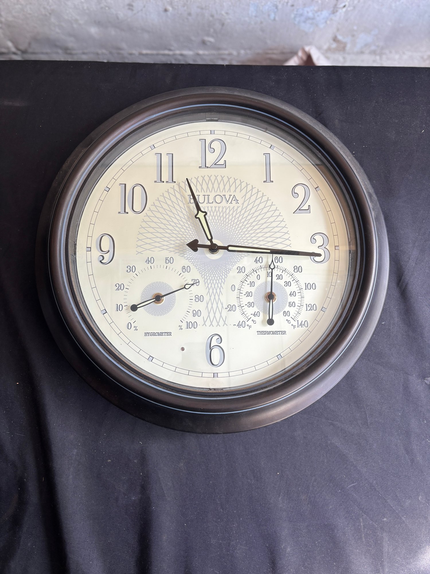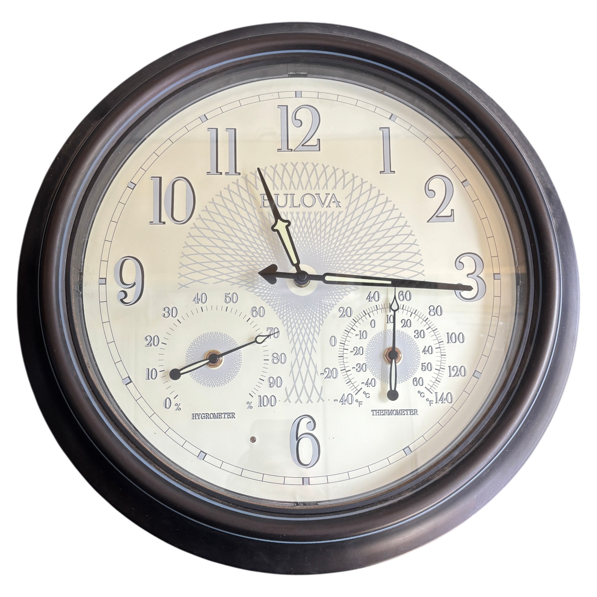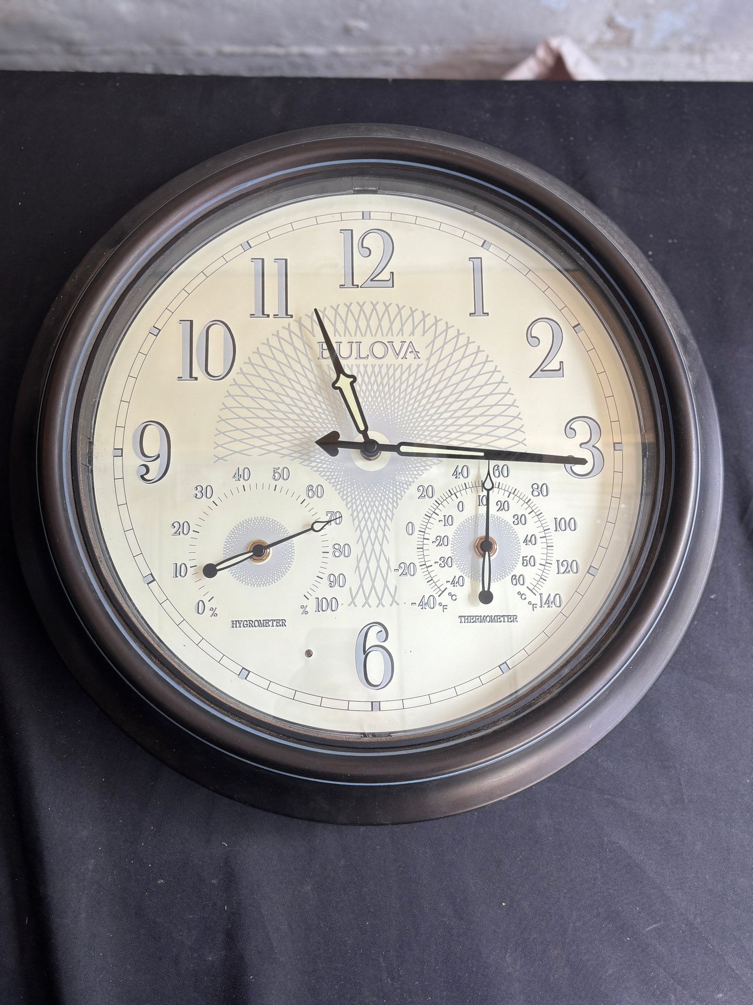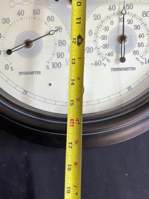 Substantial 17" Bulova wall clock featuring integrated hygrometer and thermometer dials below the main time display.
