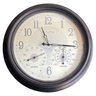 Classic cream dial with large Arabic numerals, decorative center pattern, and bronze-tone frame. The lower gauges measure humidity and temperature (°F/°C), making this both functional and decorative.