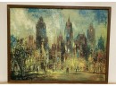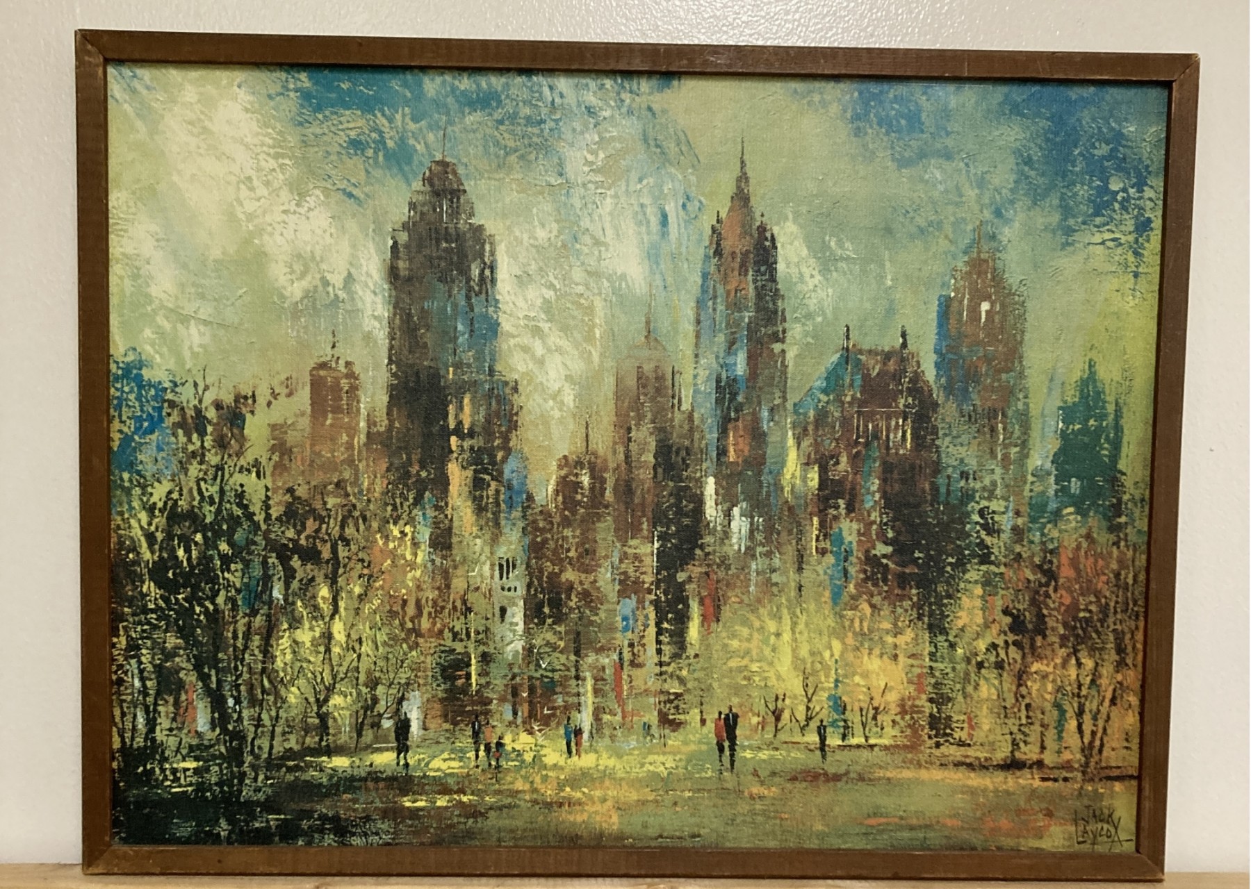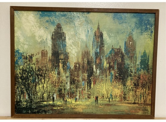 Jack Laycox, American, 1921 to 1984, high quality art print titled Sunday Afternoon and depicting a Modernist city scape in vibrant hues