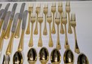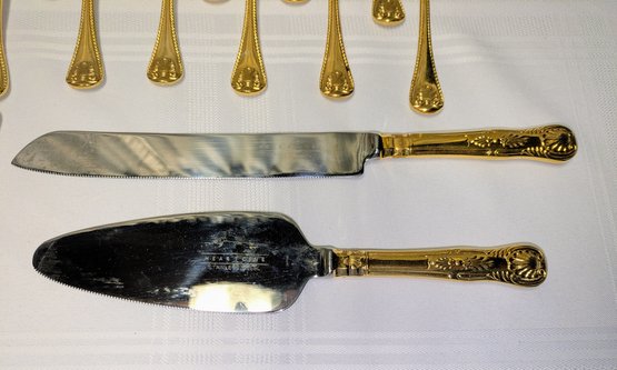 Supreme Cutlery by Towle gold electroplated stainless Service for 12 flatware set + 3 Add'l. Pieces, Japan. Stunning Detail and Design. This set is elegant and sleek and would look stunning with any table setting. Some light marks, conistent with age and use. Overall. Excellent/Very Good Condition. Please see all photos as part of the description and condition.